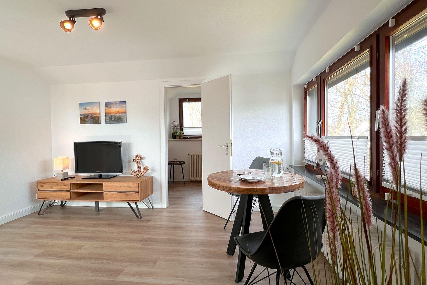 Die Wohnung Nr. 3 im Obergeschoss bietet auf ca. 40 m² ausreichend Platz für einen erholsamen Urlaub an der Ostsee. Der Wohnbereich ist offen gestaltet und mit einem gemütlichen Sofa, einem Esstisch sowie einer gut ausgestatteten Küchenzeile komfortabel eingerichtet.