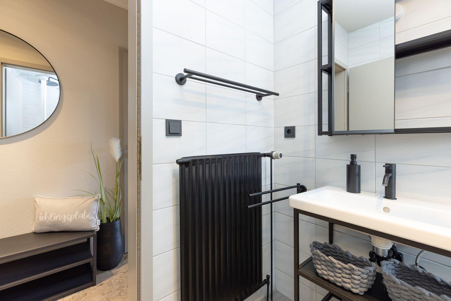 Das Badezimmer ist mit Duschkabine und hellen Fliesen gestaltet. Die sonnige Terrasse der Wohnung ist nach Süd-Westen ausgerichtet und zusätzlich ist der Garten gemeinschaftlich zu nutzen.