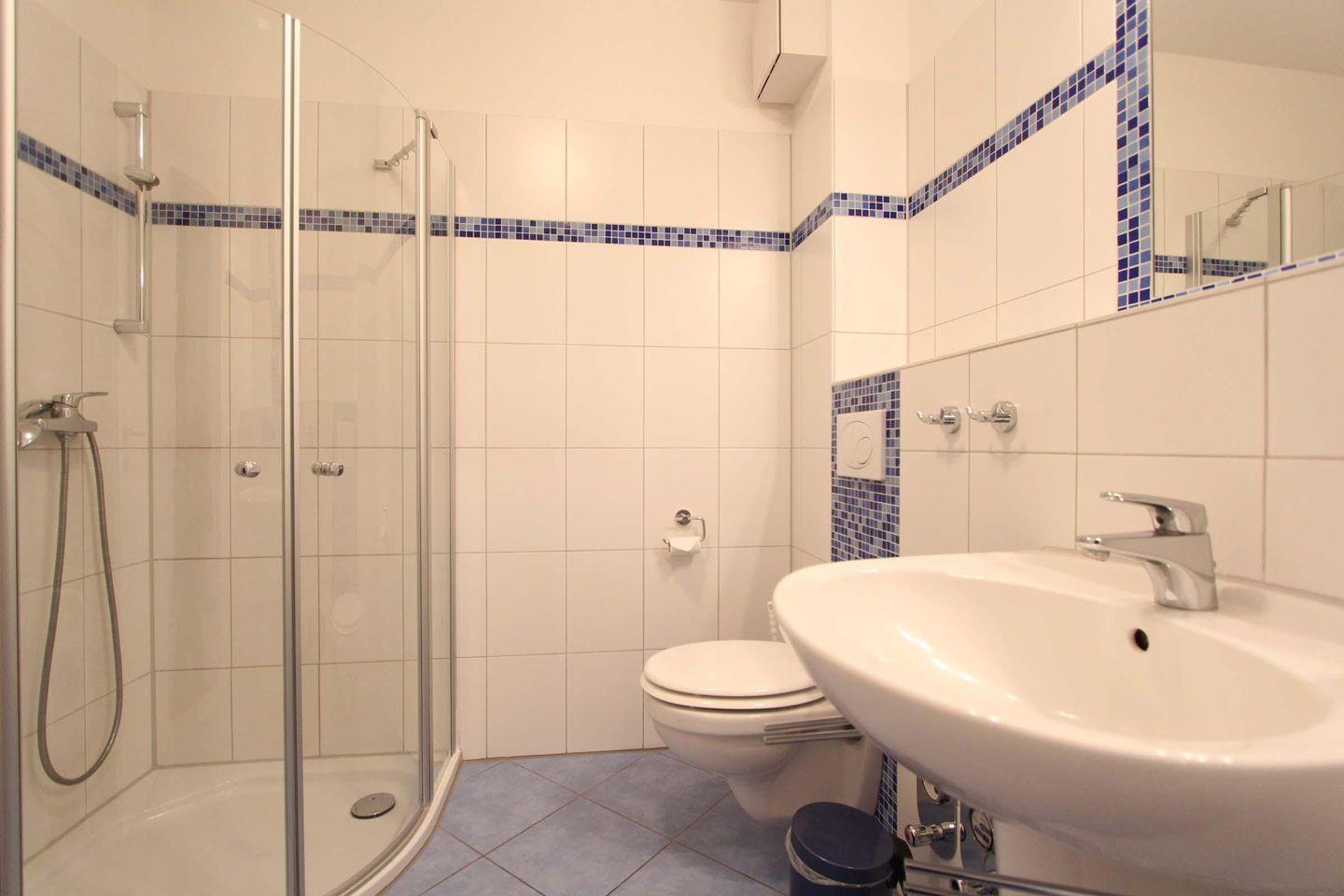 Das geräumige Badezimmer bietet eine großzügige Dusche und viel Abstellplatz für Pflegeprodukte und Sonnencreme.
