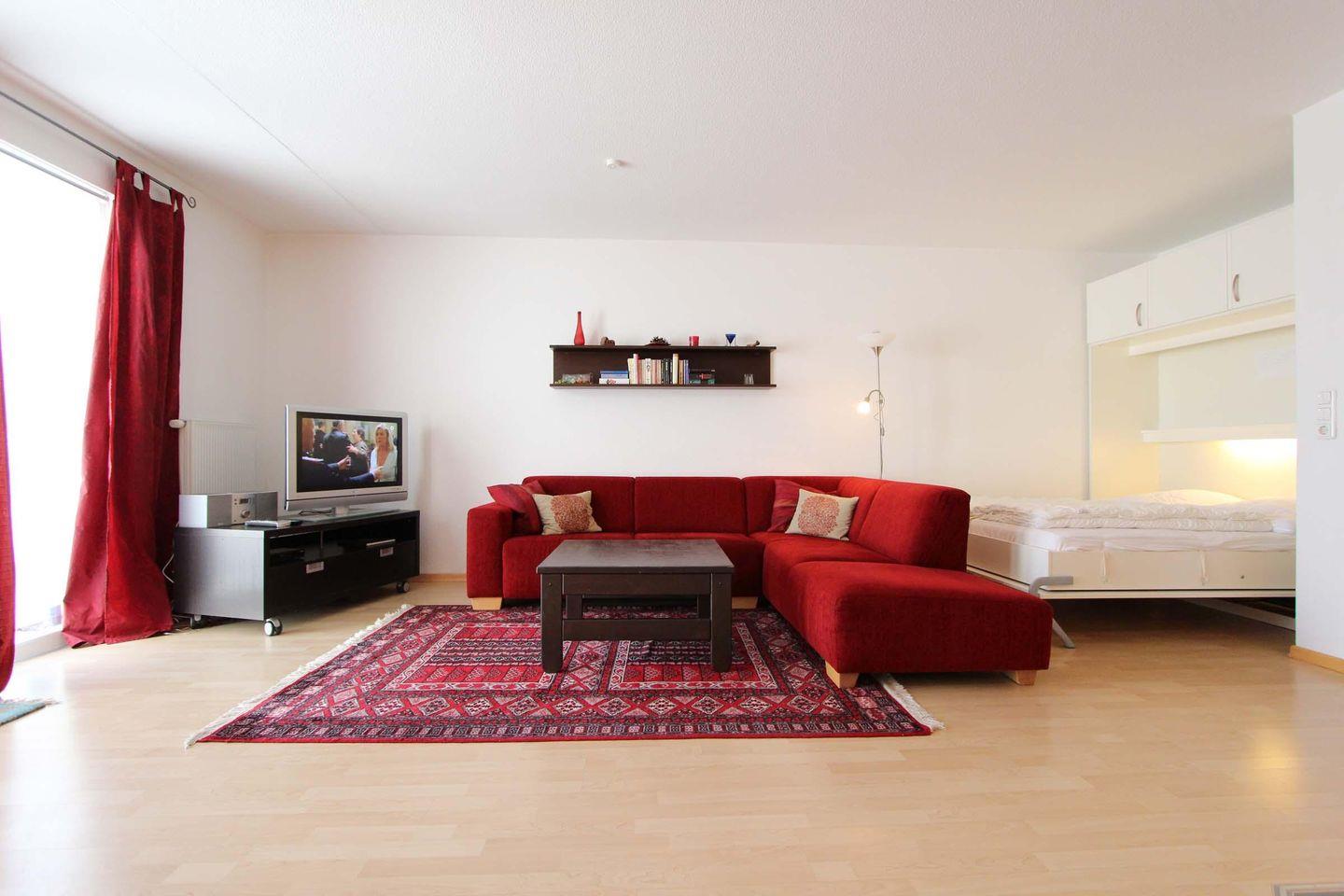 Der Wohnbereich verfügt über eine große, gemütliche Eckcouch mit Fernseher und einen Essbereich für genüssliche Mahlzeiten und ein Schrankklappbett (2 Matratzen á 0,80x2,00m) für zwei Personen.