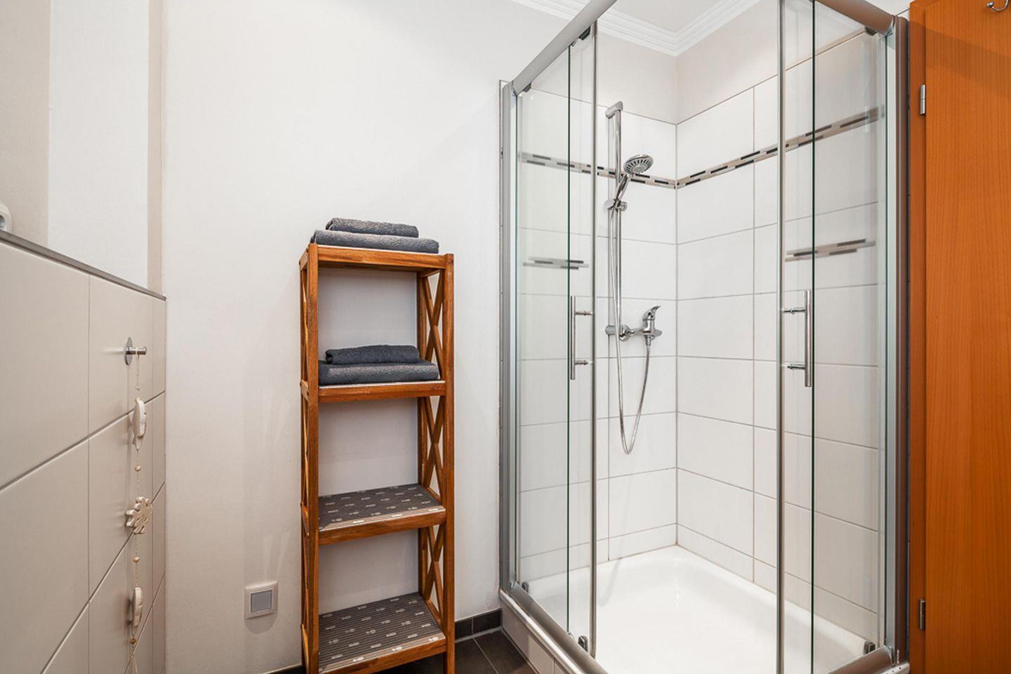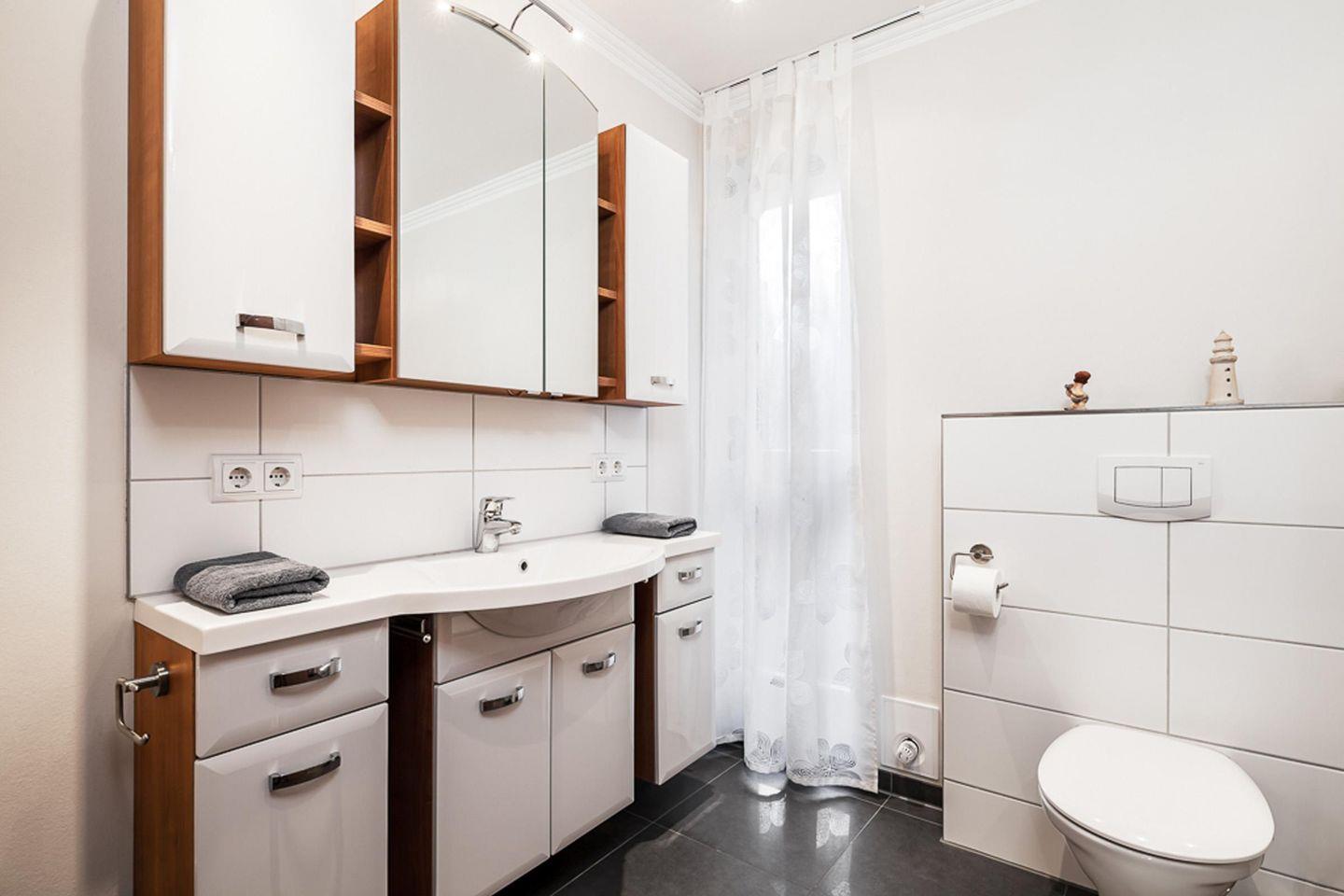 Im freundlichen, hellen und modernen Badezimmer findet man neben den üblichen Sanitäranlagen, wie der Toilette, dem Waschbecken und der Duschkabine, auch ein separates Urinal.