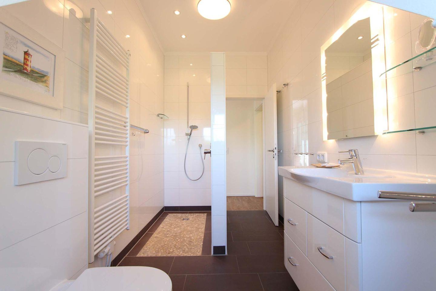 Das moderne Tageslichtbad verfügt über eine bodengleiche Dusche, zusätzlich steht ein separates Gäste-WC zur Verfügung – besonders komfortabel bei mehreren Personen.