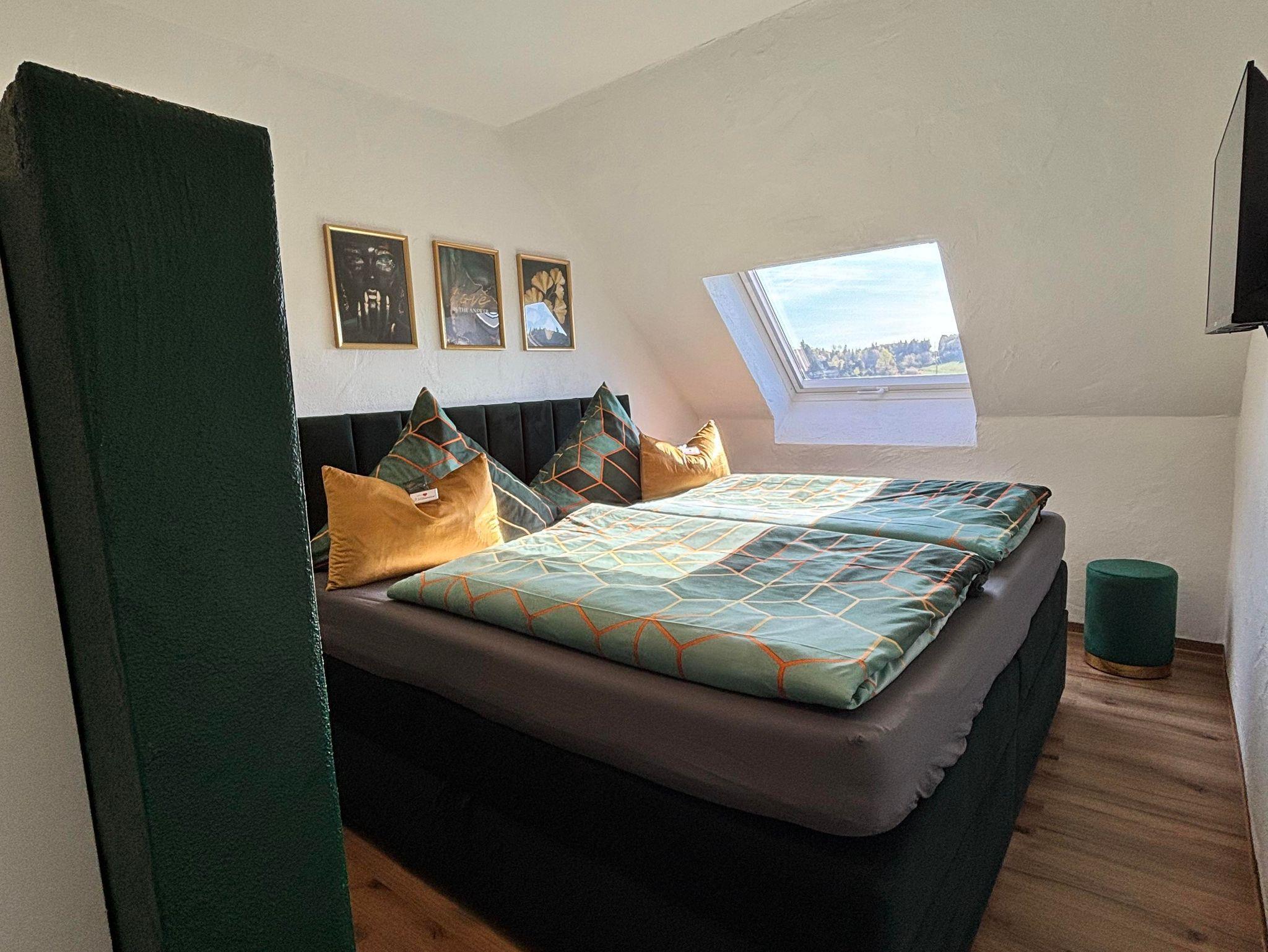 Willkommen im „Big Harmony Room“ – Ihrem privaten Rückzugsort voller Stil, Komfort und zeitloser Eleganz. Auf 16 wohlfühl Quadratmetern im Obergeschoss unserer Pension erwartet Sie ein großzügiges Boxspringbett (2 x 2 Meter), das zum Entspannen und Träumen einlädt; modernste Ausstattung mit Smart-TV sowie ein elegantes Bad mit Dusche und WC. Der Blick aus dem Fenster eröffnet jedem Gast eine ganz eigene, malerische Perspektive auf die umgebende Natur.