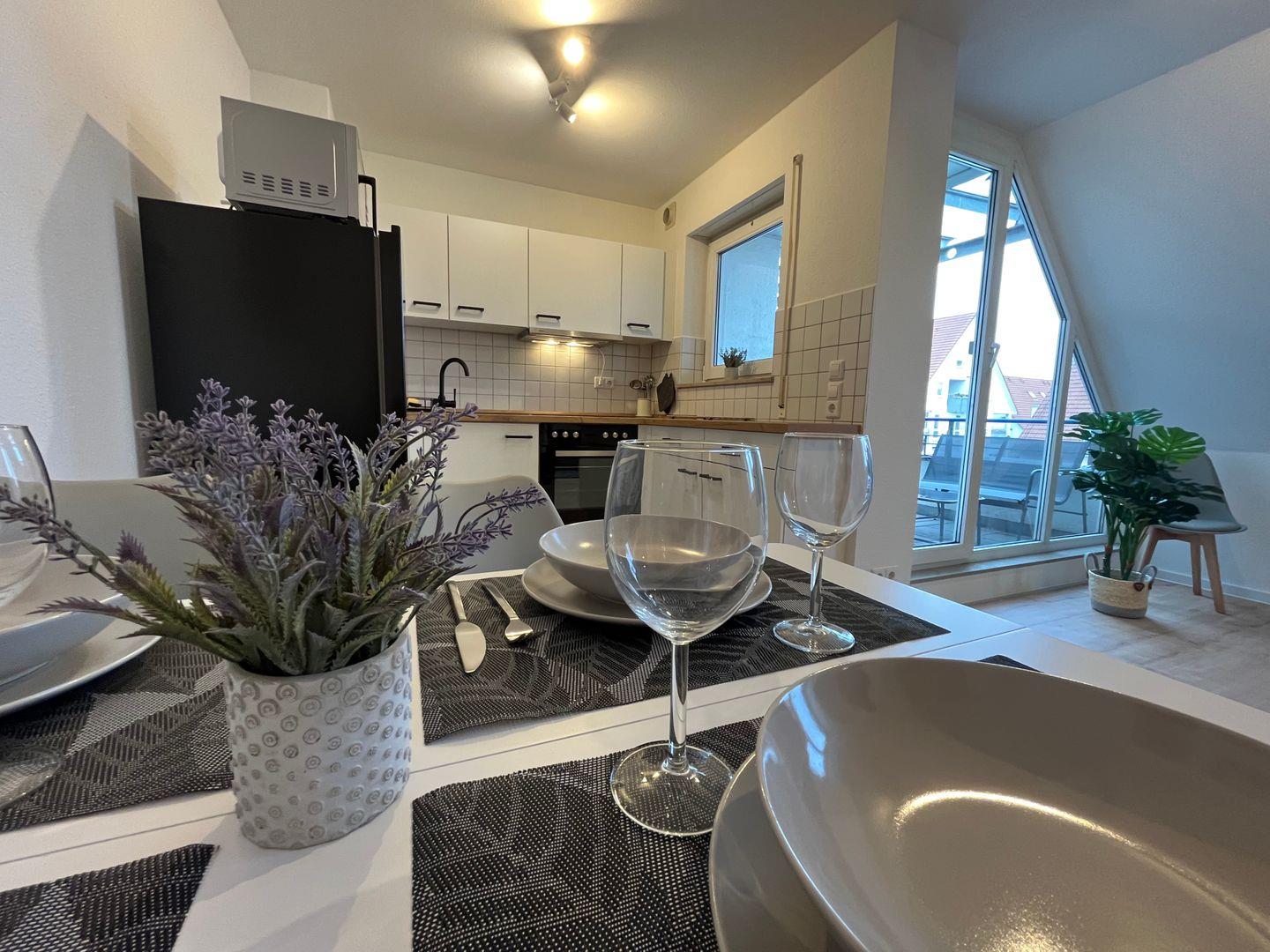 Die offene Küche ist ein wahres Highlight dieser Unterkunft. Sie ist komplett ausgestattet mit einem Cerankochfeld, einem Backofen, einer Mikrowelle und einer Spülmaschine – alles, was Sie zum Zubereiten köstlicher Mahlzeiten benötigen. Eine Kaffeemaschine, ein Wasserkocher, ein Toaster sowie ausreichend Geschirr und Besteck sind ebenfalls vorhanden. So können Sie auch im Urlaub das Kochen zu einem Vergnügen machen!