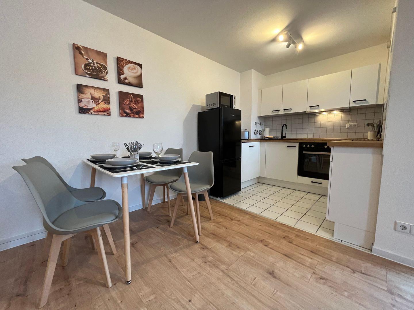 Die Wohnung ist äußerst modern und geschmackvoll eingerichtet. Sie betreten einen hellen und einladenden Wohnbereich, der mit einem hochwertigen Laminatboden ausgestattet ist. Hier finden Sie nicht nur eine gemütliche Sofaecke zum Entspannen, sondern auch einen Essbereich, an dem Sie gemeinsam genießen können. Der große Fernseher sorgt für Unterhaltung an gemütlichen Abenden mit internationalen Kanälen. Dank des schnellen WLAN-Zugangs bleiben Sie auch im Urlaub vernetzt.