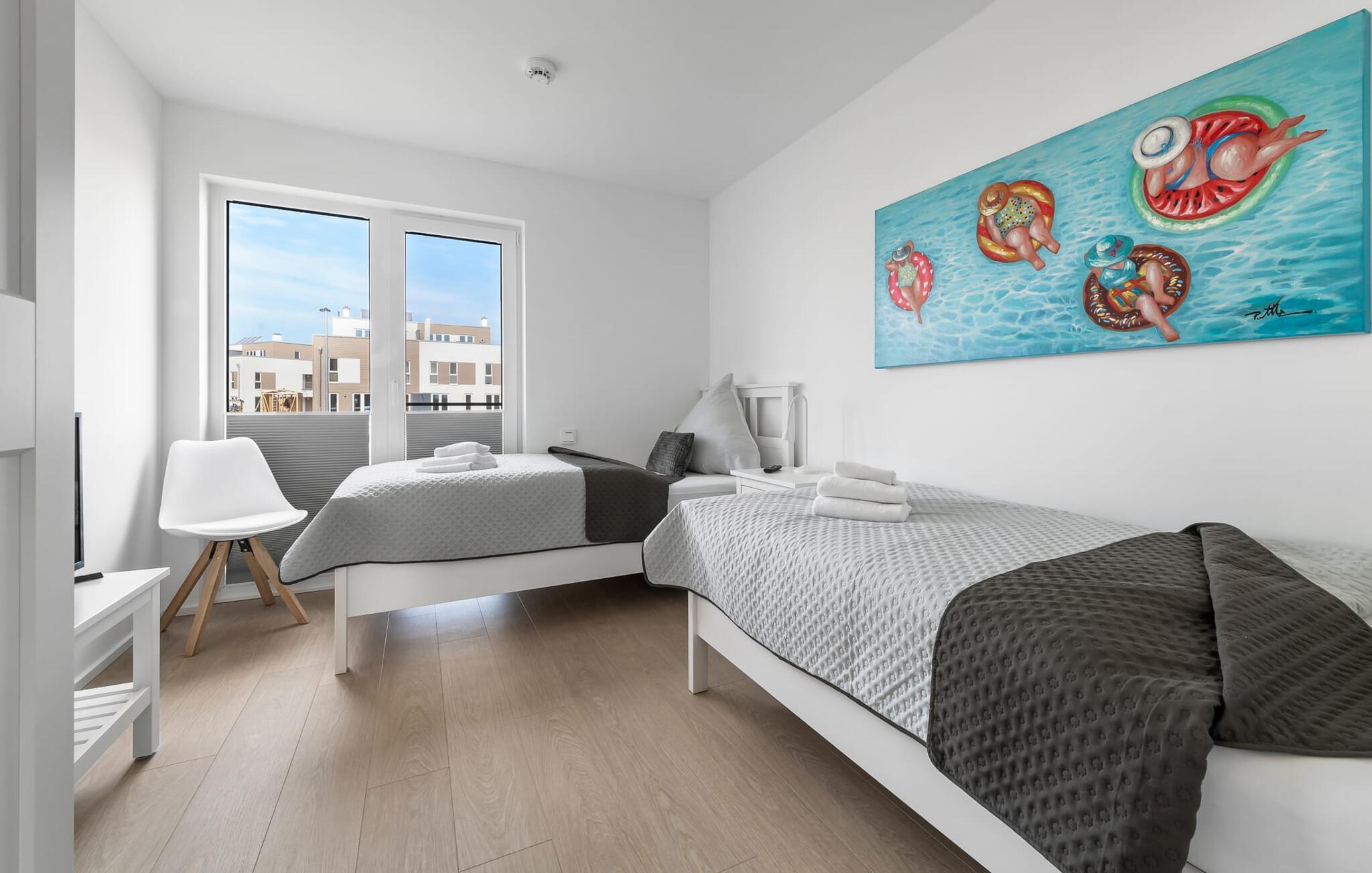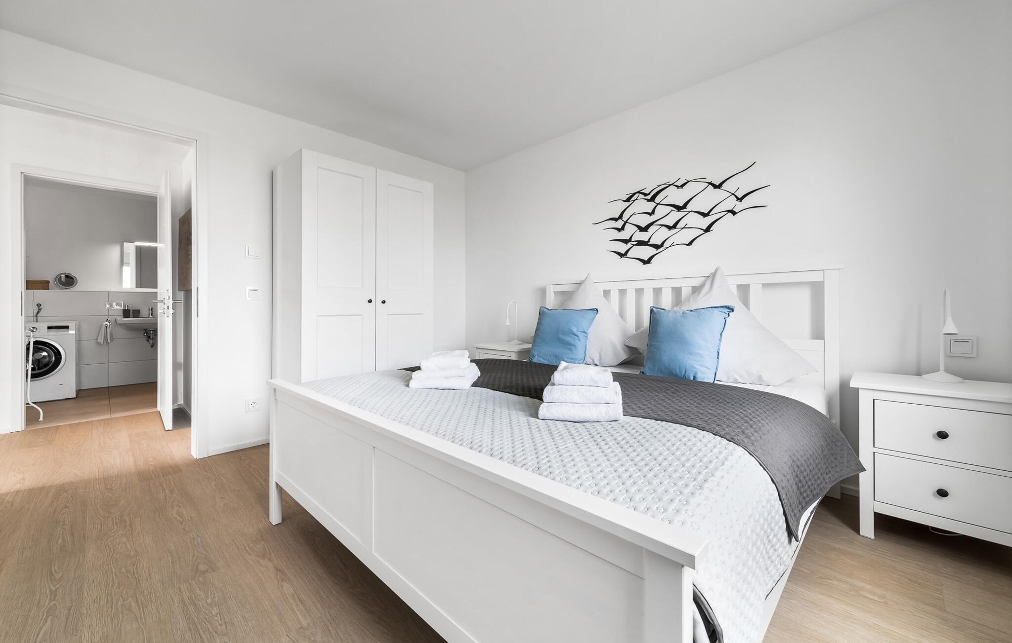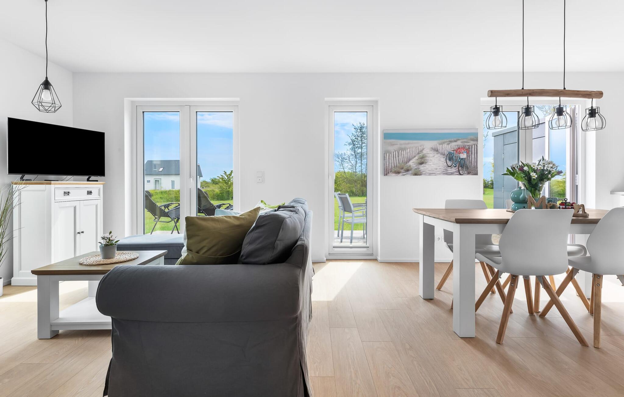 KIEBITZ- er en rummelig og rummelig designferiestue i stueetagen med direkte udsigt til de naturbeskyttede strandenge og marker. Den naturlige sandstrand Weidefelder med kiosk, restaurant, strandstole og forskellige muligheder for vandsport kan nås på få hundrede meter. Firbenede venner kan også slippe dampen ud på hundestranden bagerst. I umiddelbar nærhed er den fantasifuldt designede Adventure Golf minigolfbane og lystbådehavnen i OstseeResort Olpenitz med forskellige indkøbsmuligheder Med sin gulv-til-loft vinduesfront og den tilstødende store terrasse er den åbne stue/spisestue hjertet af. lejligheden. At komme herind og straks føle sig hjemme er én ting. At slappe af i den hyggelige opholdsstue, nyde naturens fred og ro ud af vinduet eller se tv er ren afslapning og rekreation! Hverdagen bliver mere og mere fjern... Skulle vejret nogensinde blive nordisk, vil pejsen med sin brølende ild give yderligere hygge. Det integrerede køkken er perfekt udstyret og af høj kvalitet, og det er sjovt at lave mad sammen. Så nyd de færdige lækkerier på terrassen eller start en hyggelig grillaften med grillen... Det er ren ferie. I kommer direkte ind på den store solterrasse fra opholdsstuen. Dette tilbyder afslappende timer væk fra stress og jag i resten af feriestedet ved Østersøen. To soveværelser er tilgængelige til afslapning om natten. Det første soveværelse forkæler jer med en komfortabel dobbeltseng, mens det andet soveværelse inviterer jer til at drømme med to komfortable enkeltsenge. Bruserummet med brusebad i gulvniveau og infrarød sauna sikrer uforglemmelige wellness-øjeblikke, som I kan nyde i lang tid. For at give en hel feriekomfort finder I jeres egen parkeringsplads foran ferielejligheden. Vores favoritsted: ser ud fra terrassen efter en KIEBITZ og nyder naturen. Bemærk venligst: OstseeResort Olpenitz er meget populært, og der bygges fortsat i parken. Ikke desto mindre kan I se frem til en 5-stjernet standard og et førsteklasses ophold. Byggeaktiviteterne kommer ikke til at forstyrre jer på ferien, og derfor gives der ikke yderligere afslag i prisen.