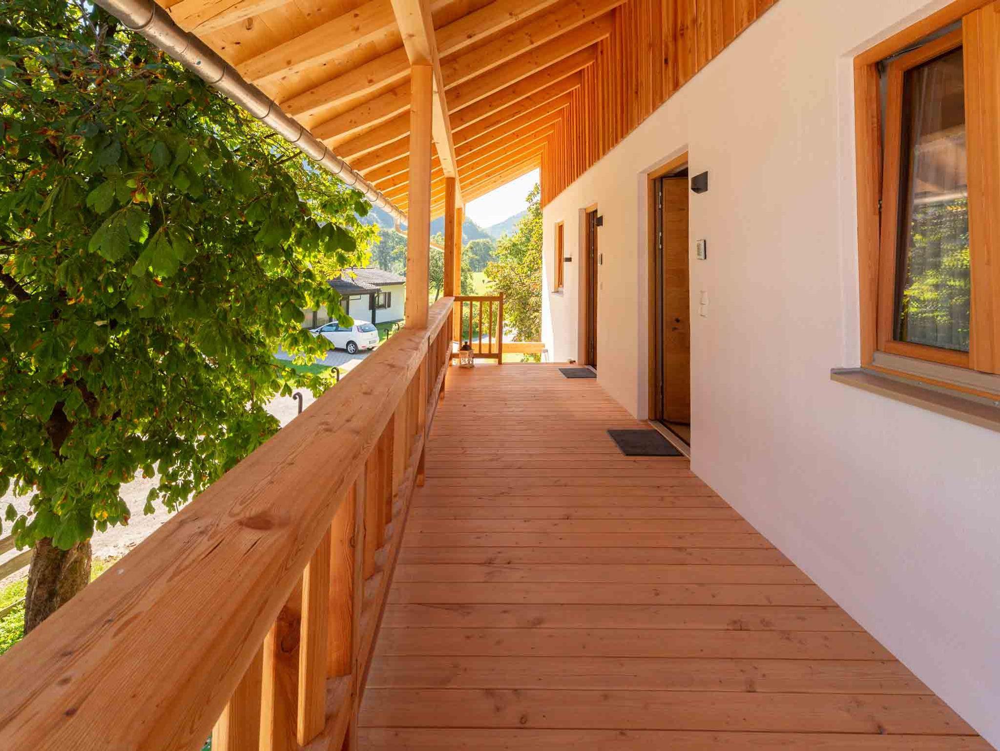 Unser neu erbautes Haus (Fertigstellung 2021) wurde ausschließlich aus Holz aus dem eigenen Wald erbaut. Im Erdgeschoß befindet sich eine Ferienwohnung mit einem Wohn- Esszimmer mit Kamin und zwei Schlafzimmer. Im 1. Obergeschoß gibt es zwei Ferienwohnungen mit jeweils einer Galerie zum schlafen. Das gesamte Gebäude wurde von Handwerkern aus der Region gebaut. Das Holz, aus eigener Forstwirtschaft, wurde direkt am Hof gesägt und zum trocknen gelagert. Die Möbel wurden ebenfalls aus eigenem Holz von regionalen Schreinern gefertigt, auch die Innenausstattungen stammen von regionalen Herstellern. Unser Ziel ist es dem Ausdruck Nachhaltigkeit ein Bild zu verleihen. Zusätzlich wird die Heiz- und Warmwasserenergie ausschließlich aus Sonne und Holz gewonnen.