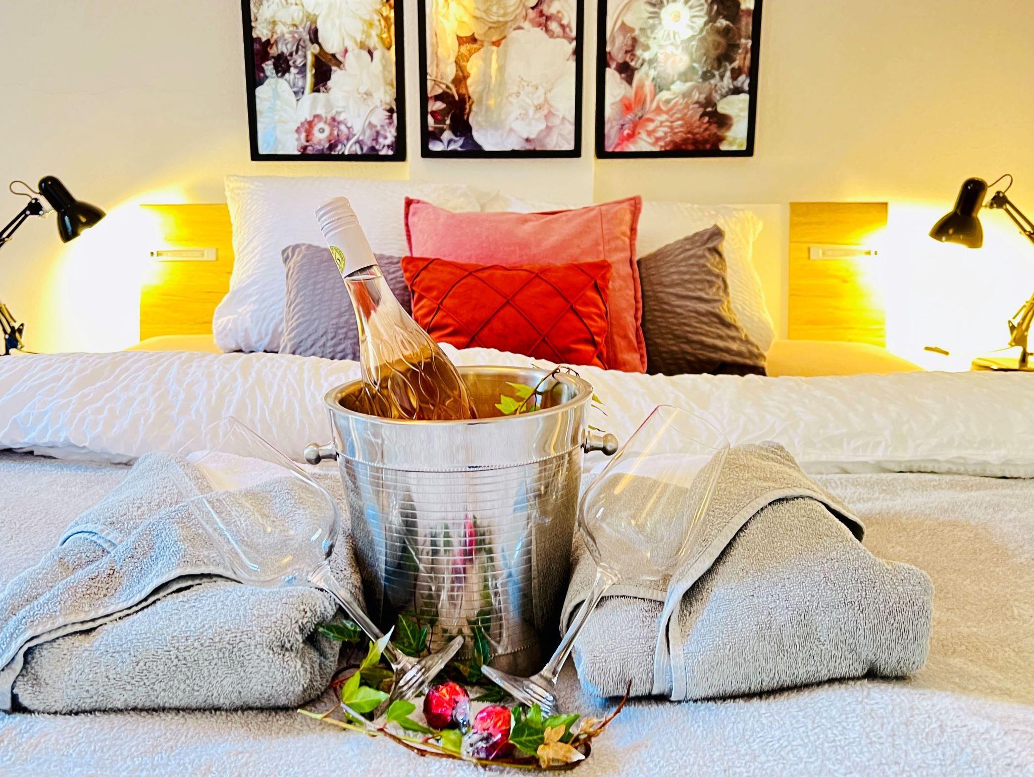 Alle 3 Schlafzimmer sind mit Boxspringbetten 160 x 200 ausgestattet. In einem der Schlafzimmer befindet sich in einen weiteres Einzelbett in Überlänge 90 x 220 und ein Arbeitsplatz. Alle Betten verfügen über Qualitätsmatratzen . Die Bettwäsche ist in Komfortgröße 155 cm x 220 cm genäht. Auf Wunsch kann ein Schlafraum mit Kinderreisebett oder Matratzenbett ergänzt werden.