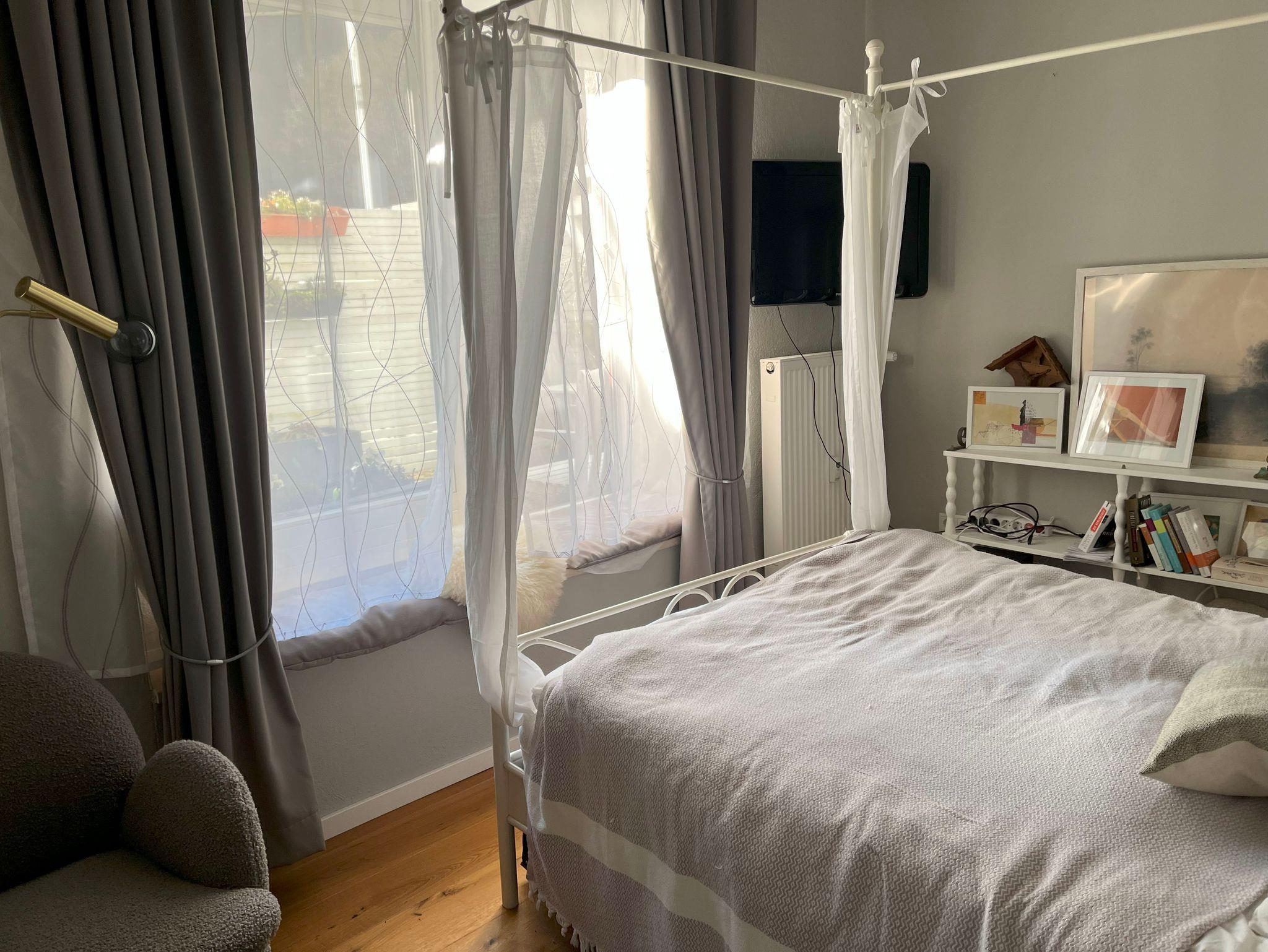 Die charmante 75 qm große Wohnung mit separatem Eingang erreicht man über einen kleinen Innenhof. Eine Bank mit Tisch laden zum Genießen der Nachmittagssonne ein. Das Schlafzimmer mit Queensize-Himmelbett befindet sich im historischen Teil der Grafenburg. Ihm schließt sich ein Bad mit Wanne, Dusche und Infrarot-Kabine an.
