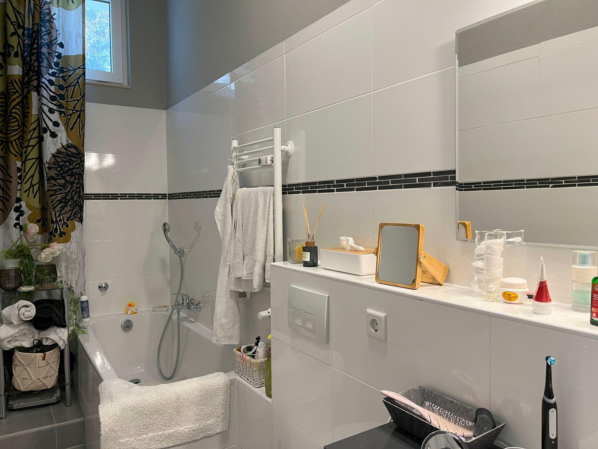 Grill, Wäscheständer, Sonnenliegen, Tisch mit 6 Stühlen auf der Terrasse, Siebträger-Kaffeemaschine, Küchenutensilien, Kühlschrank, Toaster, Wasserkocher, Weingläser