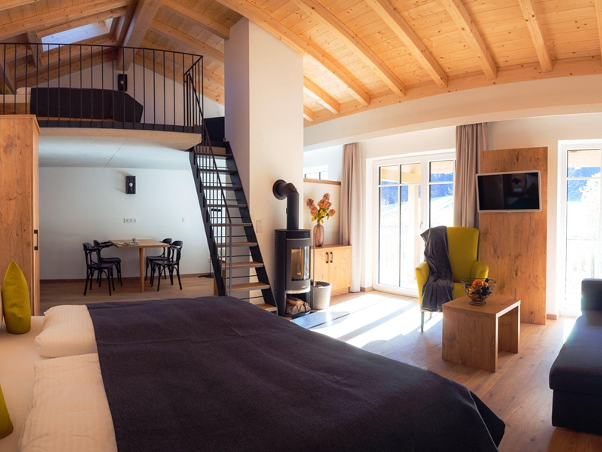 Die Galeriewohnungen befinden sich im 1. OG und verfügen über einen großen Balkon mit freiem Kaiserblick. Die exklusiven Wohnungen beinhalten ein Boxspringbett auf Anfrage eine weitere Schlafmöglichkeit vorhanden. Oben in der Galerie befindet sich ein Doppelbett. Ein großes Panoramafenster mit Relaxmöglichkeit lädt zum Verweilen ein. Die Kochnische verfügt über einen Geschirrspüler, Cerankochfeld und Kühlschrank inklusive Gefrierfach, davor befindet sich eine Sitzgruppe. Der Kaminofen in der Wohnung sorgt für Gemütlichkeit im Winter oder in der Übergangszeit. Das Badezimmer wird zur Wellnessoase durch eine große Rainshowerdusche, ebenso ist in zwei Wohnungen eine Badewanne vorhanden. Zusätzlich sind alle Bäder mit einem Bidet ausgestattet. Die kompletten Wohnungen sind mit Fußbodenheizung ausgestattet.