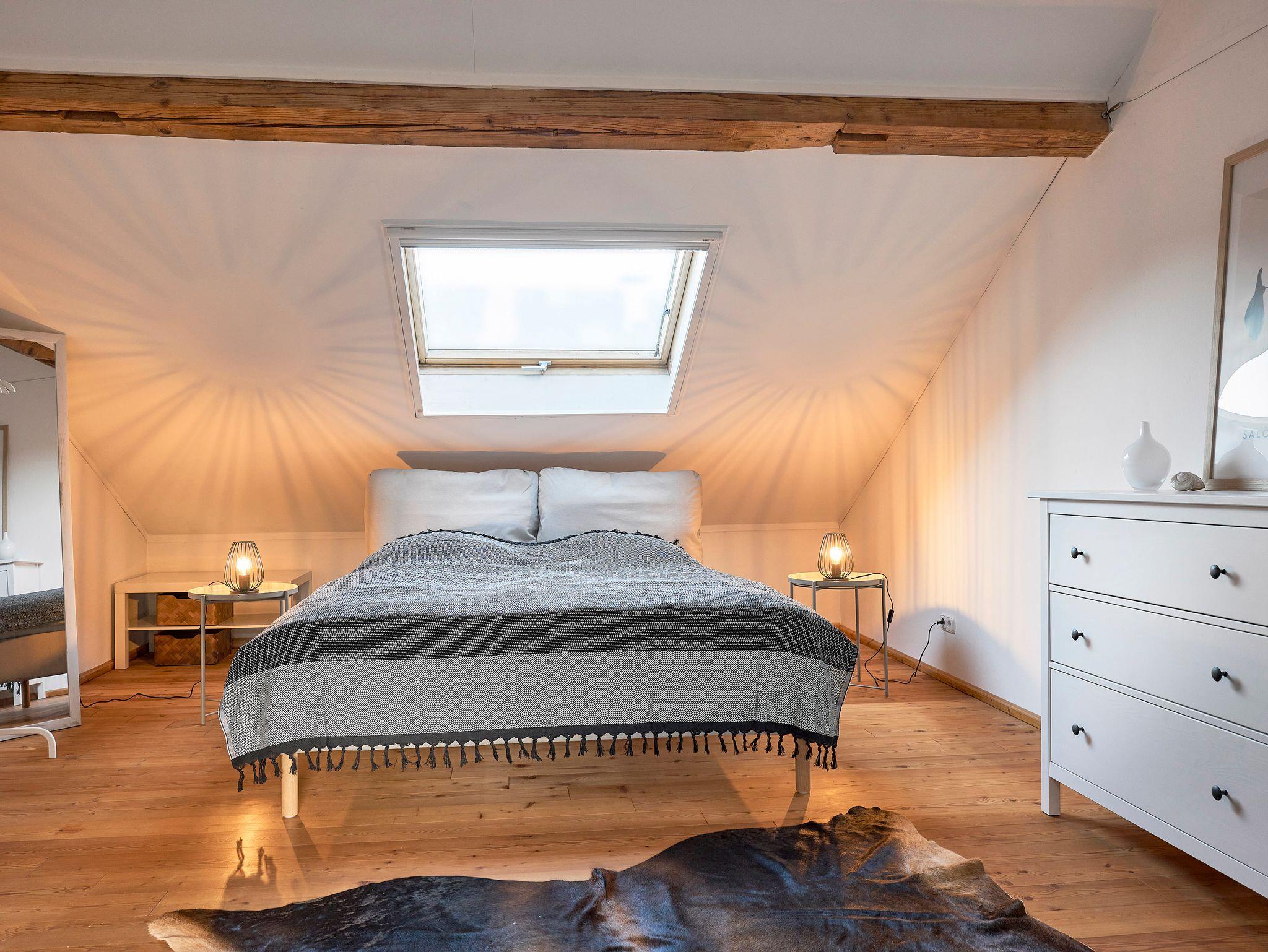 Großzügige Dachwohnung mit großer Wohnküche; Büroarbeitsplatz. Großes Schlafzimmer mit Doppelbett und Ausziehcouch. Kleiner Balkon mit Bergblick in den Sonnenuntergang.