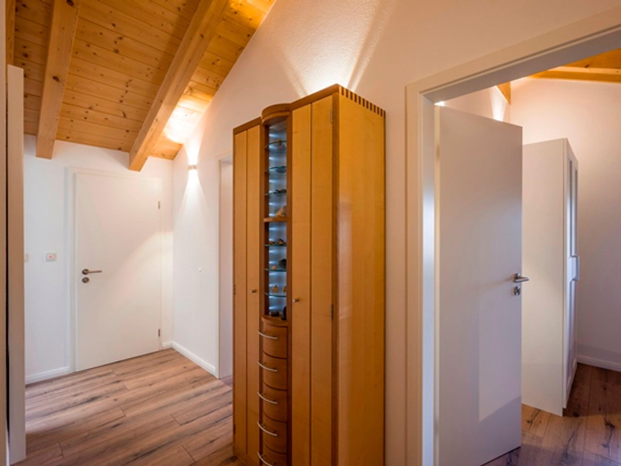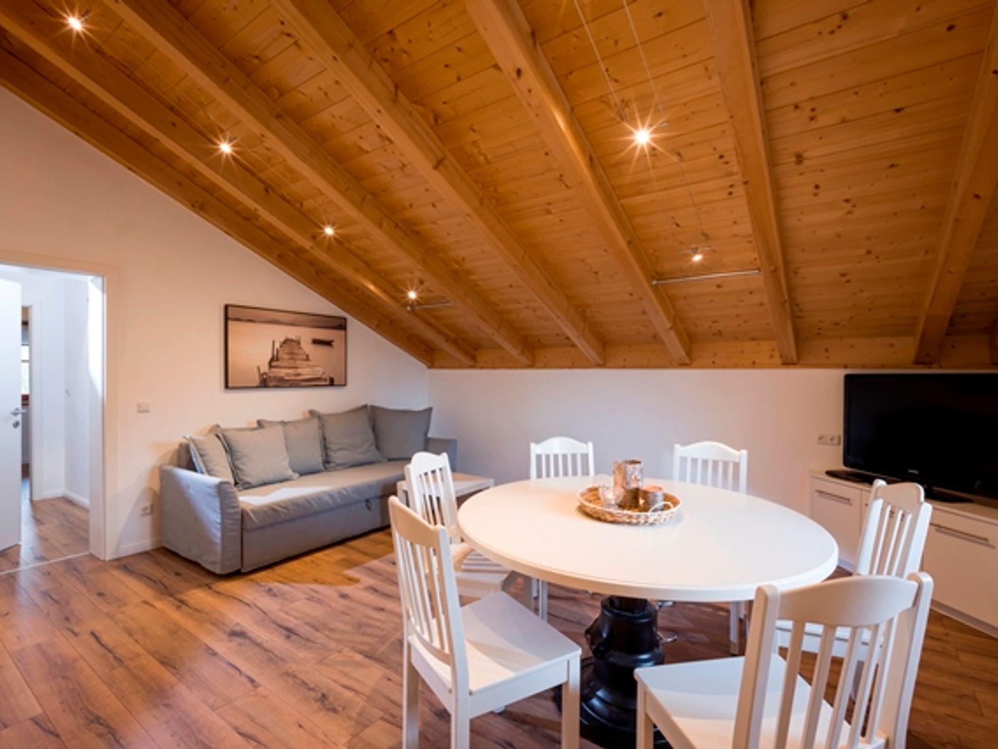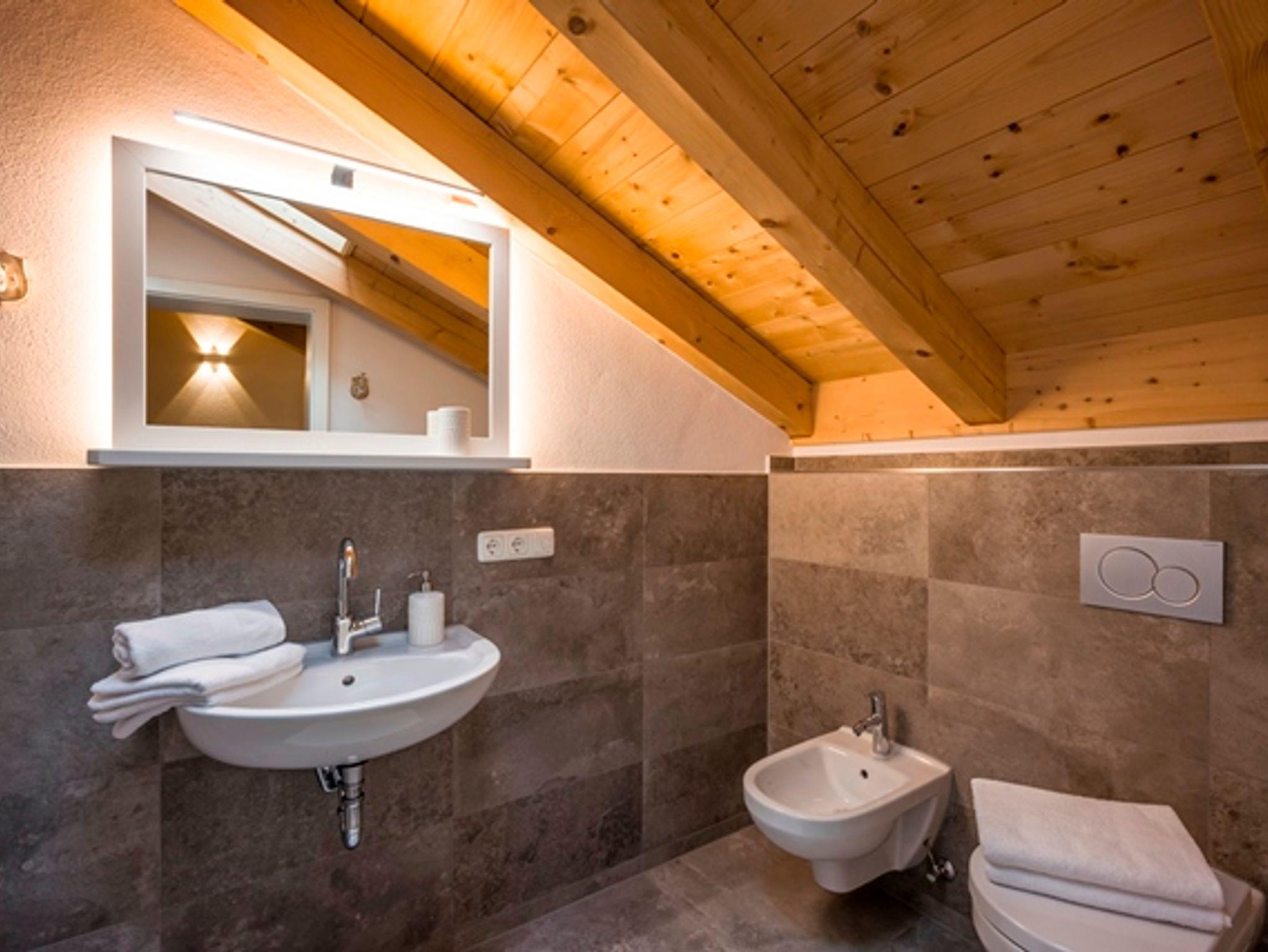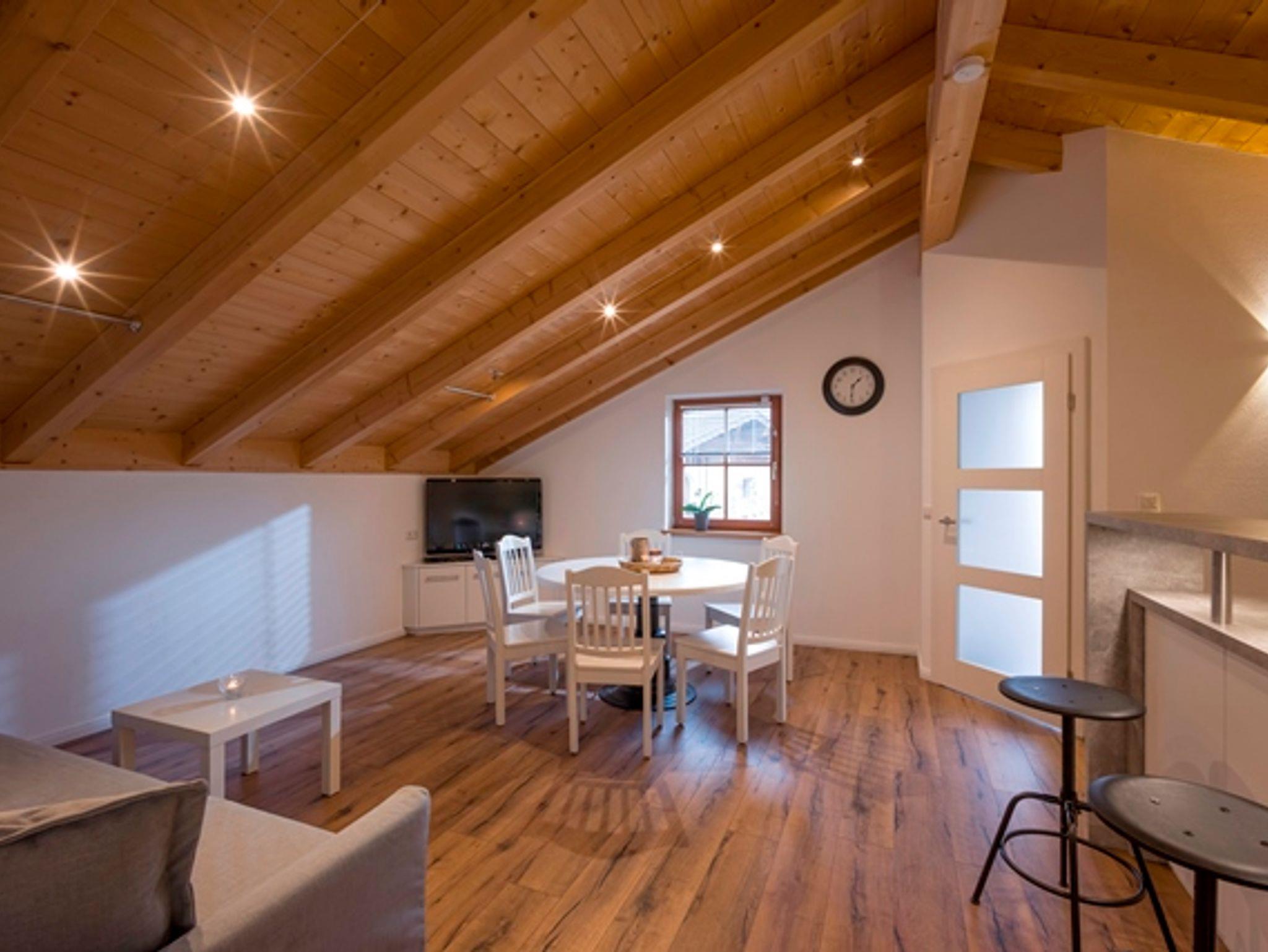 Geräumige Dachgeschoßwohnung im 1. Stock mit Eingangsbereich, komplett ausgestatteter Einbauküche, Wohnzimmer mit ausziehbarer Couch, zwei Schlafzimmern (2x Einzelbett, 1x Doppelbett), Bad mit WC, Bidet und Dusche, ein separates WC und ein kleiner Trockenraum (für Skibekleidung etc.)