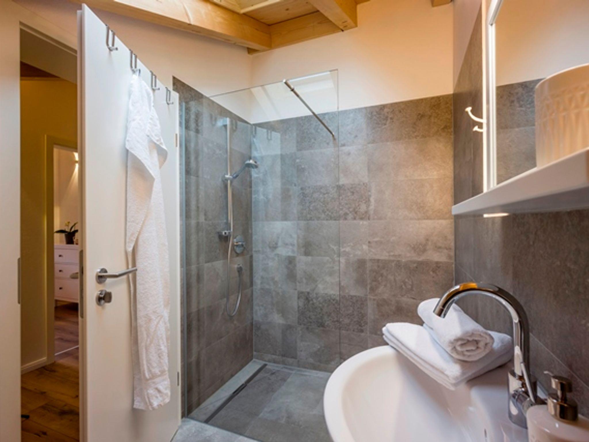 Geräumige Dachgeschosswohnung im 1. Stock mit Eingangsbereich, komplett ausgestatteter Einbauküche, Wohnzimmer mit ausziehbarer Couch, zwei Schlafzimmern (2x Einzelbett, 1x Doppelbett), Bad mit WC, Bidet und Dusche, ein separates WC und ein kleiner Trockenraum (für Skibekleidung etc.), Fußbodenheizung, Überdachte Terrasse, WLAN kostenlos, TV über Internet