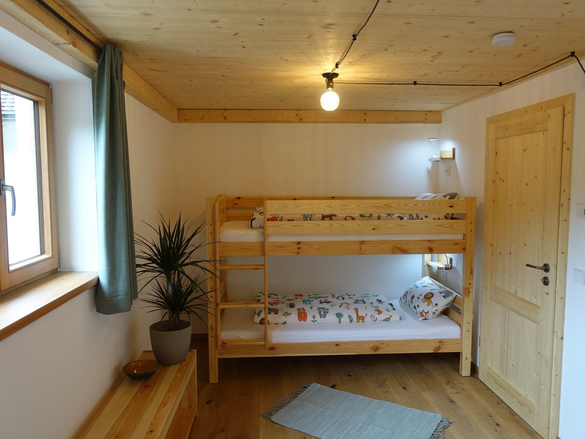 Eingerichtet im modern rustikalen Stil gibt es neben einer voll ausgestatteten Küchenzeile einschließlich Kühlschrank mit Gefrierfach und Kochfeld sowie Backofen eine gemütliche Essecke mit Platz für bis zu sechs Personen. Im offenen Wohn-Essbereich kann man auf einem bequemen Ecksofa Platz nehmen und seinen Blick in das TV oder aus dem Fenster in die freie Landschaft schweifen lassen. Das gemütliche Familienzimmer mit Hüttencharakter ist ausgestattet mit Holzboden bzw. -decke und Echtholzmöbel (u.a. Doppelbett 1,80 x 2,00 m und Etagenbett 0,90 x 2,00 m, geeignet auch für Erwachsene). Weitere Schlafgelegenheiten (Doppelbett 1,80 x 2,00 m) befinden sich in einer offenen Schlafgalerie (Zugang über schmale Holztreppe). Das kompakte, moderne Bad mit Fußboden- und Wandheizung verfügt u.a. über eine bodengleiche, ebenerdige Dusche und einem Haartrockner.