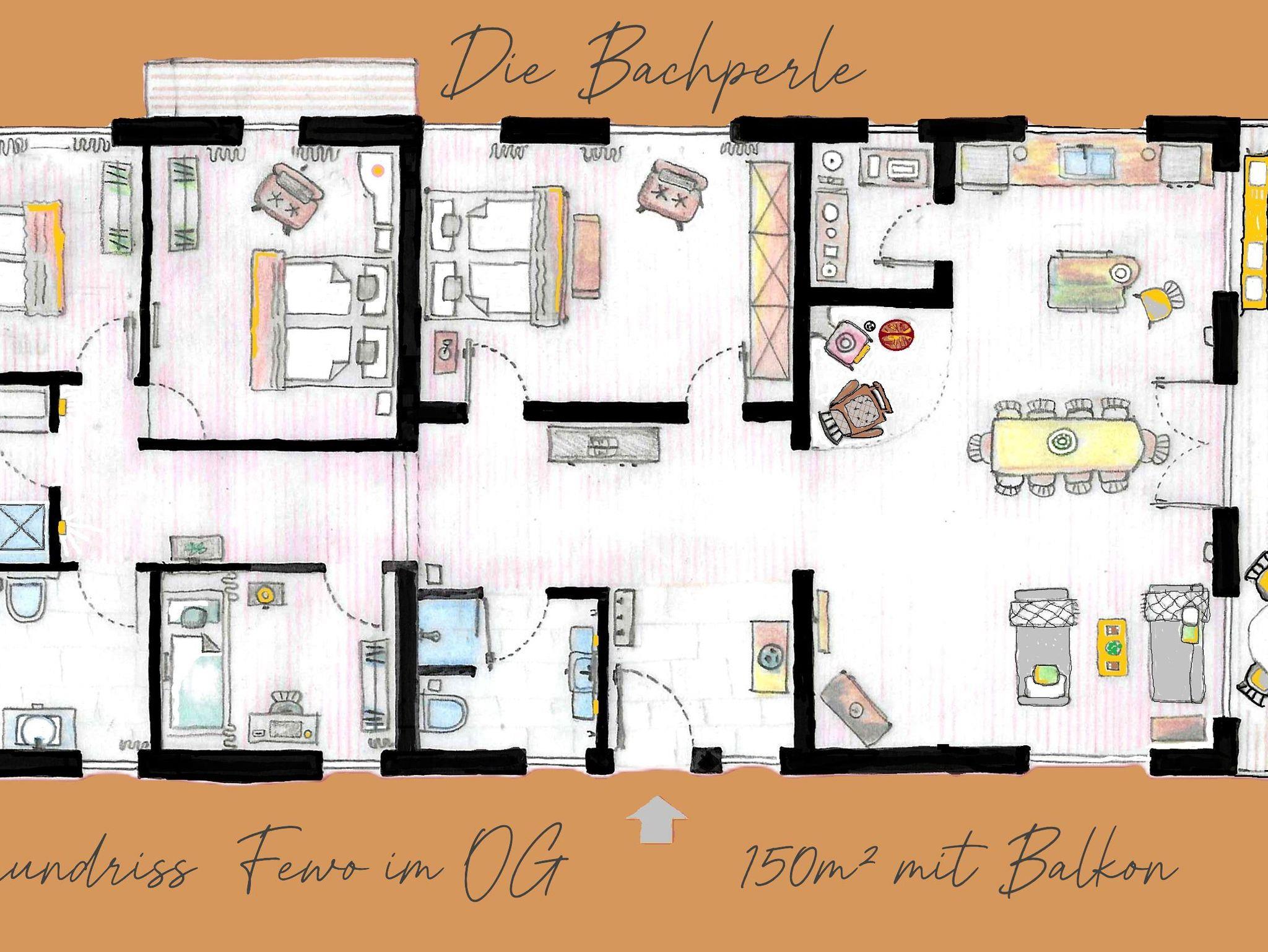 Die Fewo Bachperle mit Terrasse erstreckt sich auf das gesamten Erdgeschoss und ist für bis zu 9 Personen buchbar. im gleichen Ferienhaus im Obergeschoss befindet sich eine zweite Fewo Bachperle mit Balkon, die für bis zu 10 Personen extra zu buchen ist. So finden bis zu 19 Personen bequem im Ferienhaus Bachperle Platz. Jede Fewo hat einen eigenen Eingang, sodass sich das Ferienhaus ideal für gemeinsam reisende Familien oder Freunde eignet, die trotzdem Wert auf eine eigene Privatsphäre legen.