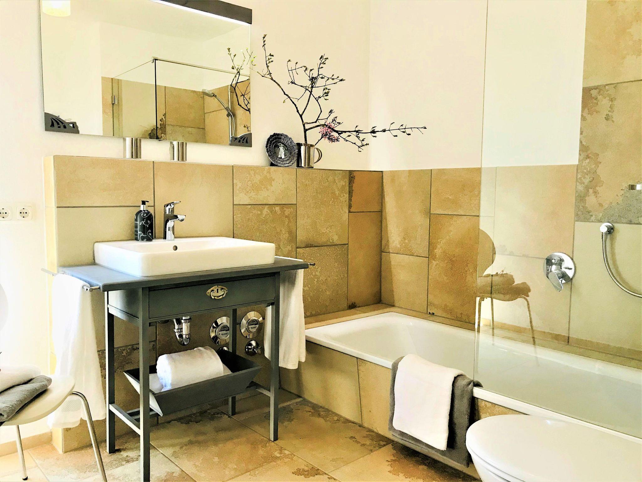 Bei Bedarf können ein Gitterbett sowie 2 Zusatzmatratzen zur Verfügung gestellt werden. Ein Bad ist mit ebenerdiger Dusche und WC, das zweite Bad ist mit einer Badewanne und WC ausgestattet. Beide Bäder verfügen über Fenster und eine automatische Raumlüftungsanlage.Zudem steht Ihnen eine kostenfreie LAN sowie WLAN-Verbindung mit Fritzbox zur Verfügung (50MBit/s).