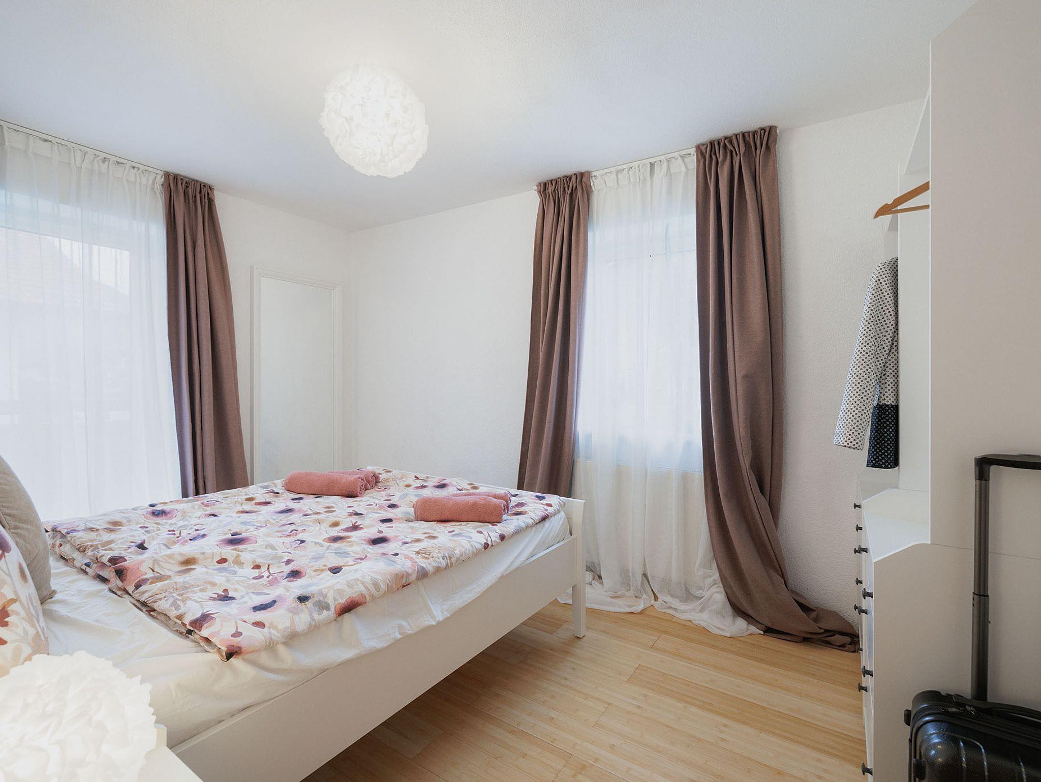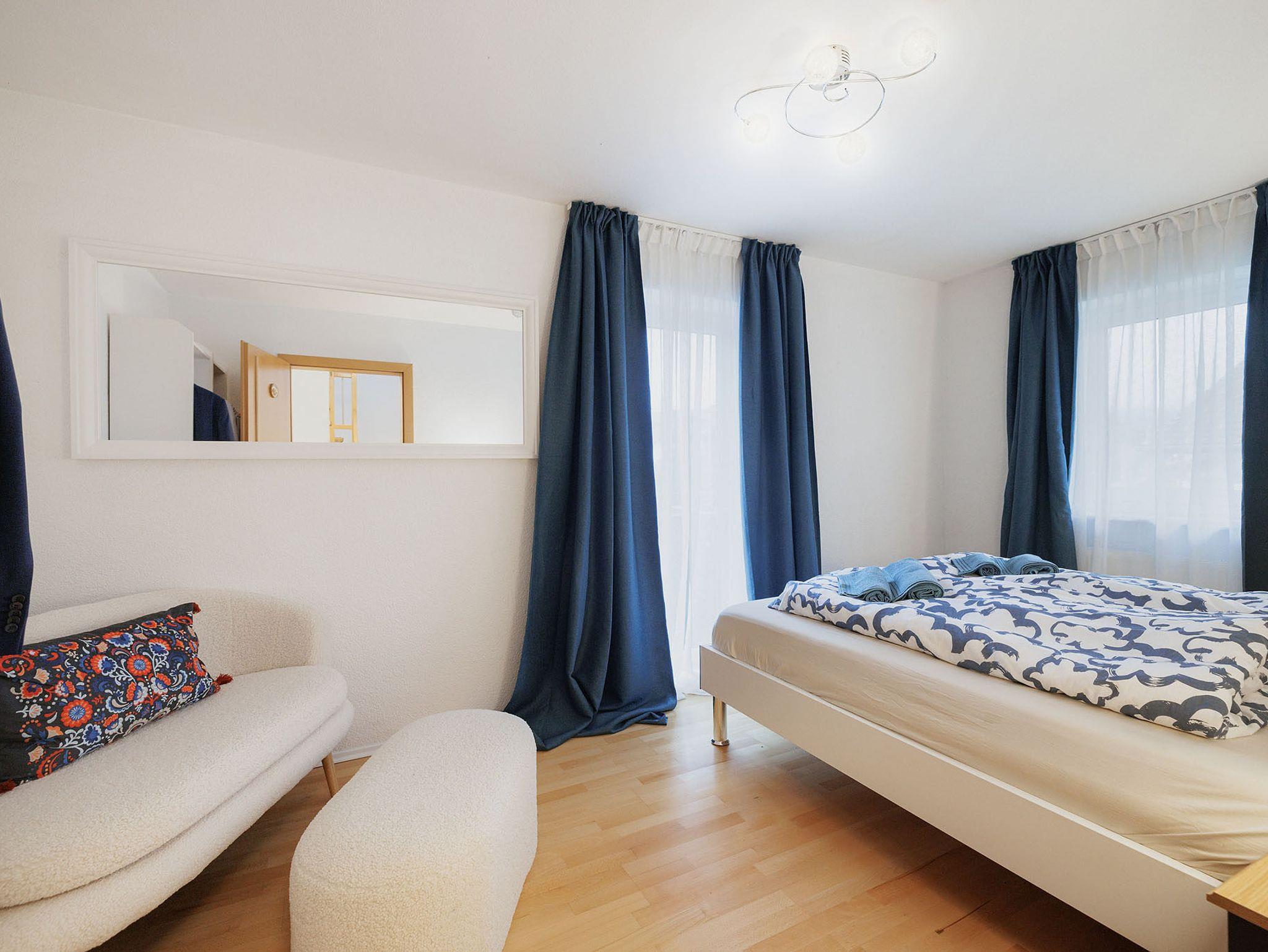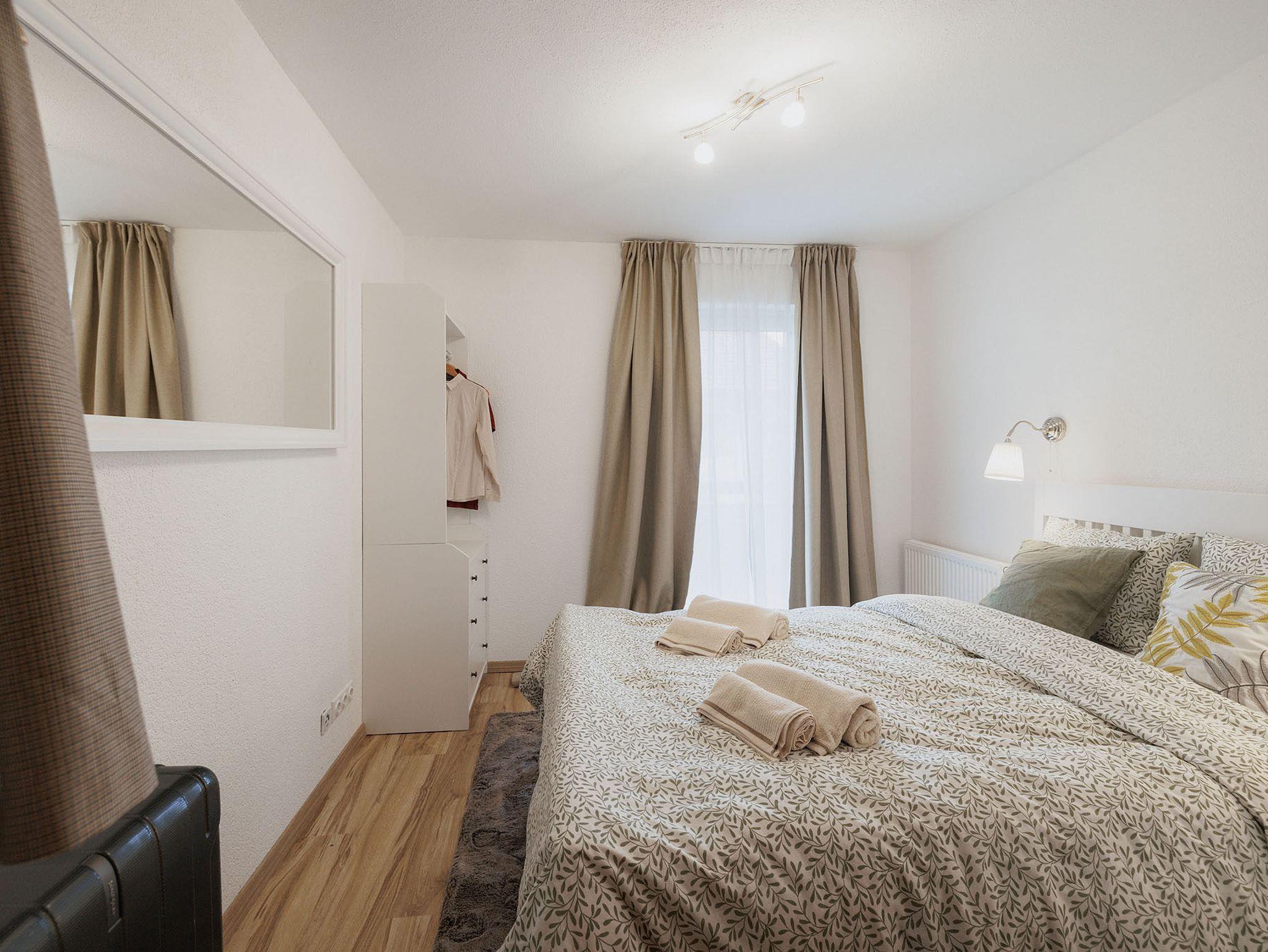Schlafzimmer: gemütliche Schlafzimmer in modernem Stil mit französichen bzw. großen Doppelbetten, Kleiderschrank, Spiegel & jeweils Zugang zum Balkon.