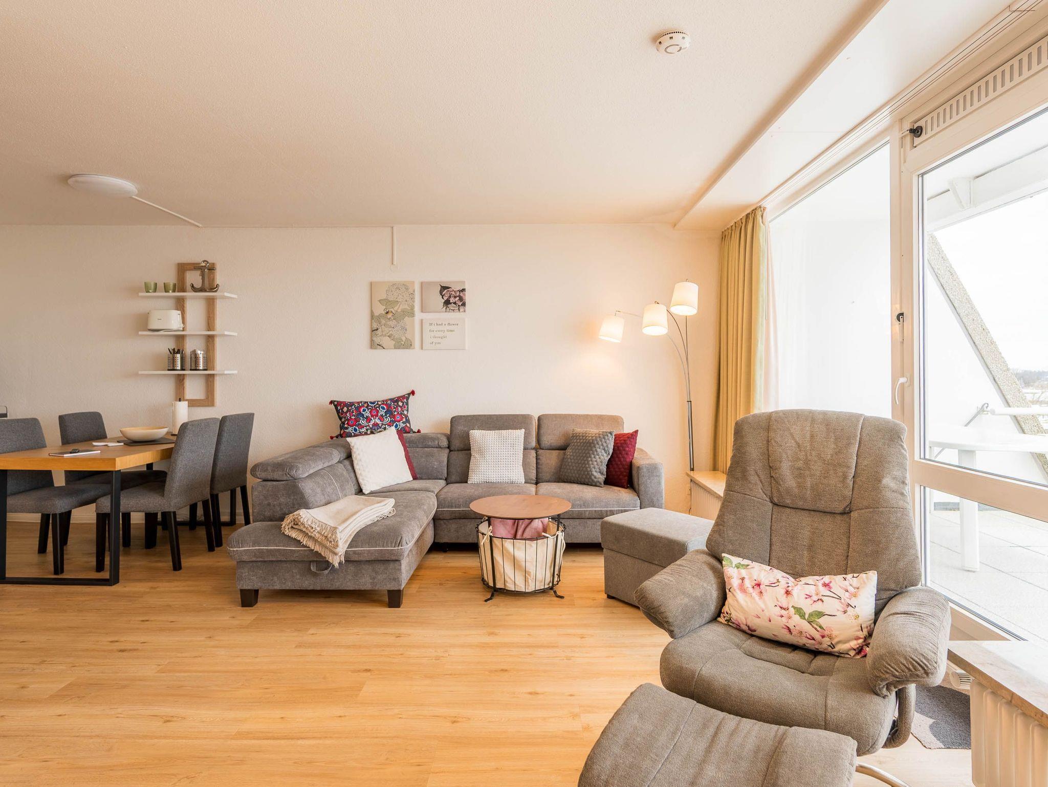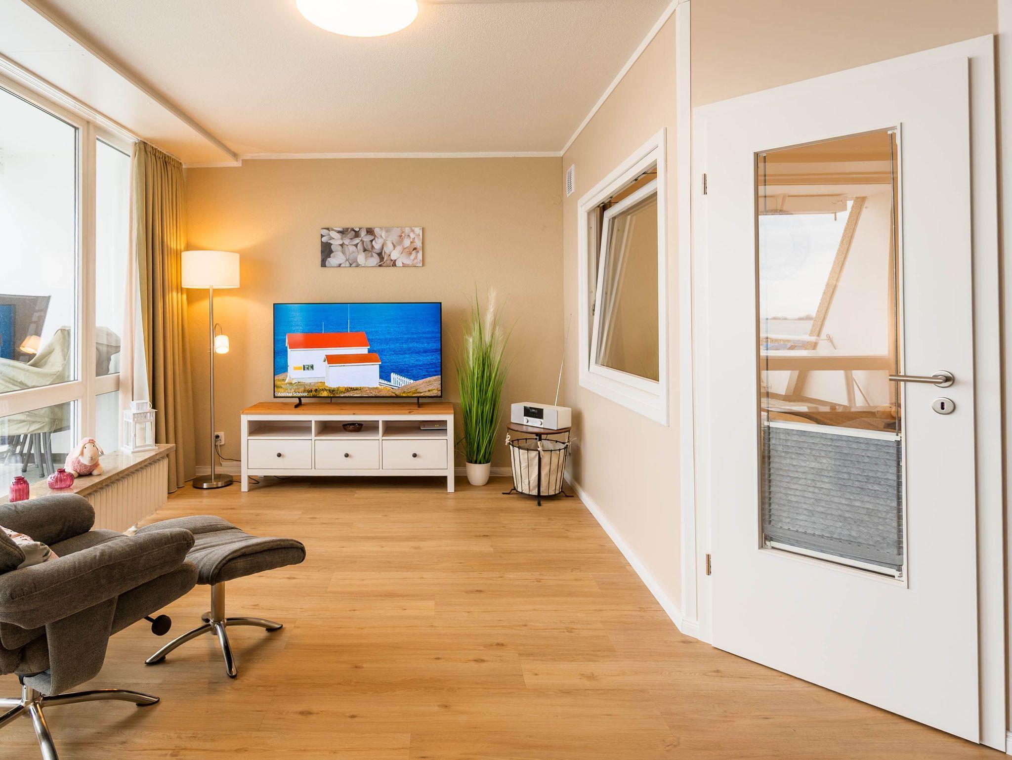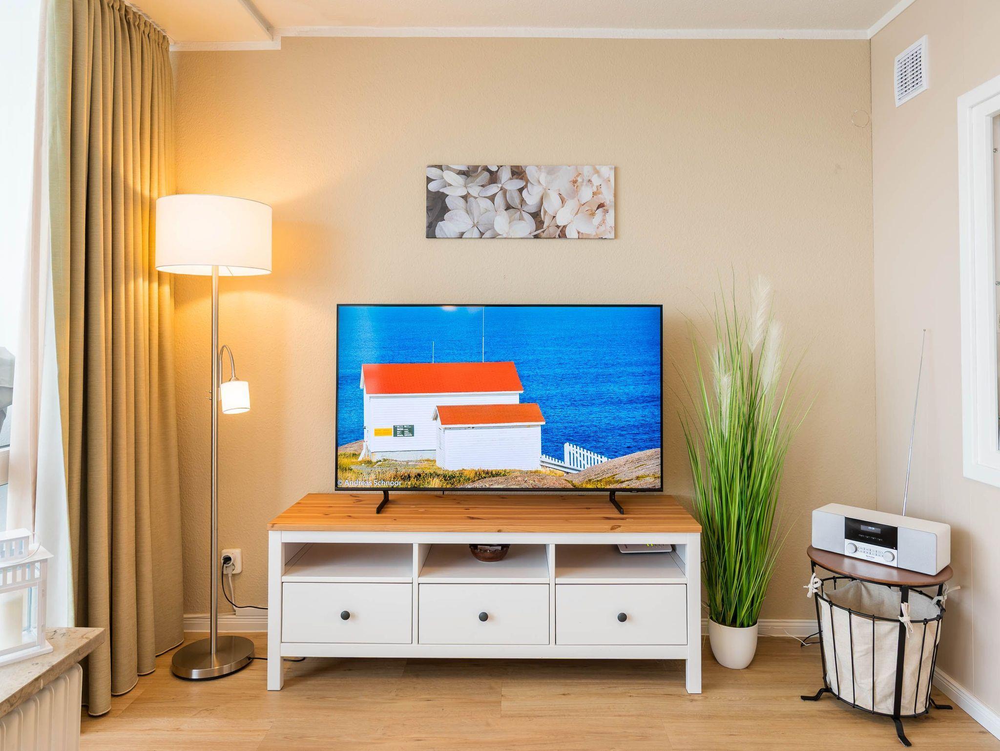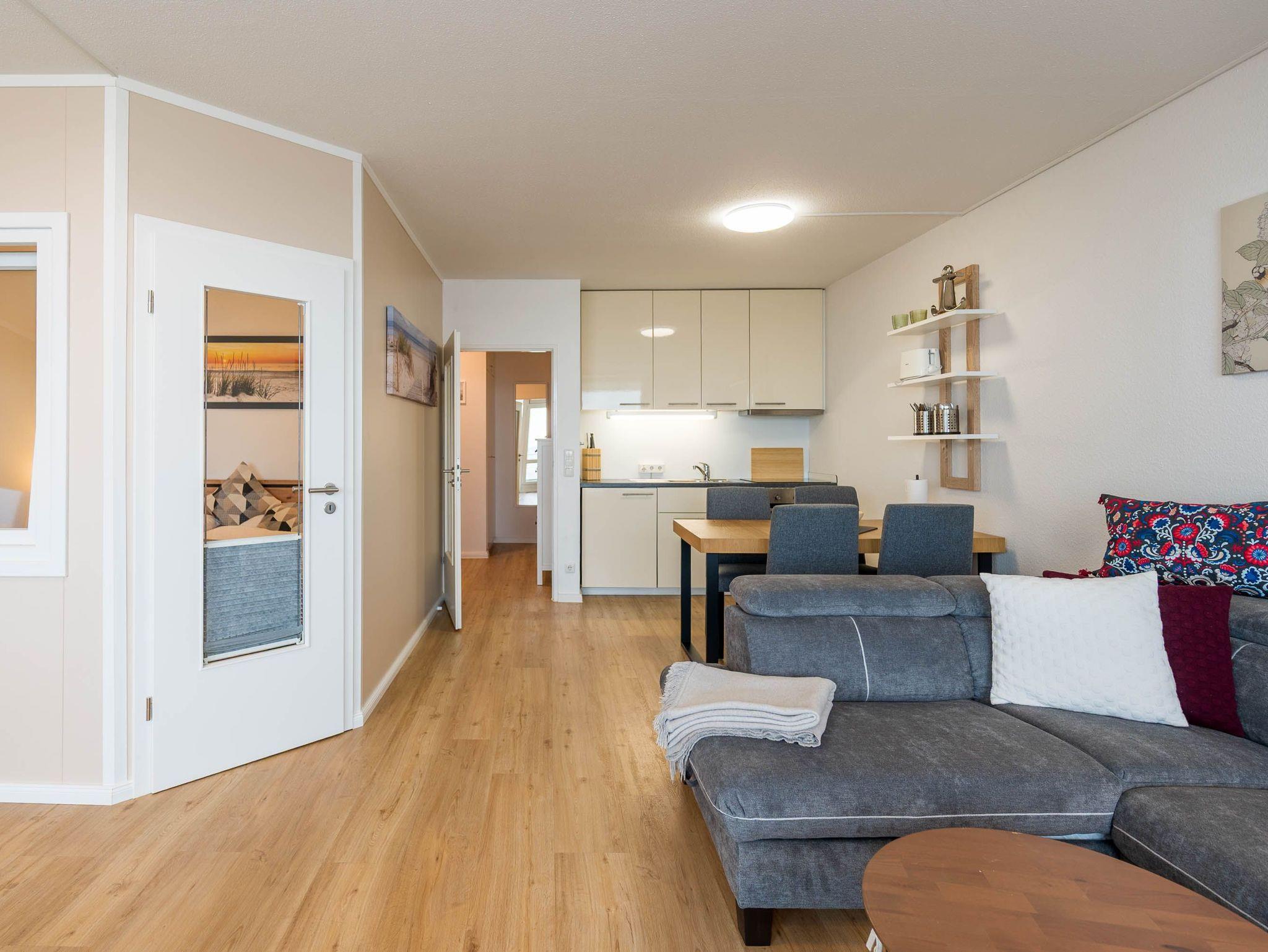 Reinkommen, staunen und sich wohlfühlen lautet hier das Motto für Ihren Urlaub. Das 1,5-Zimmerappartement ist hell und freundlich im maritimen Stil ausgestattet und besticht durch den traumhaften Blick auf die Ostsee, den Segelhafen, den Strand und Schiffe, Schiffe, Schiffe. Es ist immer was los und zu bestaunen und zu gucken - sehen und erleben Sie es selbst. Ein bequemes Sofa lädt zu gemütlichen Abenden ein und lässt sich mit wenigen Handgriffen zur Schlafgelegenheit für eine 3. Person umbauen. Im Schlafzimmer befindet sich das Doppelbett (180 x 200). Die Einbauküche Herd, Backofen, Geschirrspüler und Kühlschrank lädt zu gemeinsamen Kochaktionen mit Meeresblick ein. Ein Esstisch mit 4 Stühlen, ein Sessel mit Fußhocker, ein Sideboard und mit einem 60 Zoll TV vervollständigen das runde Gesamtbild der Wohnung. Im Flur befinden sich ein Einbauschrank und das neue und moderne Badezimmer ist mit Dusche, Waschbecken, WC und einer Waschmaschine ausgestattet. Der große Balkon lädt - ausgestattet mit Markise, Stühlen und einem Tisch - zum gemütlichen Frühstück bei romantischen Sonnenaufgang ein - lassen Sie sich zu jeder Zeit verzaubern und die Seele baumeln beim Panoramablick auf die Ostsee.