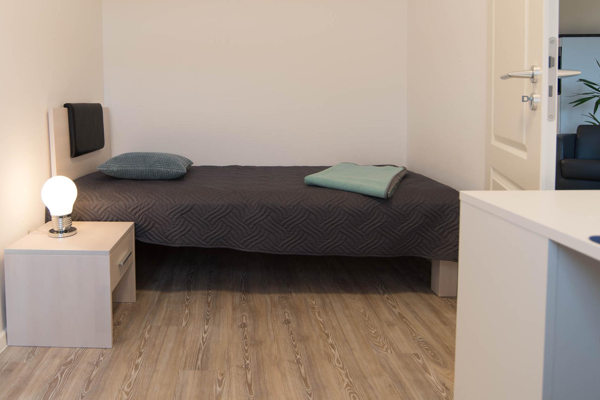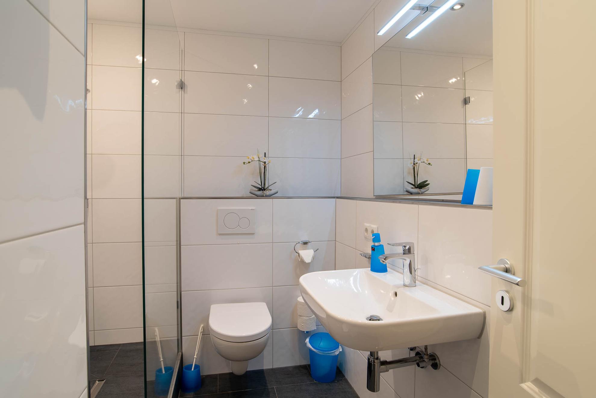 Der Schlafbereich mit einem gemütlichen Doppelbett (180x200) ist durch eine Wand vom Wohnraum abgetrennt. In einem separaten Zimmer gibt es einen Schreibtisch und ein Einzelbett (90x200) für eine dritte Person. Dieser Raum kann mit Plissees abgedunkelt werden. Das moderne Badezimmer verfügt über eine große Walk-in-Dusche, einen großen Spiegel und eine Handtuchheizung. Vom Balkon aus hat man einen wunderbaren seitlichen Meerblick über die Strander Bucht. Dort steht ein Tisch mit drei Stühlen zur Verfügung.