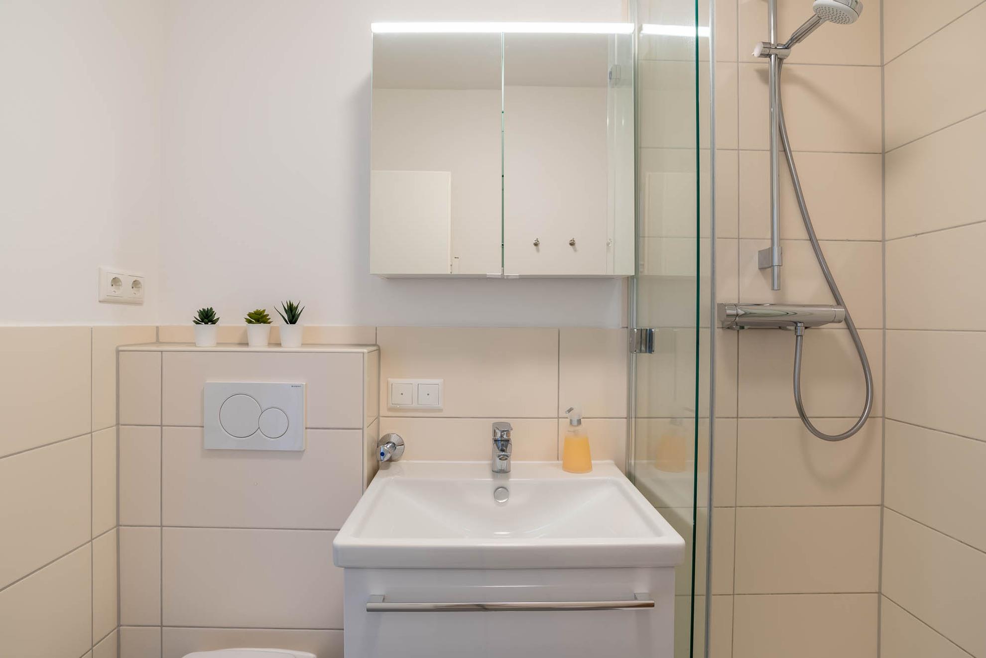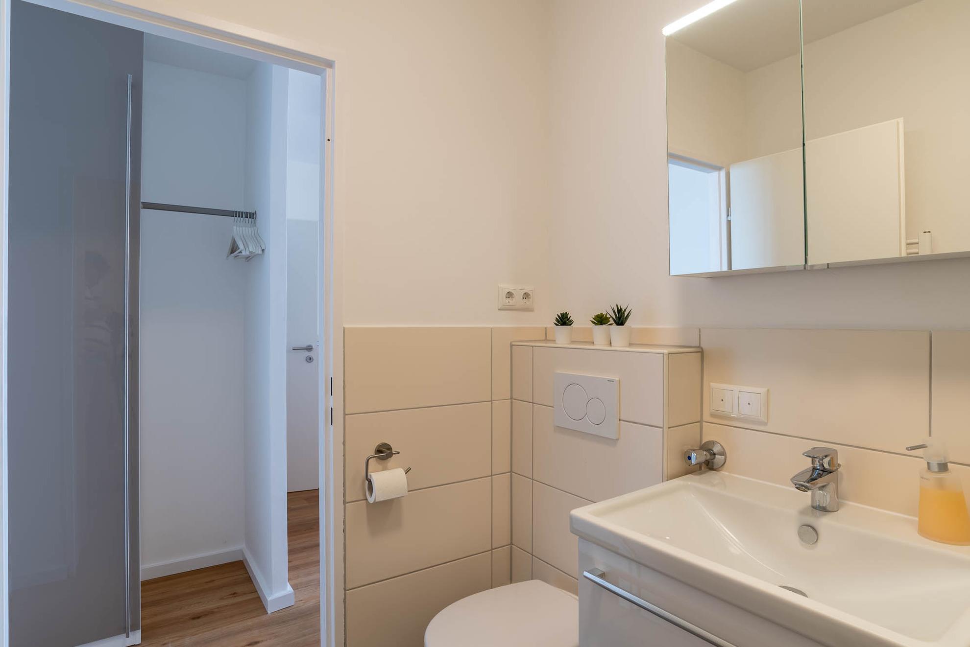 Am Eingangsbereich befindet sich eine kleine Abstellkammer, eine Garderobe und ein großer Kleiderschrank sowie das moderne Badezimmer mit Dusche, WC und genügend Stauraum. Abseits des Badezimmers wurde in der gesamten Ferienunterkunft ein Holzboden verlegt, der dem Apartment eine gemütliche Atmosphäre verleiht.