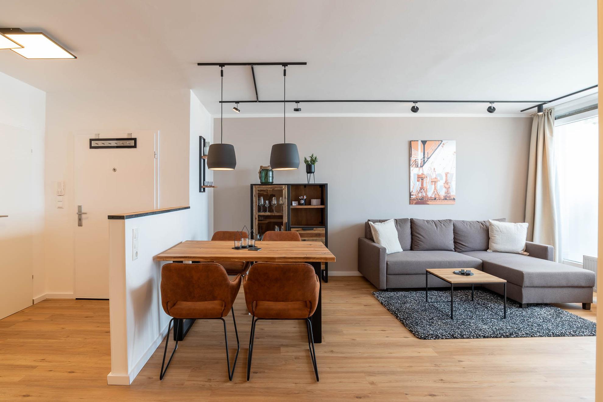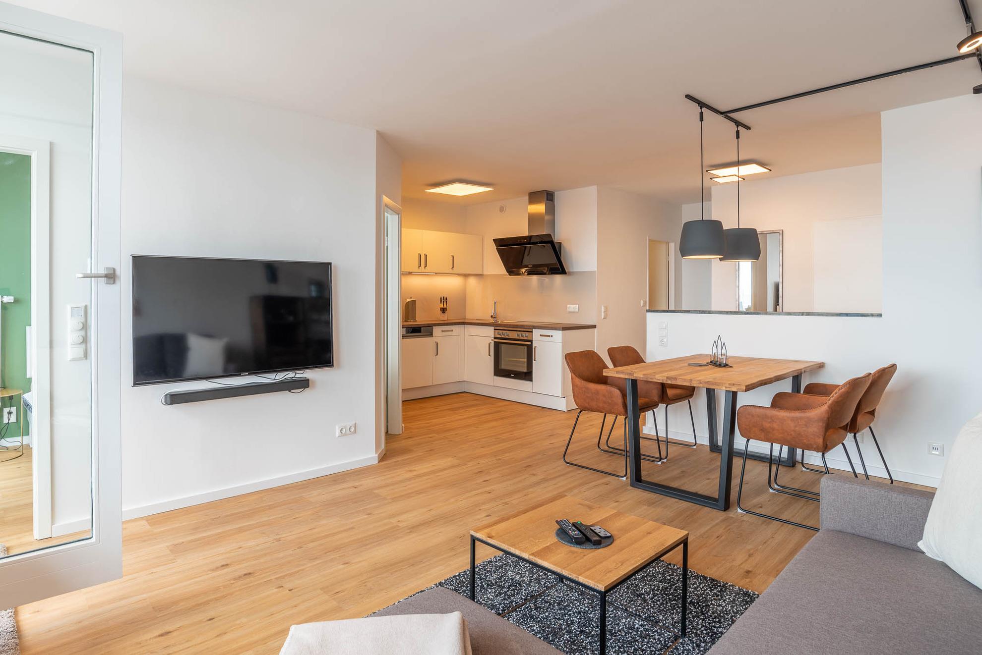 Vom Schlafzimmer ausgehend blicken Sie direkt auf den Wohnzimmerbereich des Apartments. Hier steht neben einer bequemen Couch, einem großen Teppich auch ein Flatscreenfernseher sowie ein Radio für entspannte Abende zur Verfügung. Die Unterkunft lässt sich vollständig durch Gardinen abdunkeln. Mit ein paar Handgriffen lässt sich die Couch in ein vollwertiges Schlafsofa mit der Liegefläche von 160x200cm umbauen. Hier kann eine Person zusätzlich übernachten. Die schwarze Lichtleiste über den Wohn-, und Essbereich ist nicht nur ein Hingucker, sondern verleiht dem Apartment auch am Abend eine gemütliche Stimmung. Die Lightspots lassen sich unterschiedlich steuern und die Wand anstrahlen.