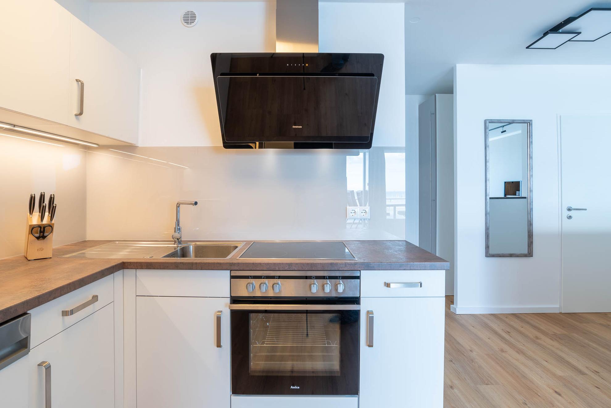 Ein großer Holztisch mit hochwertigen Stühlen stehen für gemütliche Abende an der halbhohen Wand Richtung Eingangsbereich für Sie zur Verfügung. Gegenüber befindet sich der offene Küchenbereich. Die Küche ist vollwertig mit einem Kühlschrank mit Gefrierfach, Ceran-Kochfeld, Backofen, Wasserkocher, Toaster, einer Geschirrspülmaschine und Kaffeemaschine ausgestattet. Daneben angrenzend befindet sich das Schlafzimmer. Dieses ist von zwei Türen aus zu begehen und besticht durch die bodentiefe Fensterfront mit Blick auf das Wasser. Das Doppelbett hat eine Maße von 180x200cm.