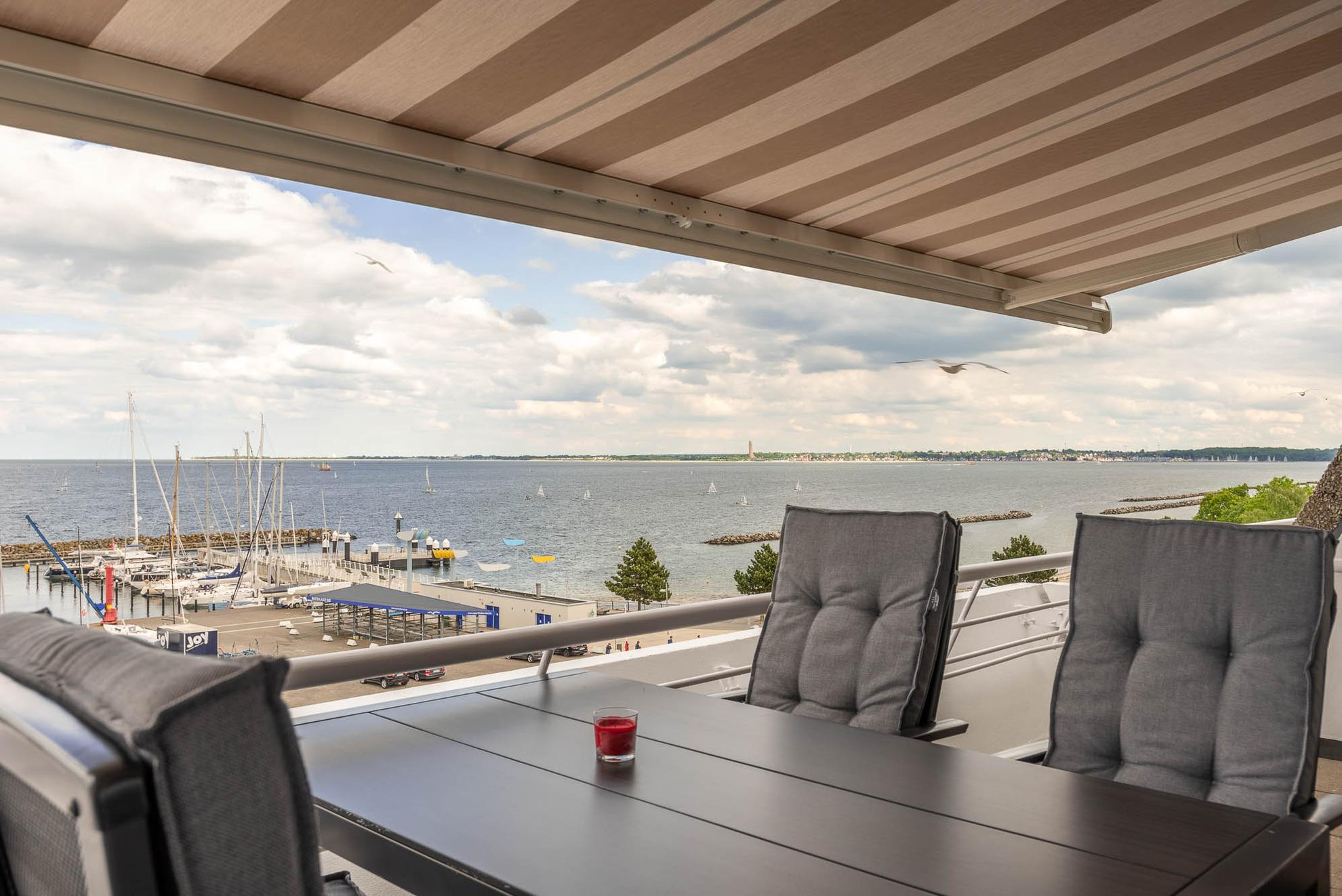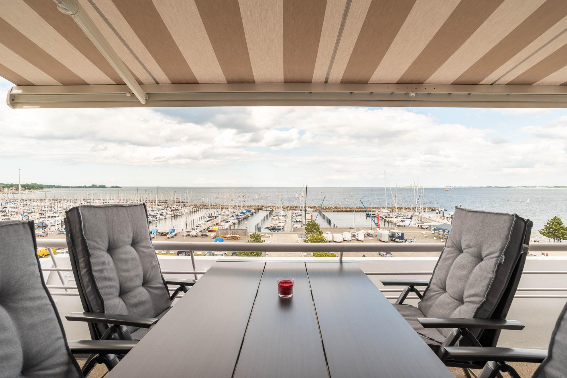 Der 12qm² große Balkon verfügt über einen robusten Gartentisch sowie vier Stühle und einer Gartenbank. Von hier lässt sich wunderbar der Hafen und das Treiben auf der Ostsee beobachten. Vor der Morgen- und Mittagssonne schützt eine ausfahrbare Markise.