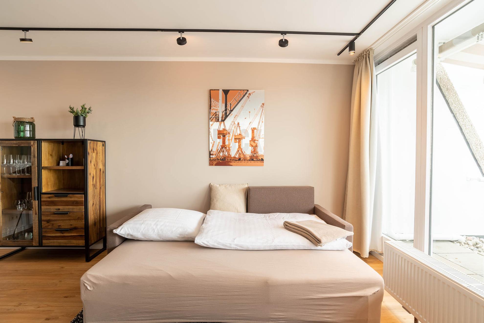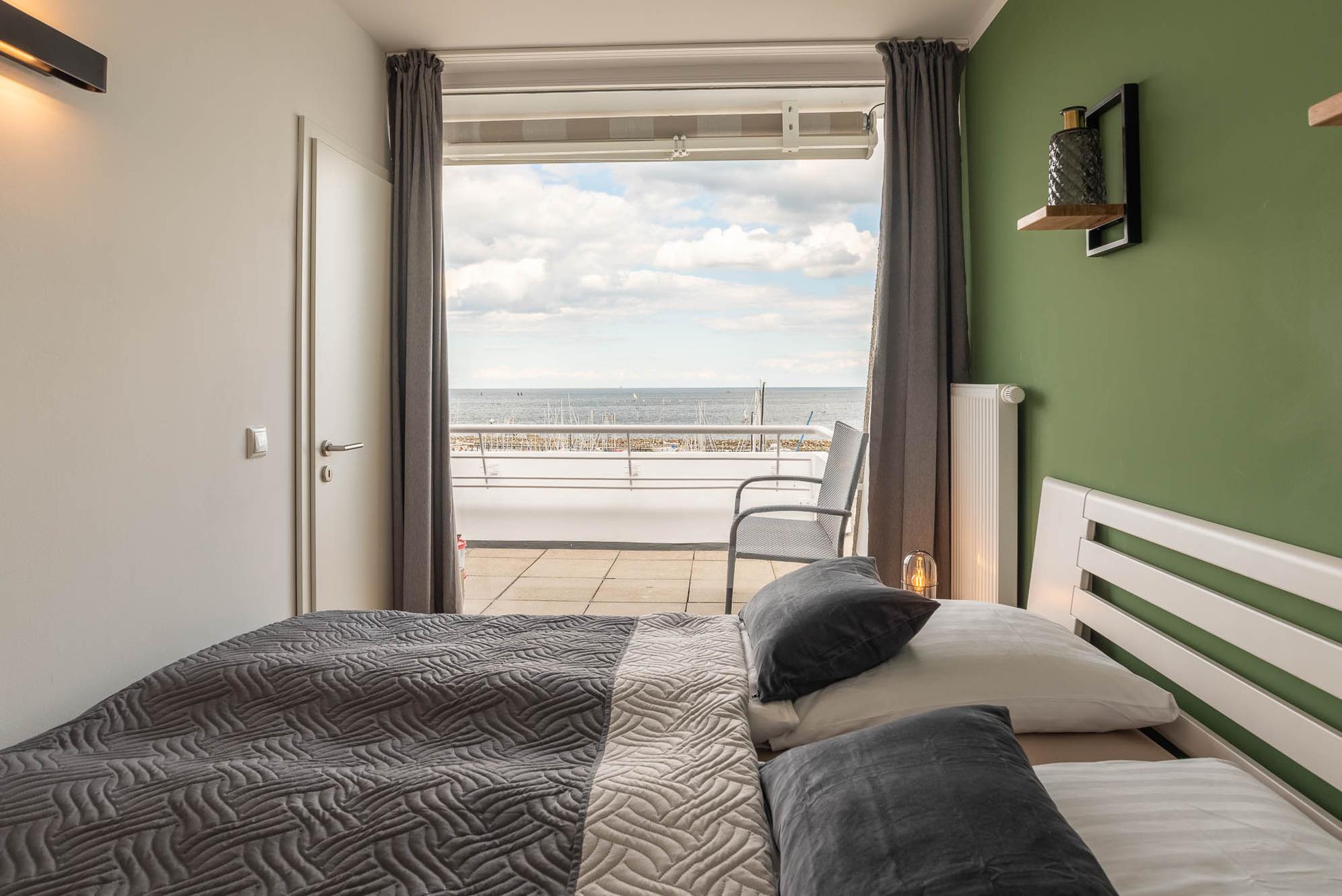 Die bodentiefe Fensterfront lässt das Apartment hell erleuchten. Nicht nur vom Balkon, sondern auch von jeder Sitzgelegenheit der Ferienwohnung hat man einen wunderbaren Blick auf den Hafen und die Ostsee.