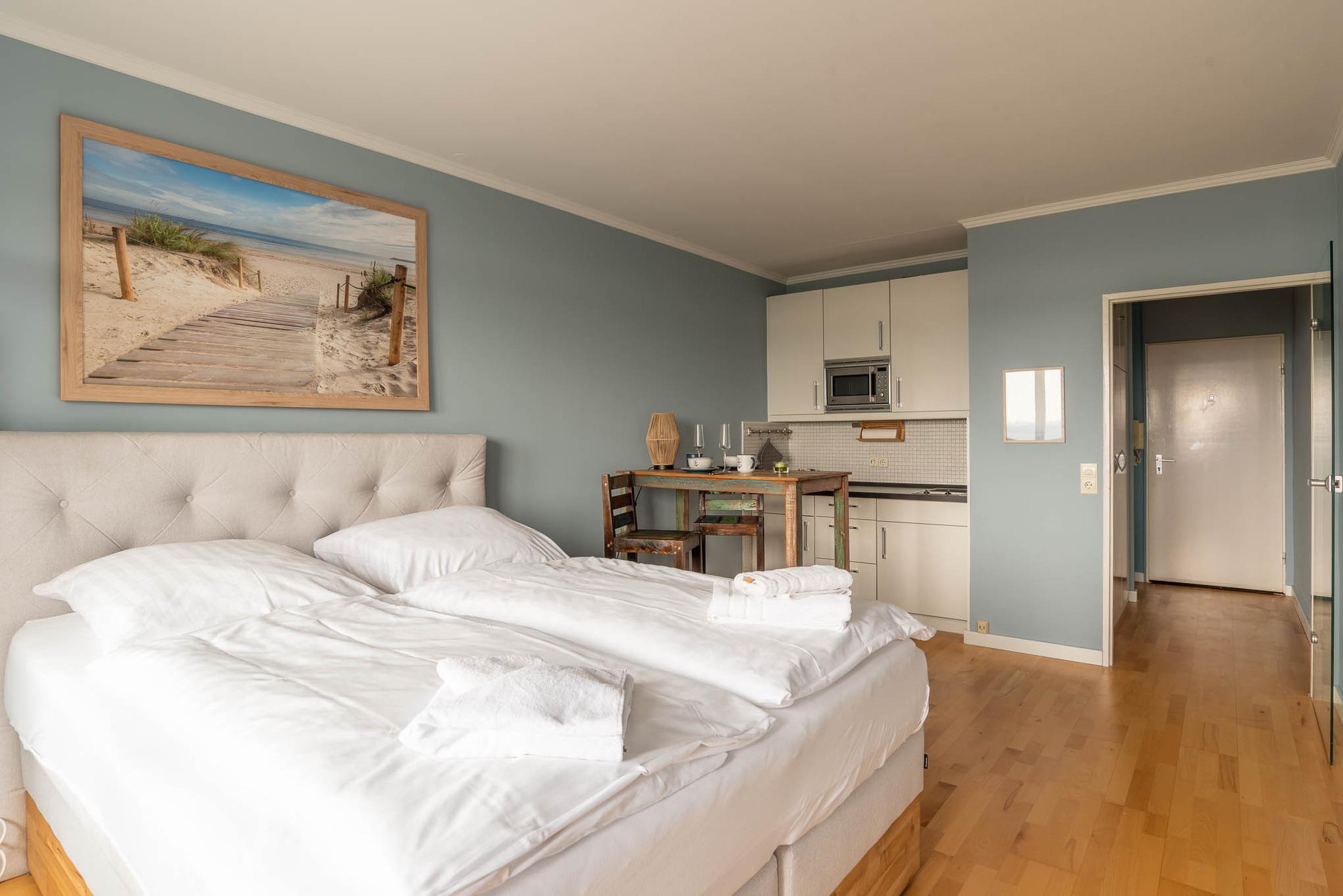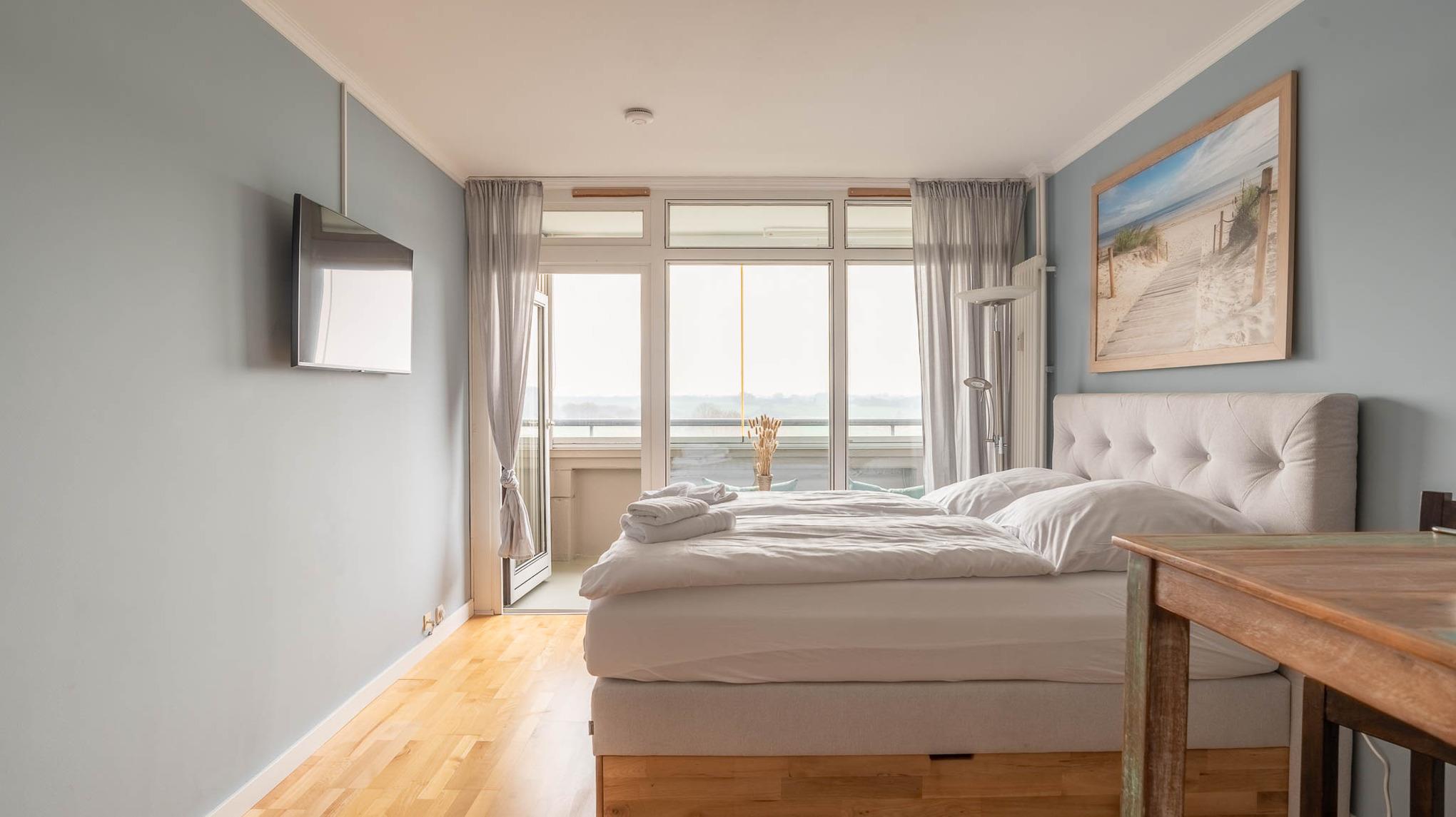 Im freundlichen Appartement befindet sich ein bequemes Boxspringbett (Liegefläche von 160x200 cm). An der Wand gegenüber ist ein LCD- Fernseher angebracht.
