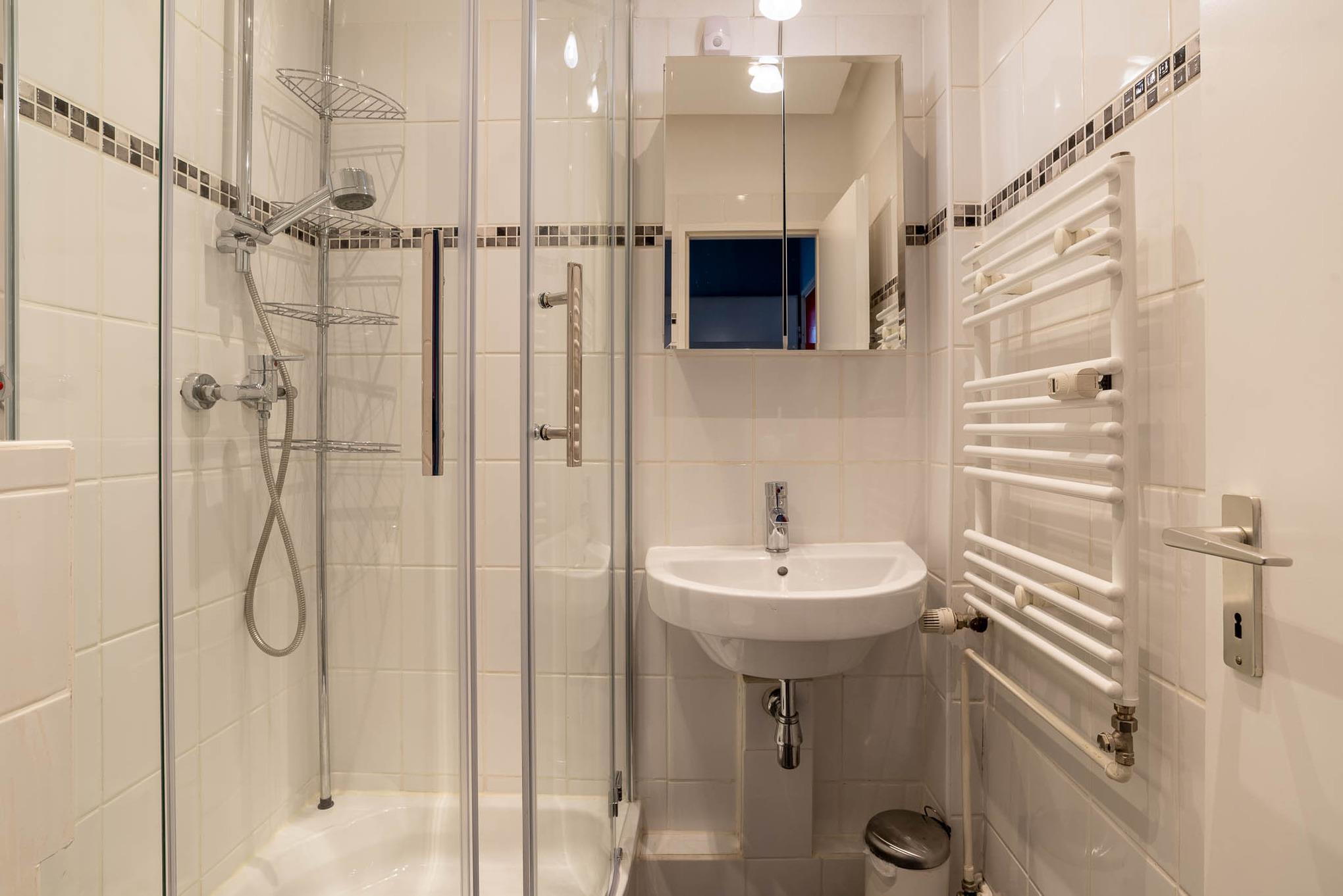 Das separate Badezimmer mit Eckdusche befindet sich in einem gepflegten und modernen Zustand.