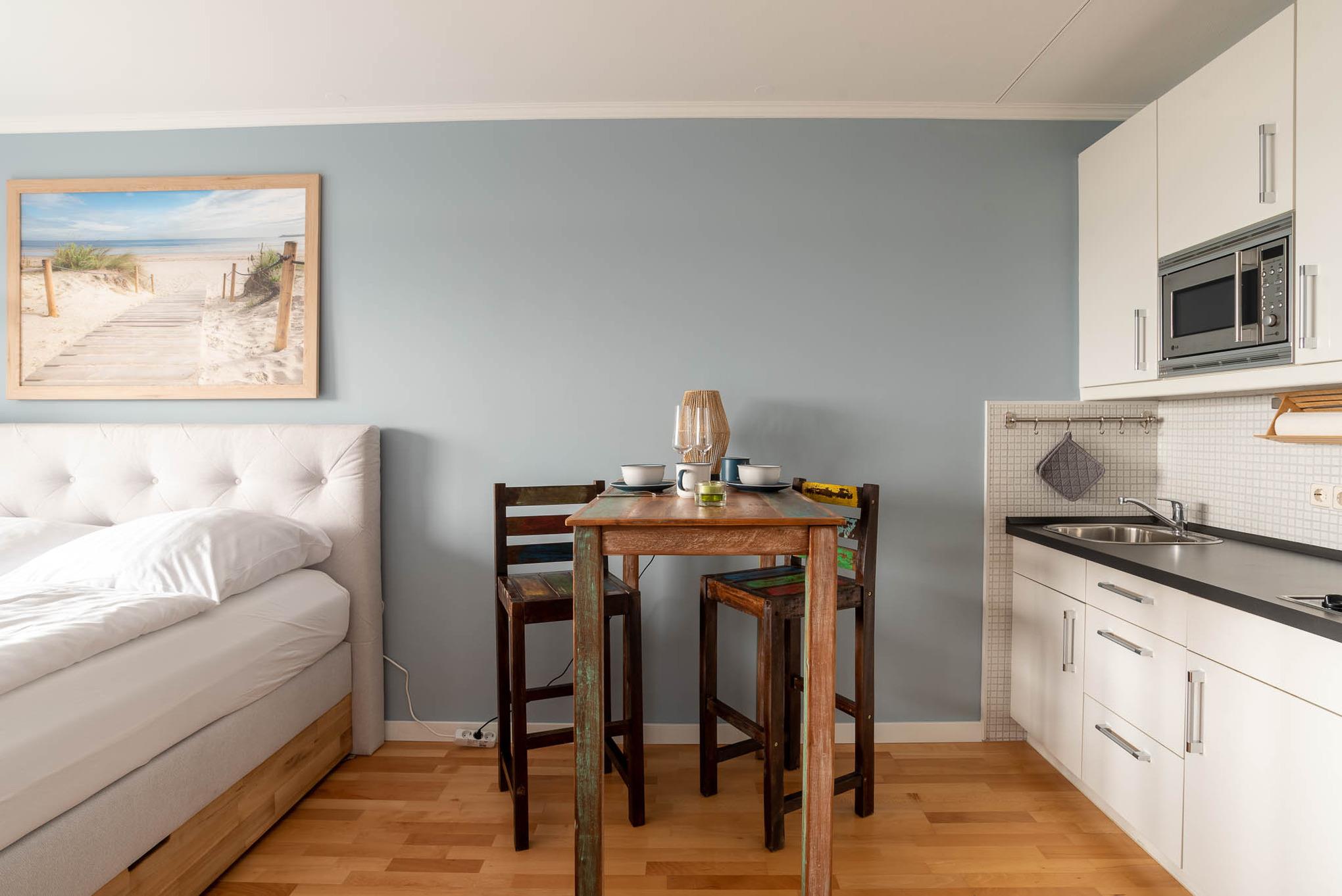 Die angrenzende offene Einbauküche hat folgende Ausstattung: ein Kühlschrank, ein Cerankochfeld mit zwei Kochfeldern, sowie eine Mikrowelle. Hinzu kommen eine Kaffeemaschine, Toaster, Wasser-, und Eierkocher. Einem gemütlichen Frühstück kann nichts im Wege stehen. Hierfür steht im Appartement ein Bartisch mit zwei Barhockern. Auch der Balkon ist mit Gartenmöbeln ausgerüstet.