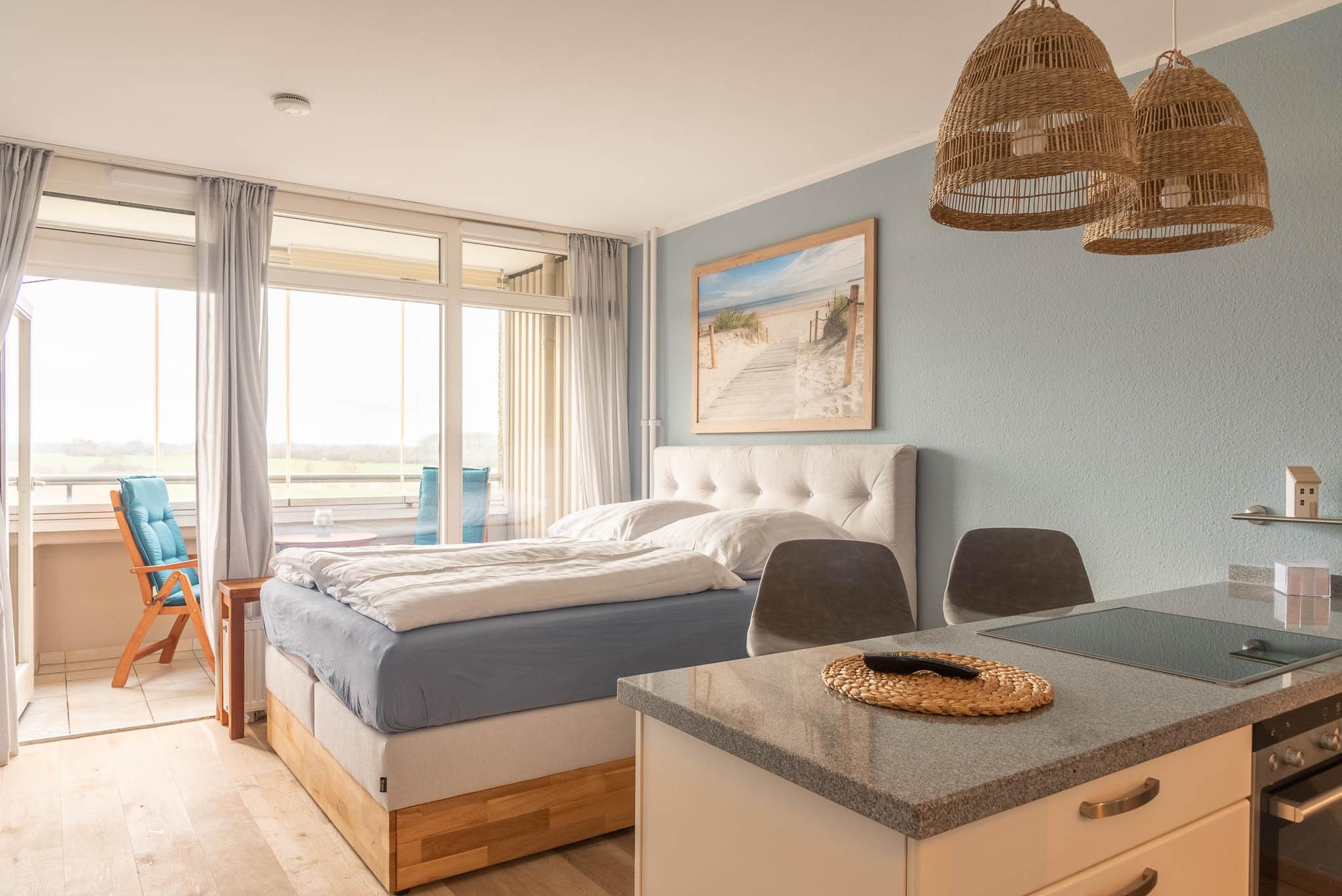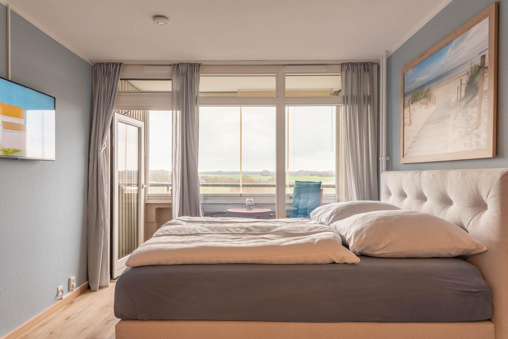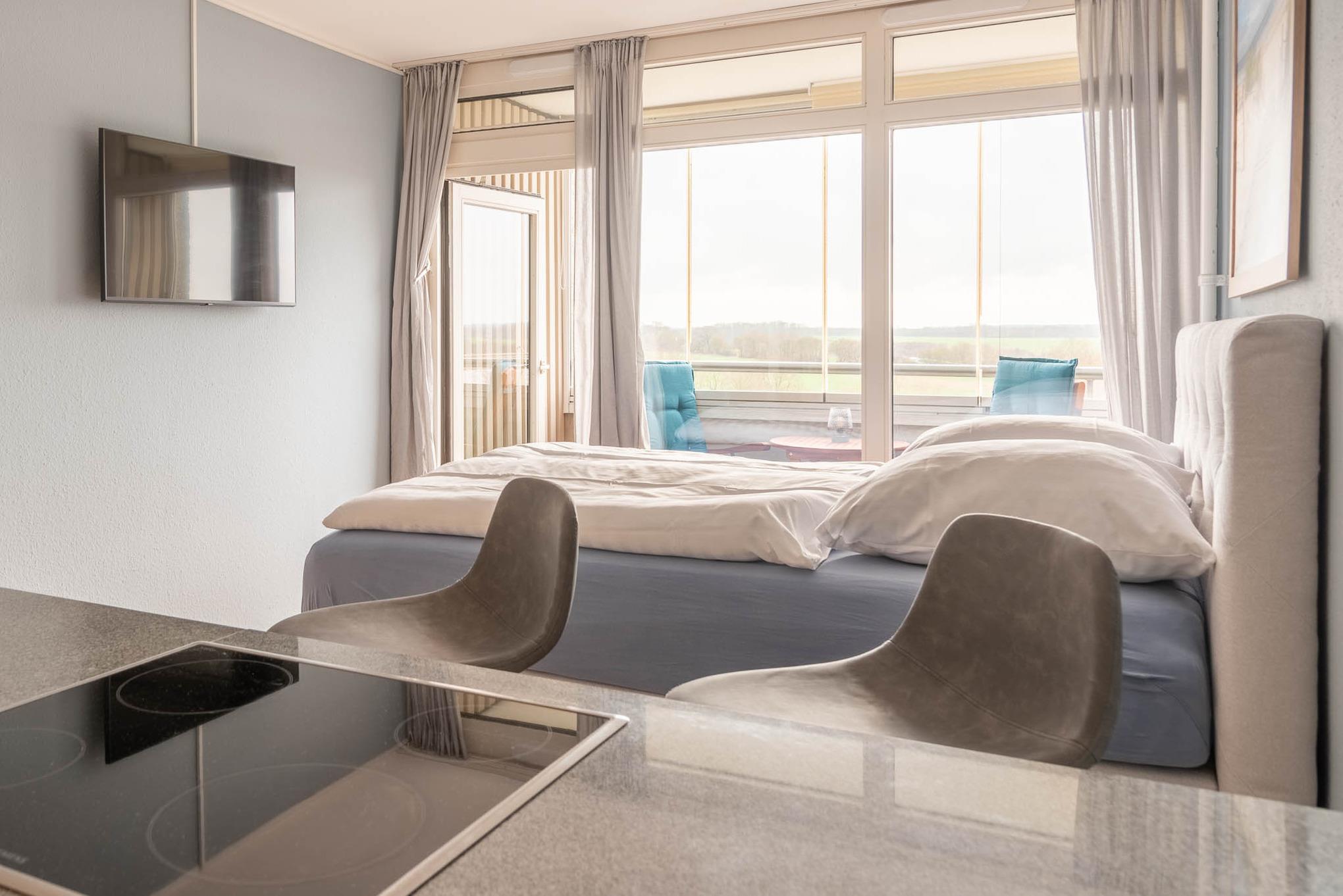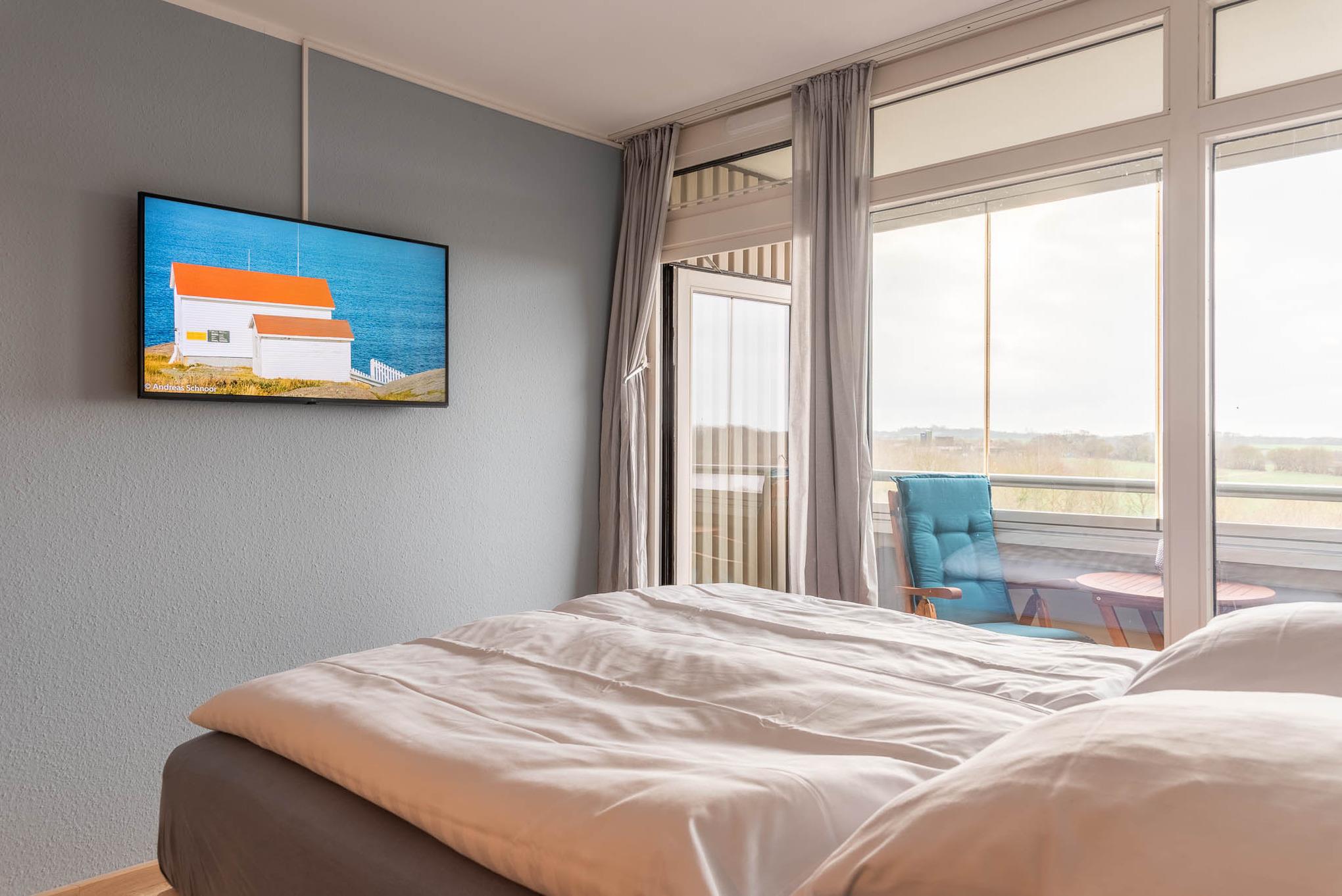Im freundlichen Appartment befindet sich ein bequemes Boxspringbett (Liegefläche von 160x200 cm). An der Wand gegenüber ist ein LCD- Fernseher angebracht.