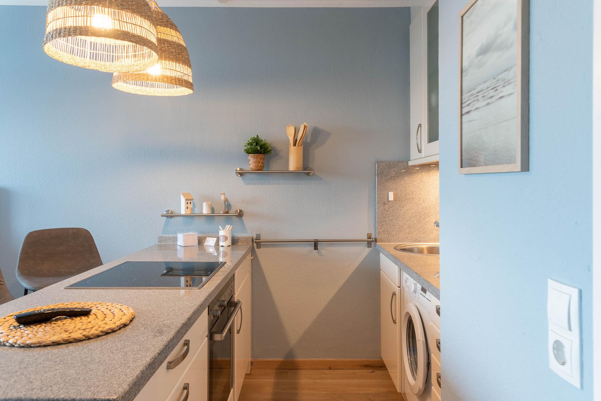 Die angrenzende offene Einbauküche besticht mit ihrer guten Ausstattung: ein Kühlschrank, ein Cerankochfeld mit vier Kochfeldern, sowie ein Backofen findet sich in der gepflegten Küchenzeile. Hinzu kommen eine Kaffeemaschine, Toaster und einen Wasserkocher. Einem gemütlichen Frühstück kann nichts im Wege stehen. Der Balkon ist mit Gartenmöbeln ausgerüstet.