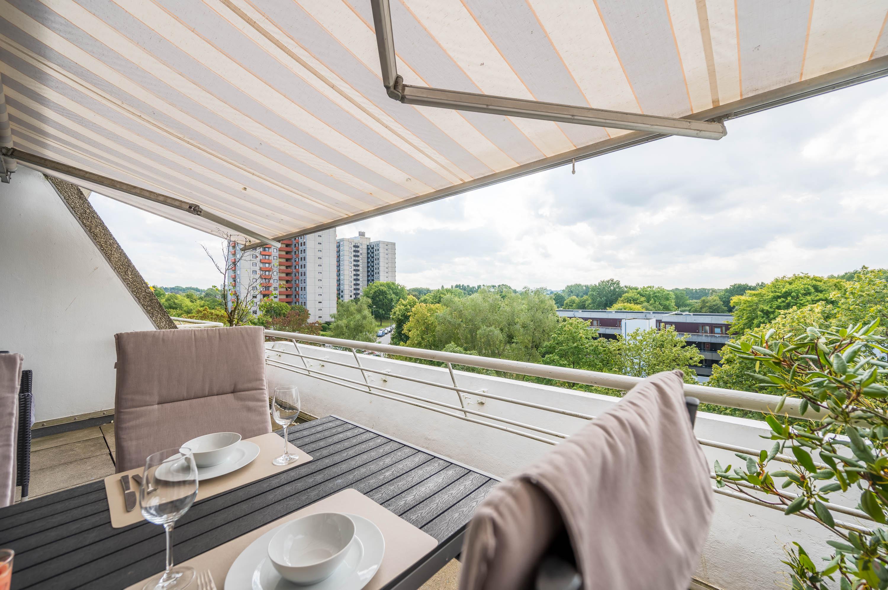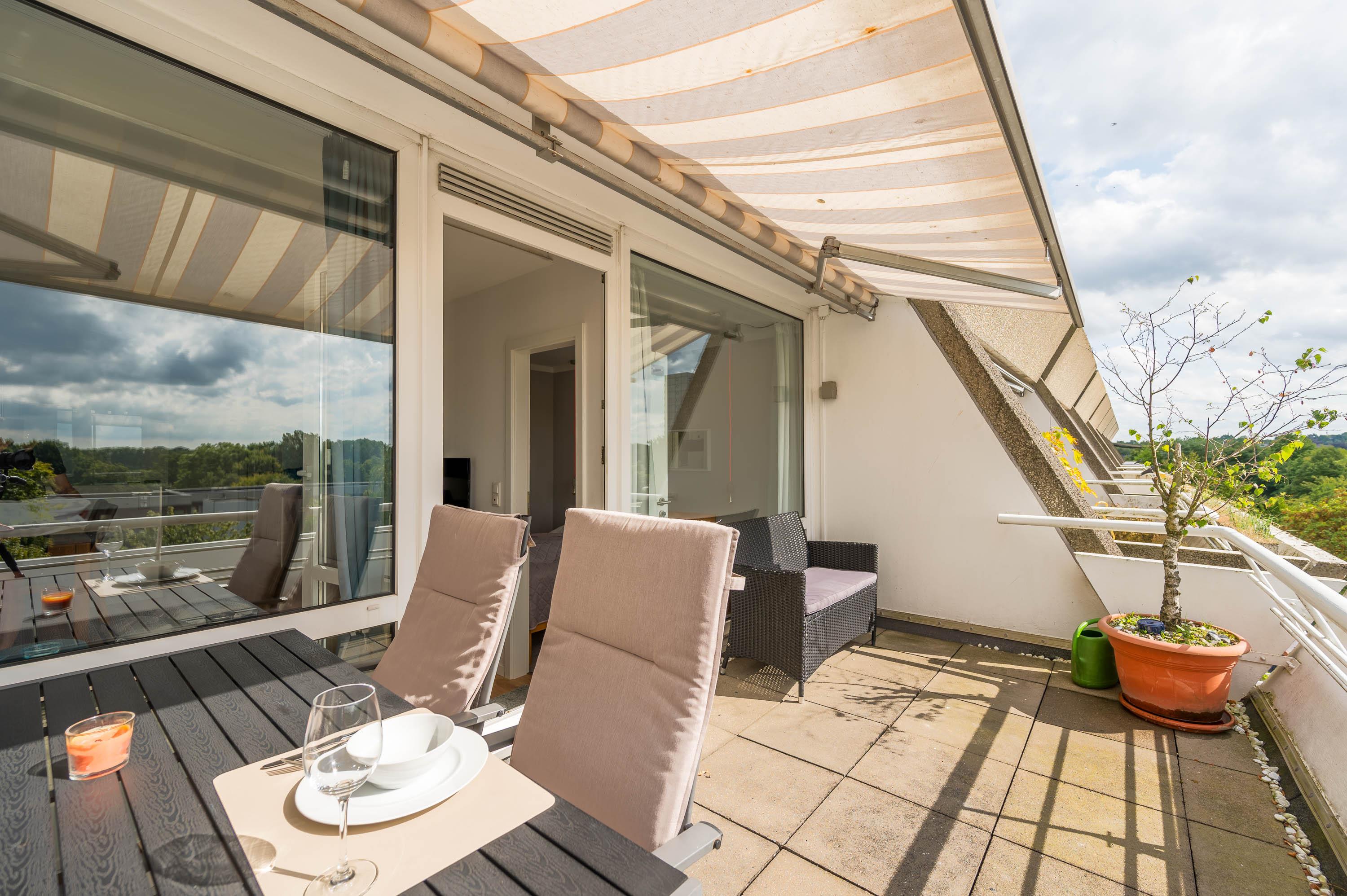 Der Balkon, welcher sich über die gesamte Breite des Apartments verläuft, ist mit Tisch und Stühlen sowie einer Markise ausgestattet. Durch die südwestliche Lage können Sie auch abends die Sonne in vollen Zügen genießen.