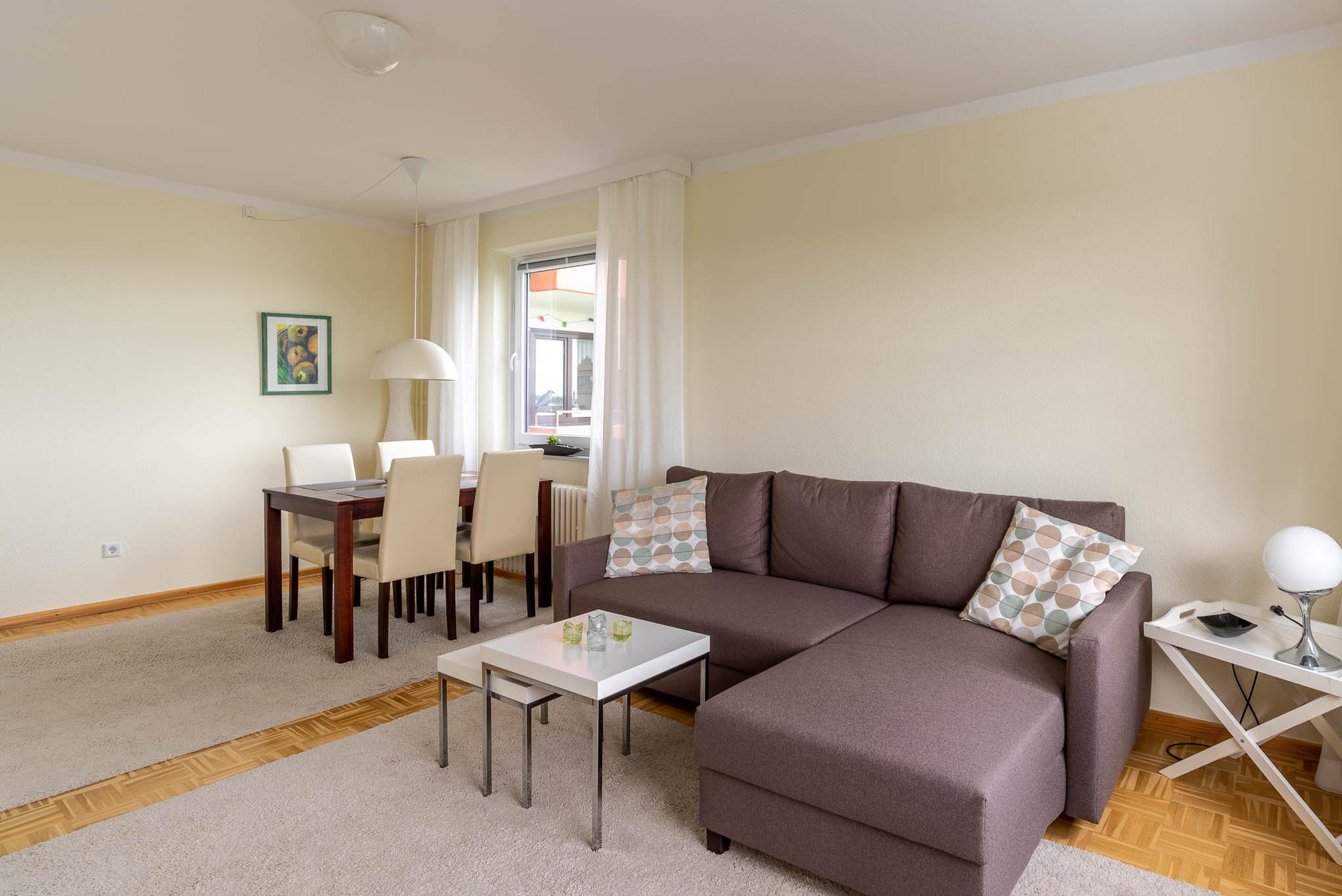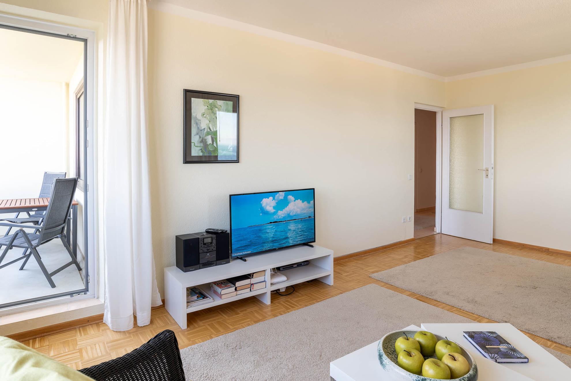 Die renovierte Ferienwohnung ist modern und einladend gestaltet. Im Wohn- und Essbereich sorgen ein hochwertiger Parkettboden, ein bequemes Sofa sowie eine Stereoanlage und ein Flachbildfernseher für gemütliche Stunden. Der große Esstisch bietet Platz für bis zu vier Personen. Vom Wohnraum aus gelangen Sie auf den 8 m² großen Balkon mit Süd-Ost-Ausrichtung. Hier laden Meerblick, Gartenmöbel und die morgendliche Sonne zum Verweilen ein.