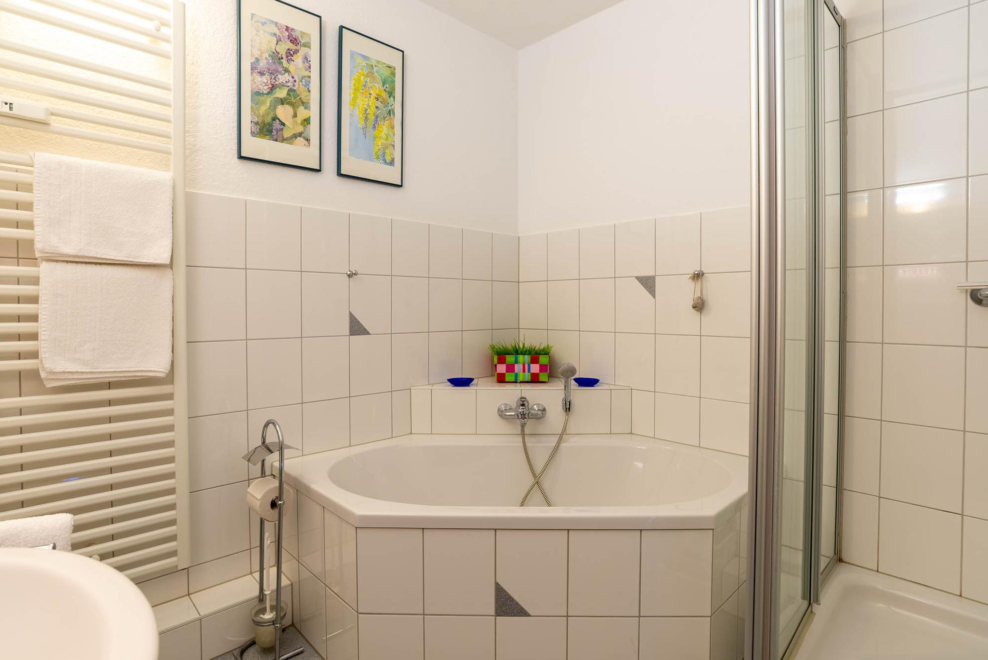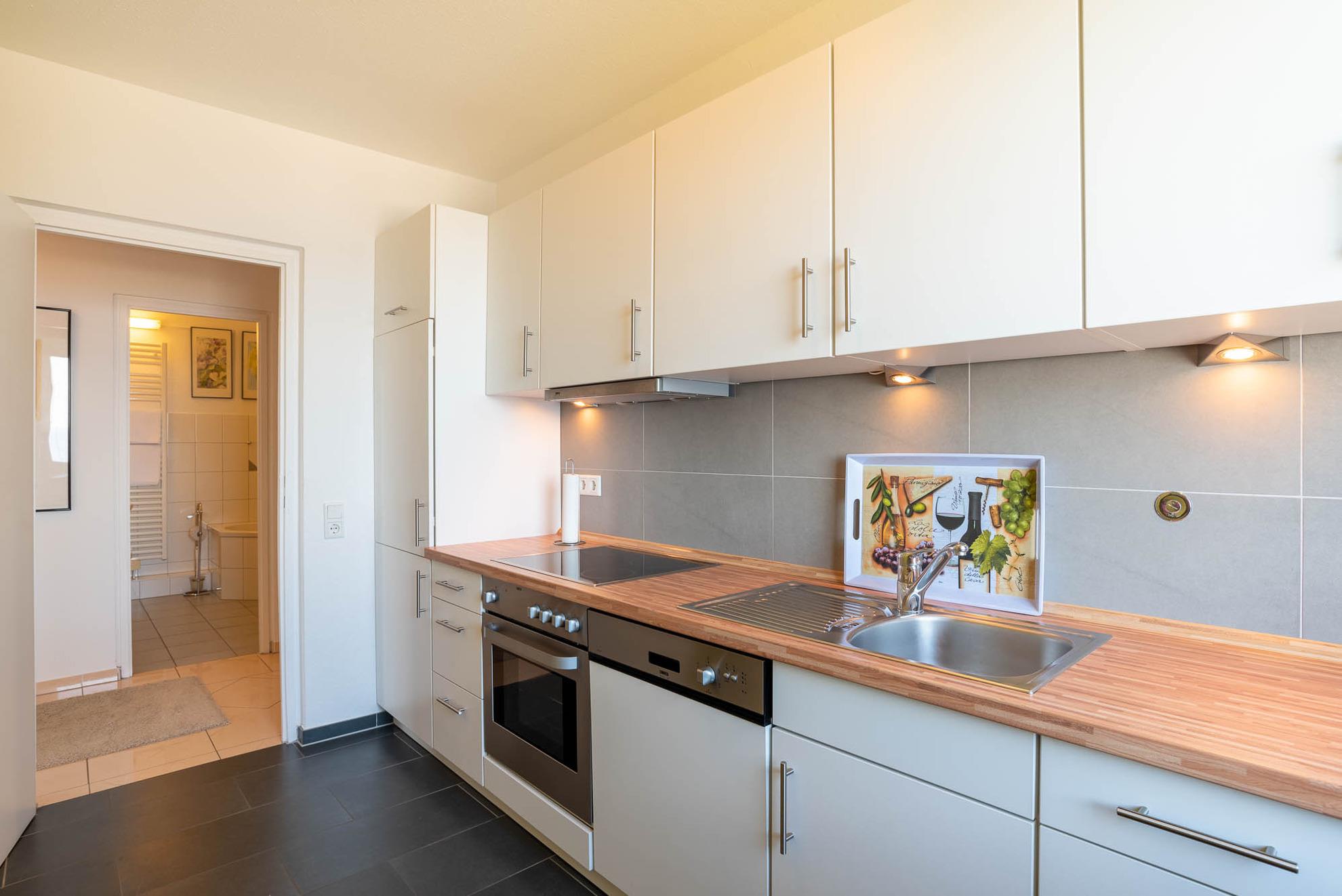 Die voll ausgestattete Einbauküche bietet alles, was Sie für die Zubereitung Ihrer Mahlzeiten benötigen: Backofen, Kühlschrank mit Gefrierfach, Geschirrspüler und Mikrowelle. Das gepflegte Badezimmer verfügt über eine Eckbadewanne sowie eine separate Dusche. Eine kleine Abstellkammer im Flur sorgt für zusätzlichen Stauraum.