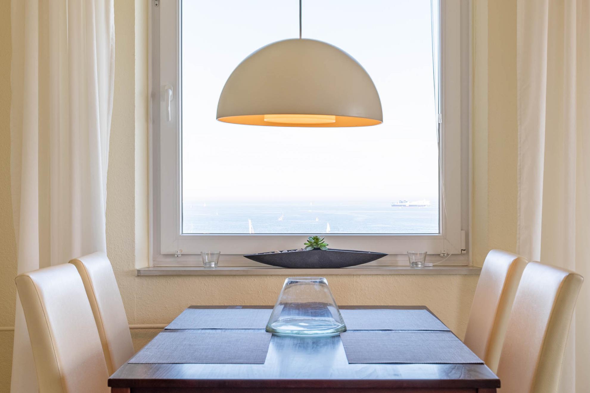 Wie der Name „Falkenhorst“ bereits andeutet, befindet sich die Wohnung in luftiger Höhe, die Sie bequem mit dem Fahrstuhl des Hauses erreichen können. Der Ausblick lohnt sich: Ob beim Kochen, Essen oder Entspannen – von jedem Fenster aus genießen Sie den Blick auf das Wasser und die vorbeiziehenden Schiffe. Beobachten Sie den regen Schiffsverkehr in Richtung Bülker Leuchtturm, überblicken Sie den Olympiahafen oder lassen Sie Ihren Blick vom Wohnzimmer und Balkon bis zum Ehrenmal in Laboe schweifen.
