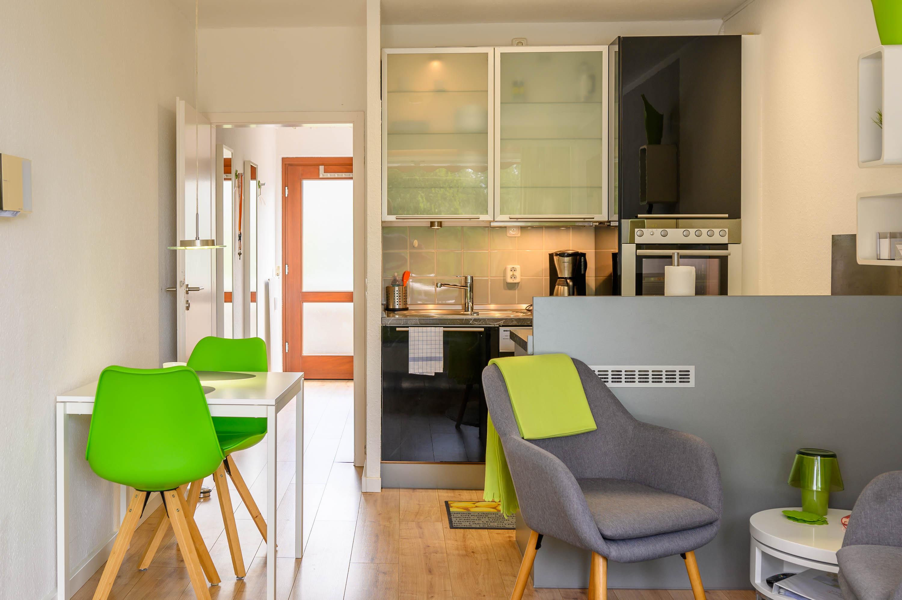 Die mit einer halbhohen Wand abgetrennte moderne Einbauküche hat ein Cerankochfeld, eine Geschirrspülmaschine, sowie einen Kühlschrank mit Gefrierfach. Eine Besonderheit ist der Backofen in erhöhter Position.