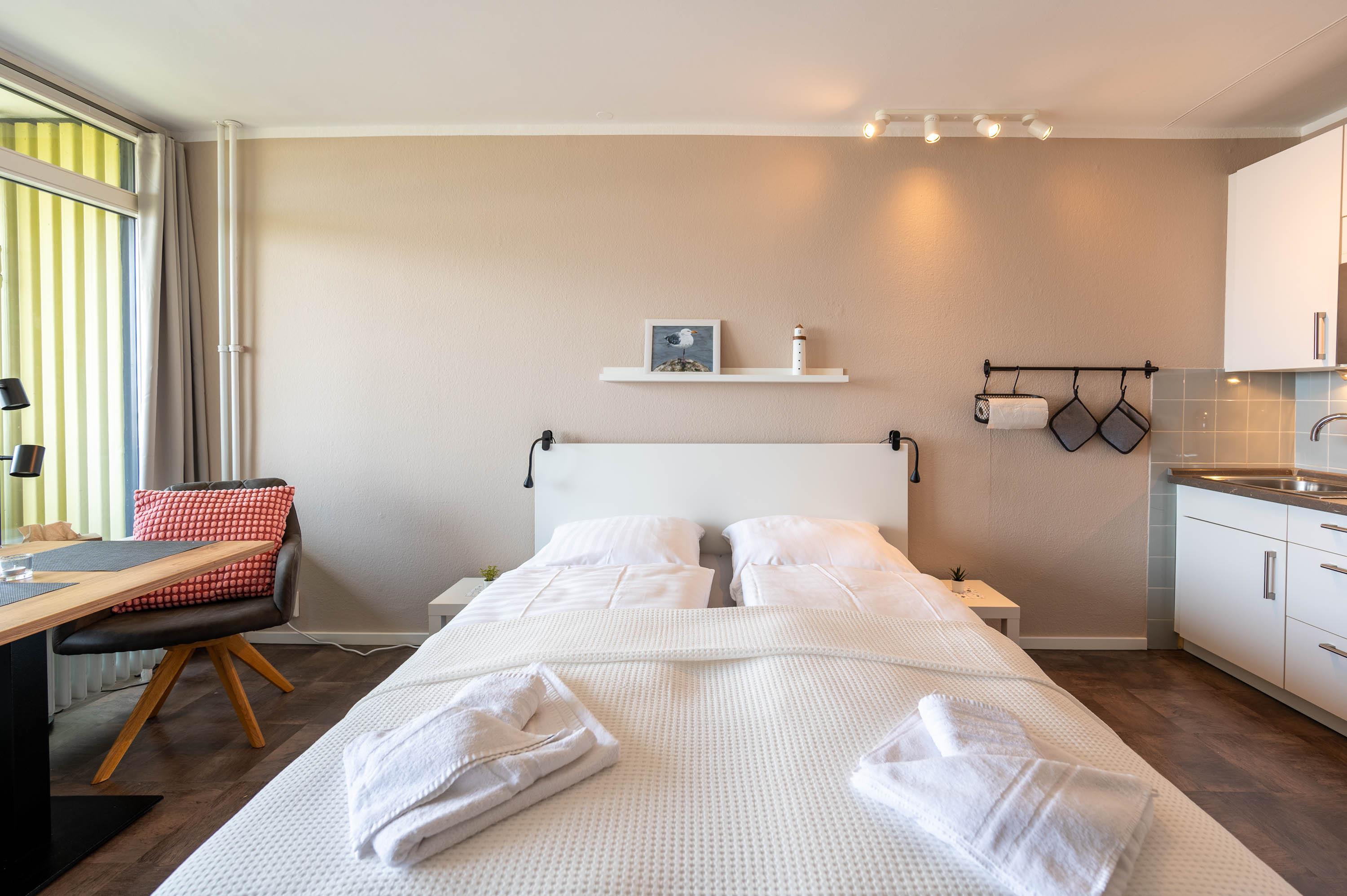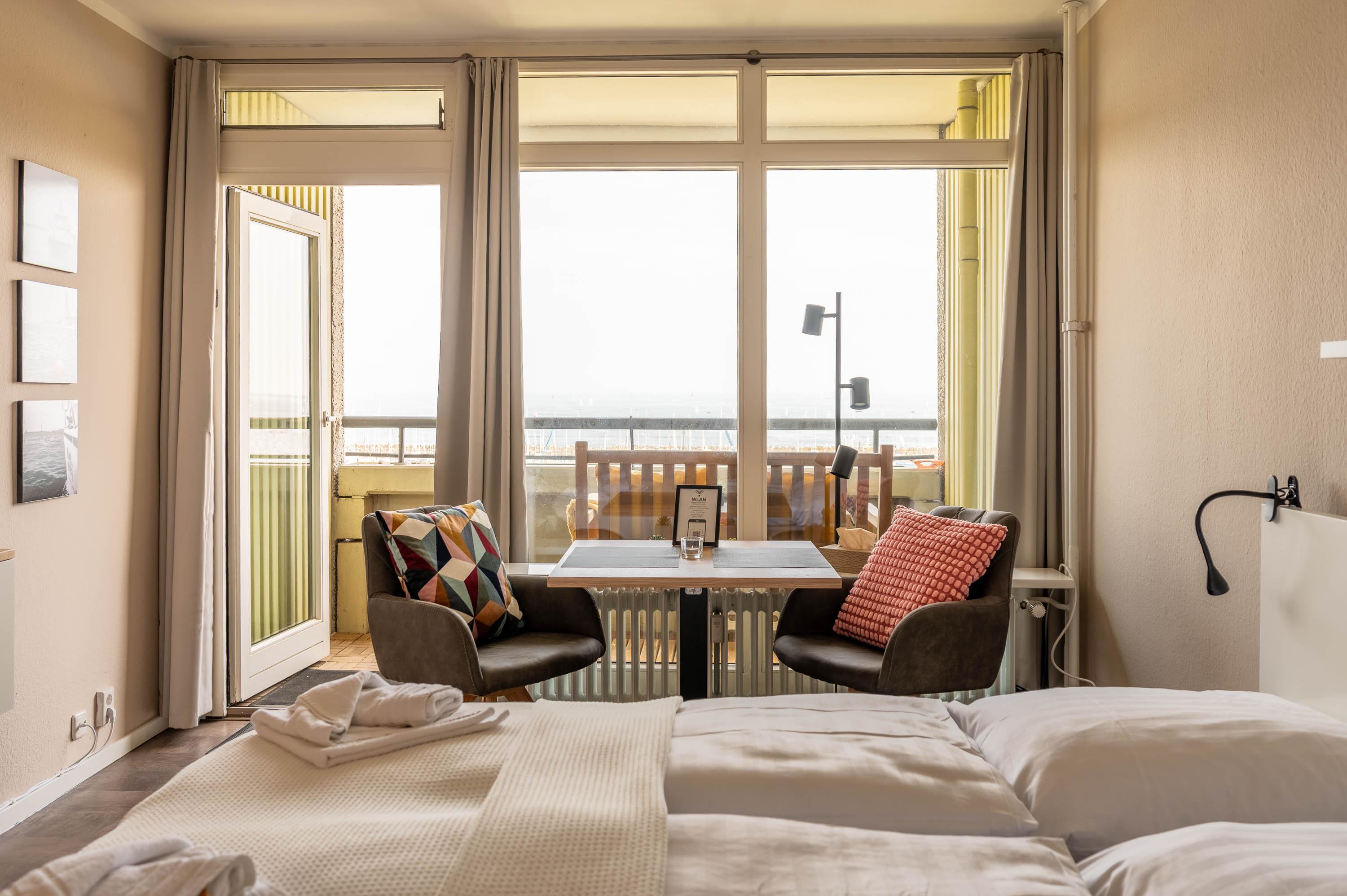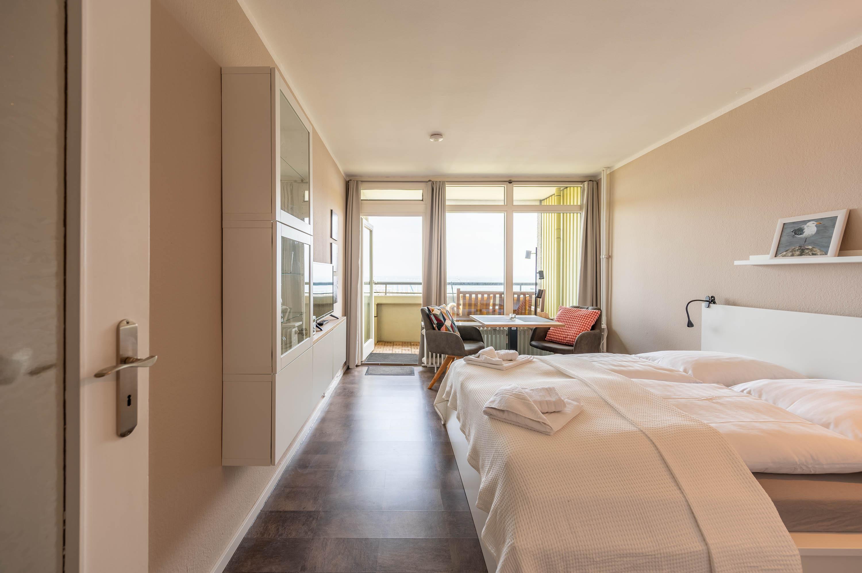 Neben einer großen Fensterfront, die direkt auf den Balkon führt, lässt auch die hell gestrichene Wand die Ferienwohnung freundlich erscheinen. Neben dem Doppelbett ( 160 x 200) verfügt das Apartment über einen Esstisch, welcher mit Blick auf das Meer ausgerichtet ist, sowie ein Radio und Fernseher für gemütliche Abende. Die Wohnung lässt sich bei Bedarf abdunkeln.