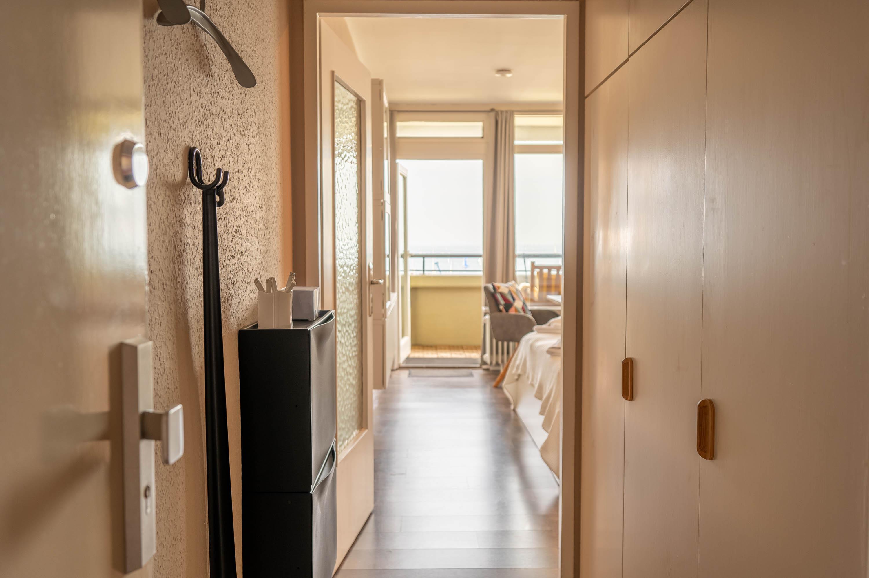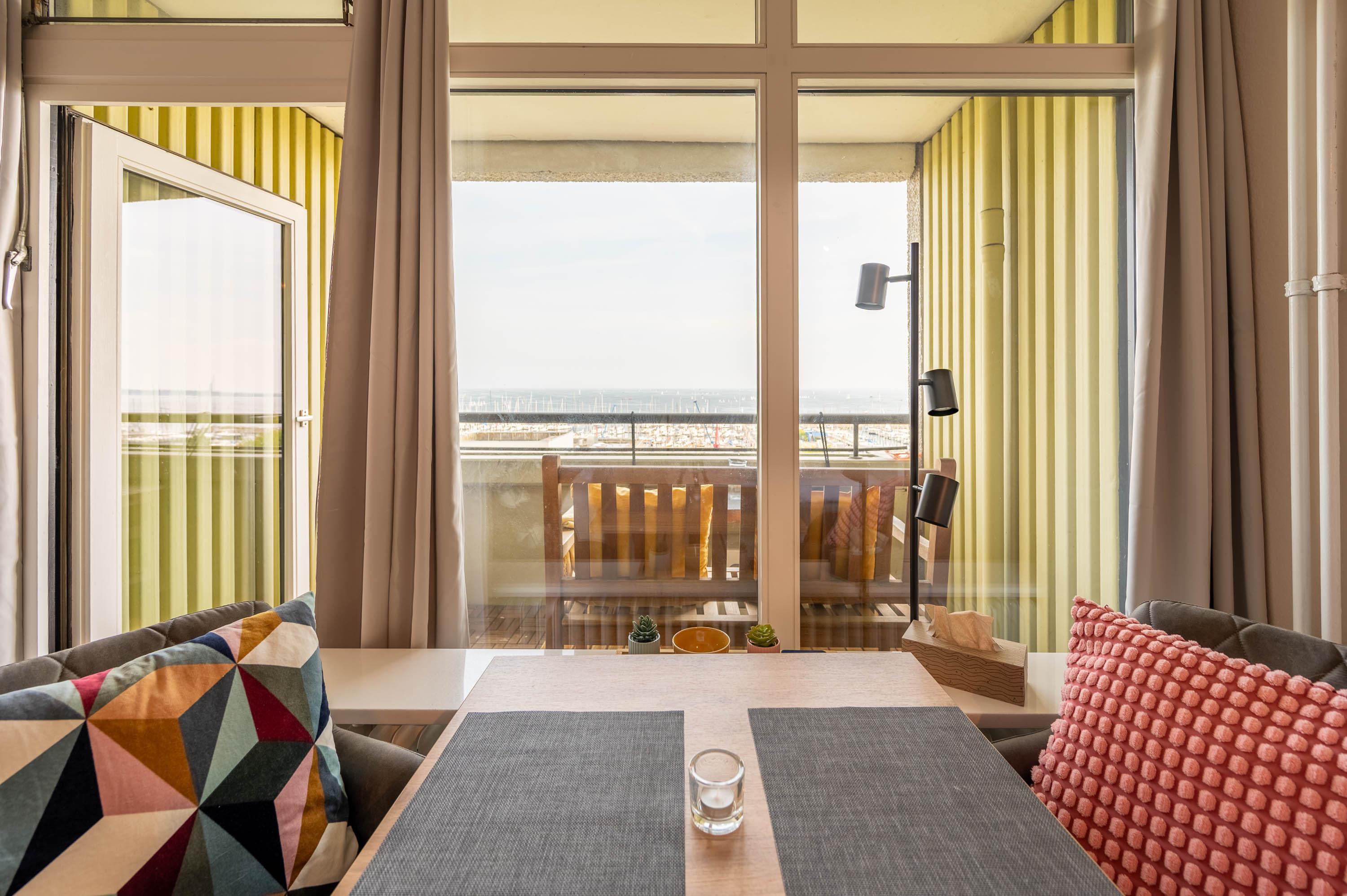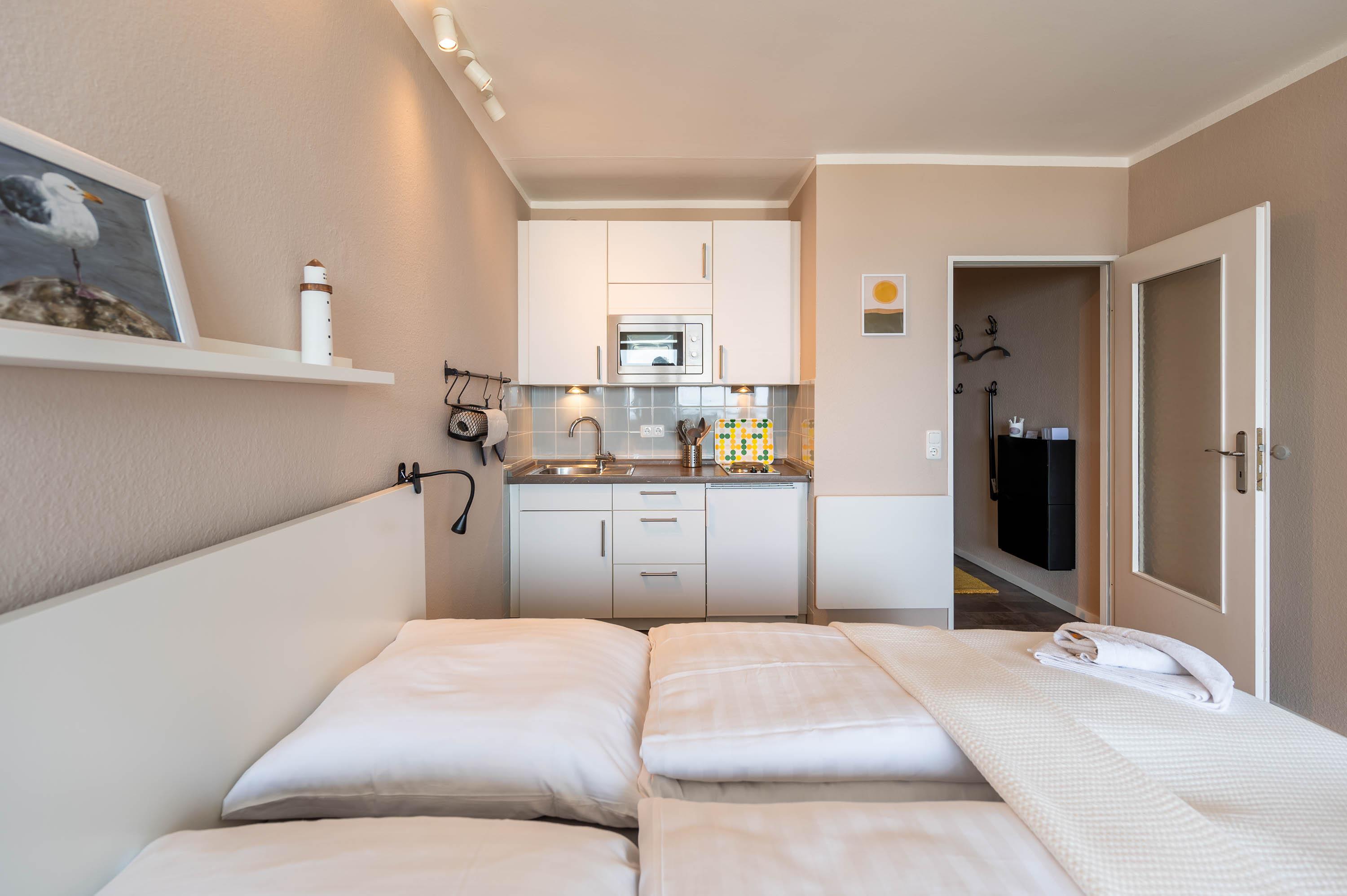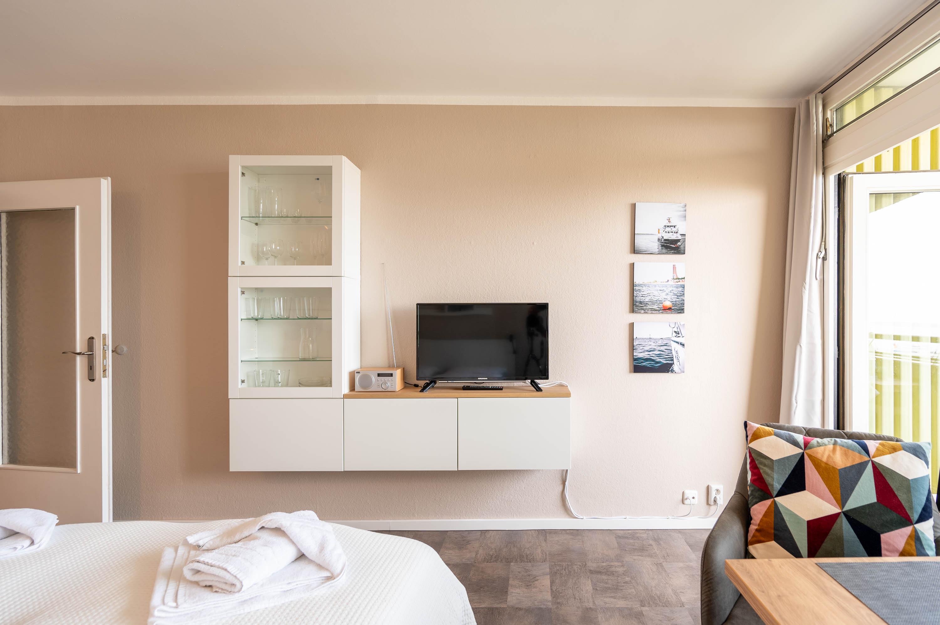 Neben einer großen Fensterfront, die direkt auf den Balkon führt, lässt auch die hell gestrichene Wand die Ferienwohnung freundlich erscheinen. Neben dem Doppelbett ( 160 x 200) verfügt das Apartment über einen Esstisch, welcher mit Blick auf das Meer ausgerichtet ist, sowie ein Radio und Fernseher für gemütliche Abende. Die Wohnung lässt sich bei Bedarf abdunkeln.