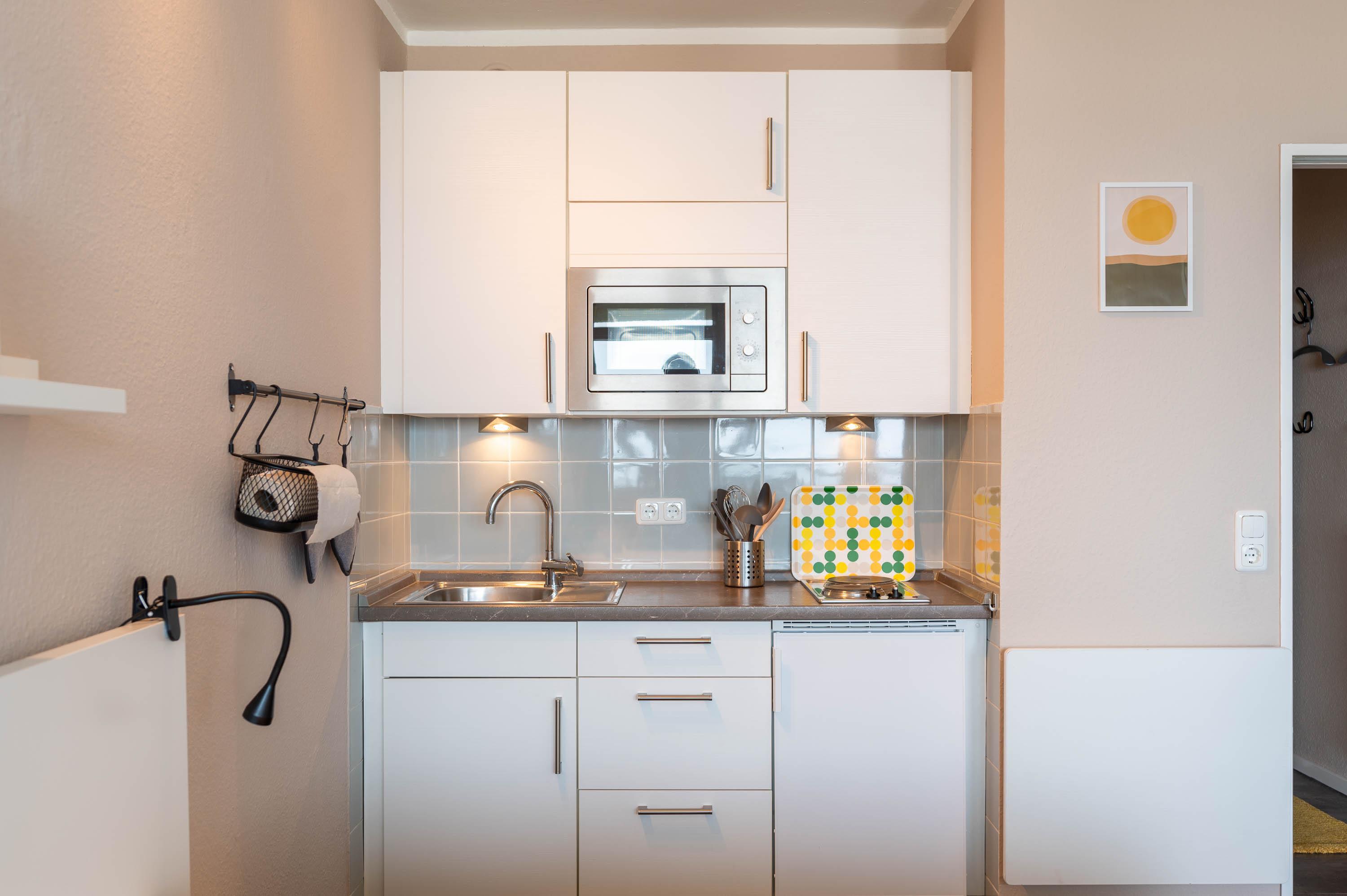 Die zum Wohn-, und Essbereich angrenzende Küchenzeile ist für den täglichen Bedarf ausgestattet. Ein Kühlschrank mit integriertem Gefrierfach sowie einem Herd und Mikrowelle stehen für Sie zur Verfügung.