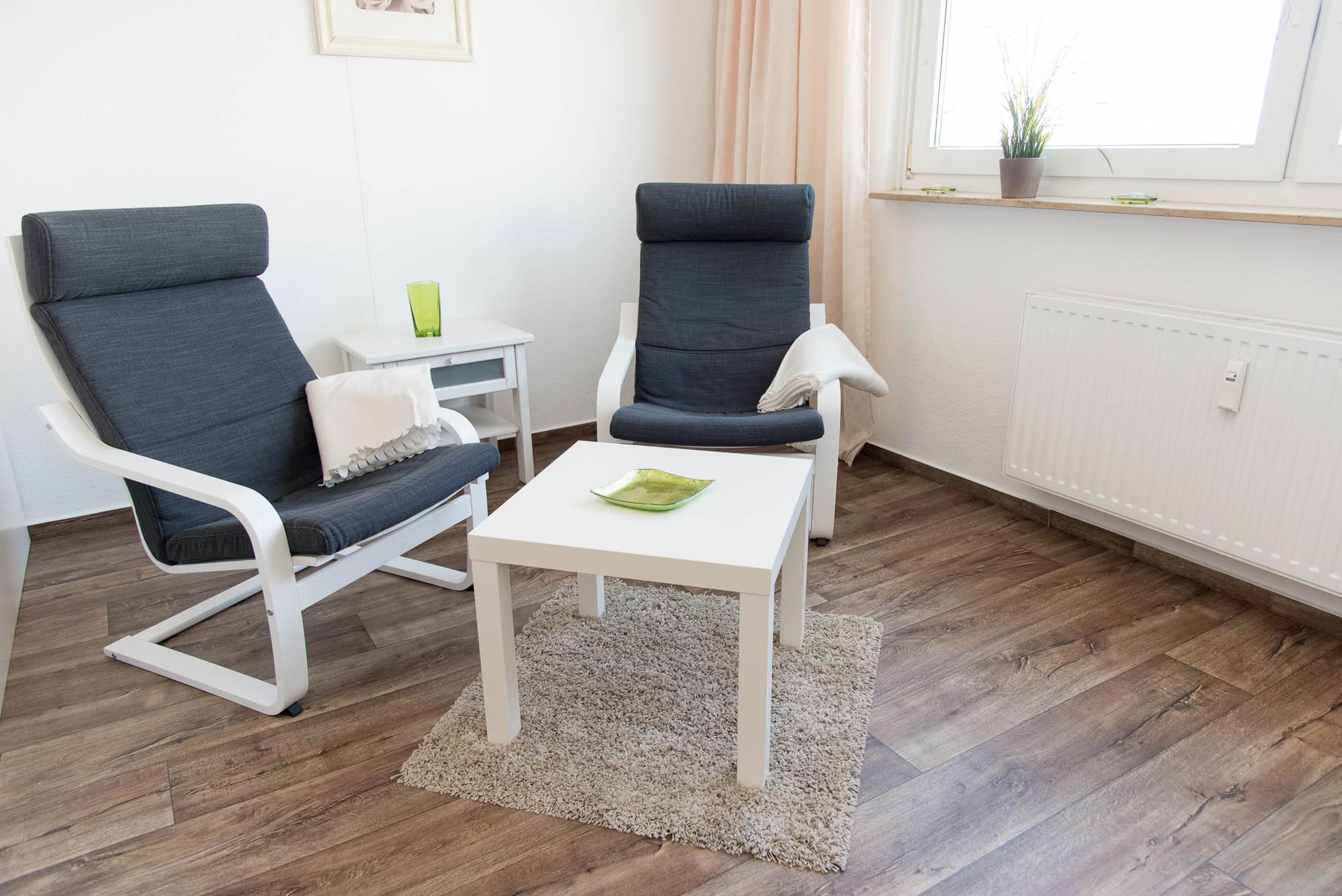Diese helle 1 Zimmer-Wohnung für bis zu 2 Personen wurde renoviert und ist modern eingerichtet. Sie befindet sich im Ortsteil Kiel- Schilksee. Der Wohn- und Essbereich ist mit Laminatfußboden ausgelegt. Auf 46qm Wohnfläche befindet sich ein gemütliches Doppelbett. Es bietet eine Liegefläche von 160x200 cm. Davor befinden sich zwei Sessel, sowie ein kleiner Couchtisch. Die Studiowohnung verfügt über eine Stereoanlage und einen LCD- Fernseher mit Kabelanschluss. Die Einbauküche ist funktional mit Cerankochfeld, Backofen, Kühlschrank eines Gefrierfachs, Kaffeemaschine, Toaster und Wasserkocher ausgestattet.