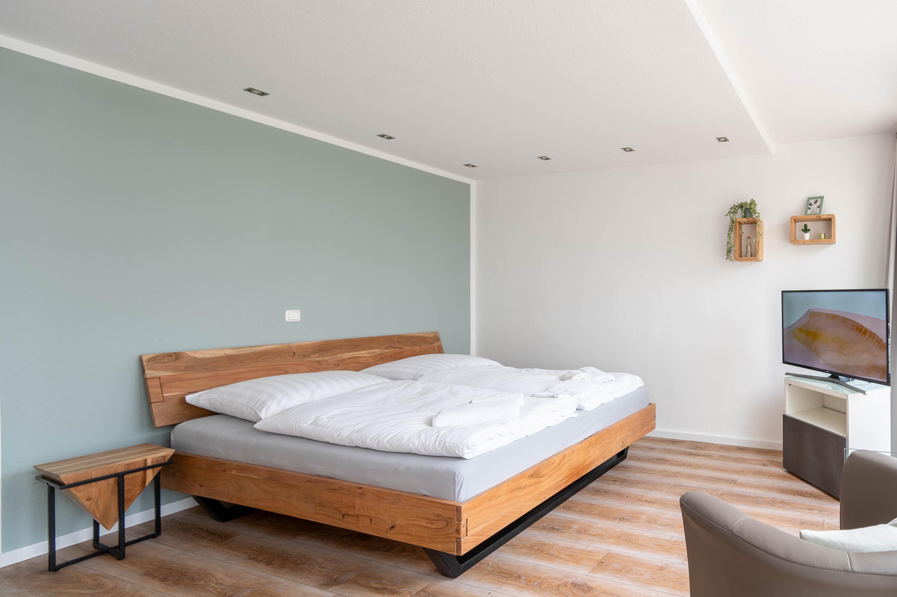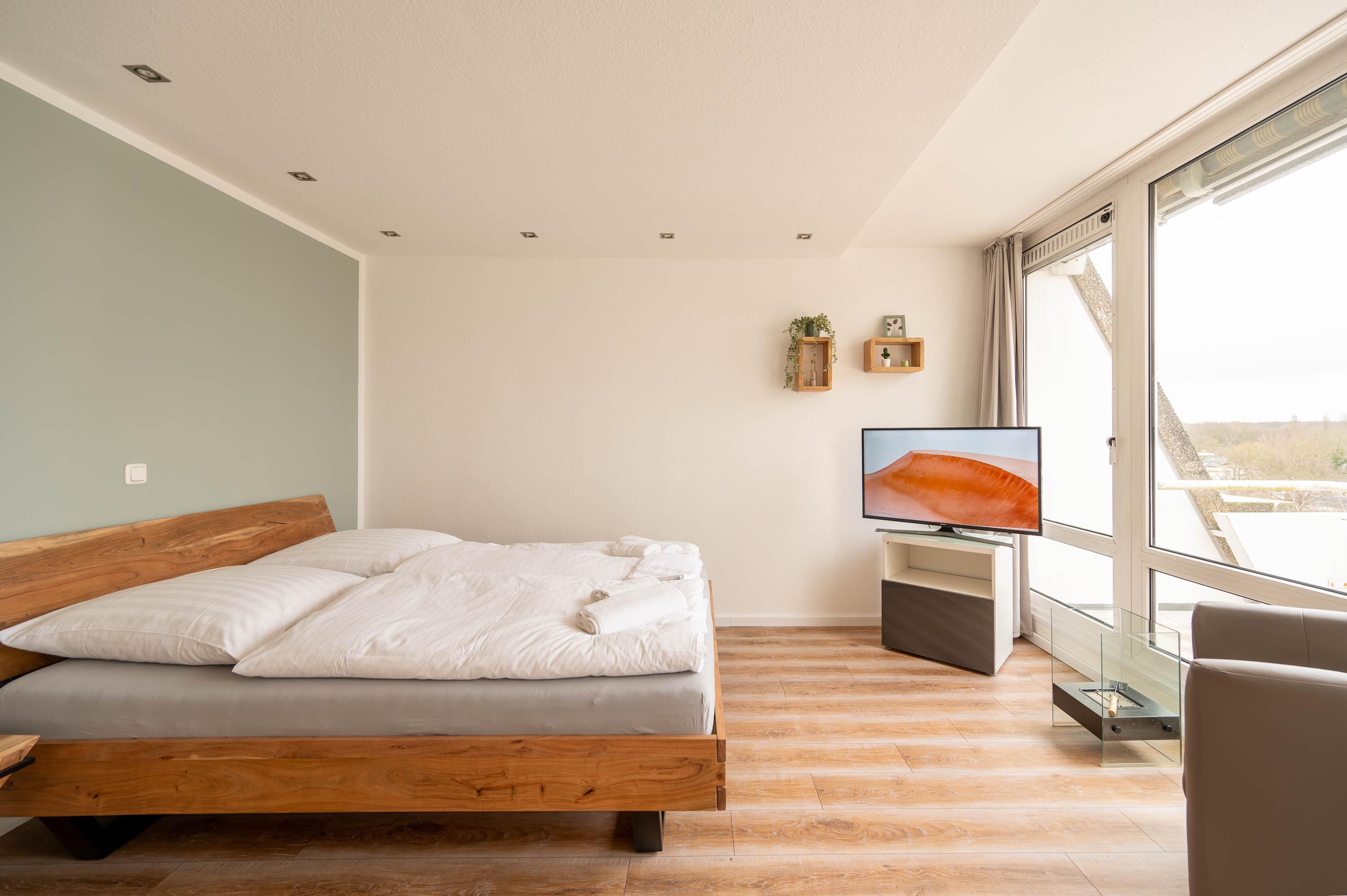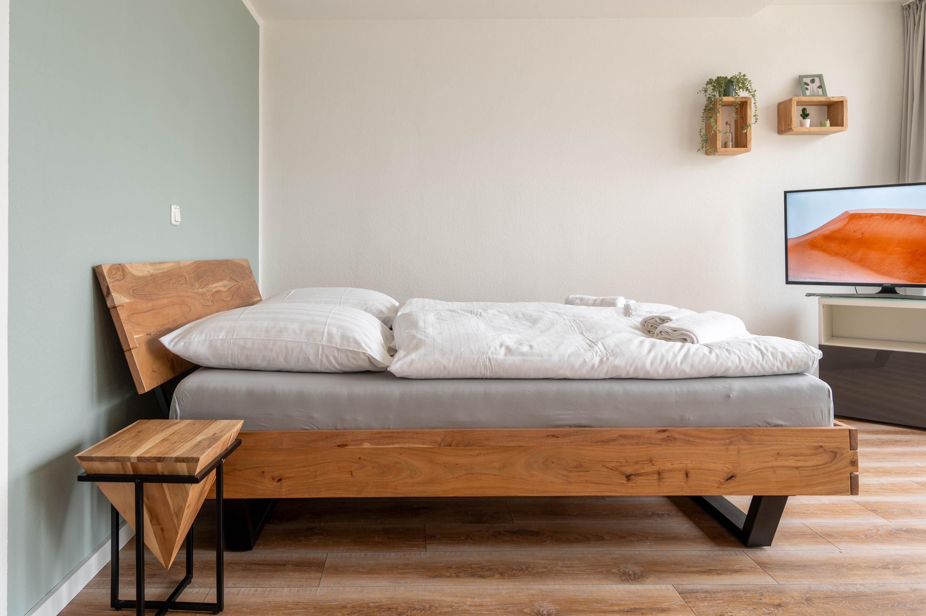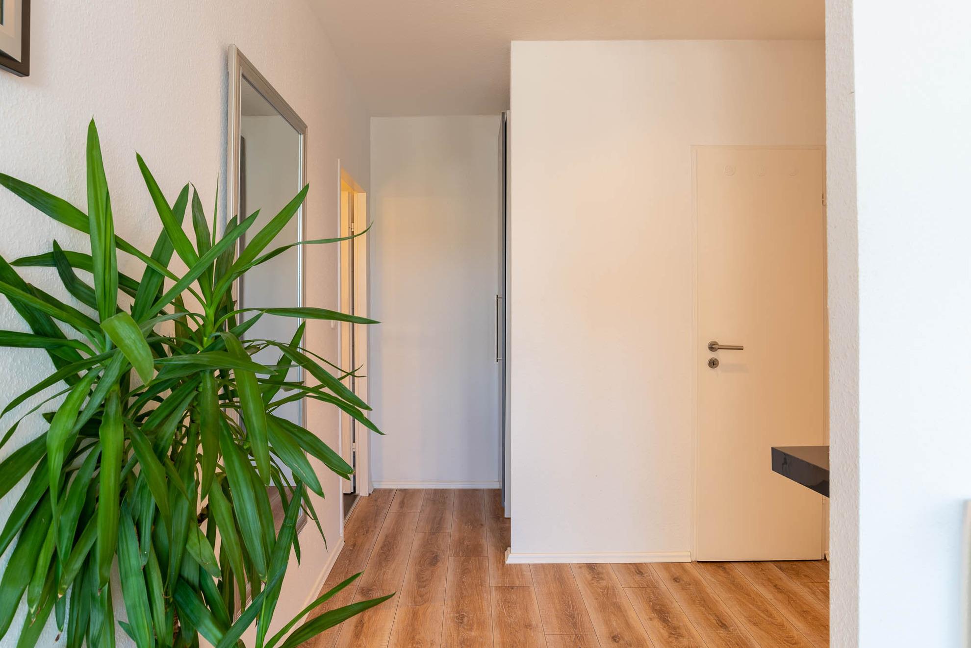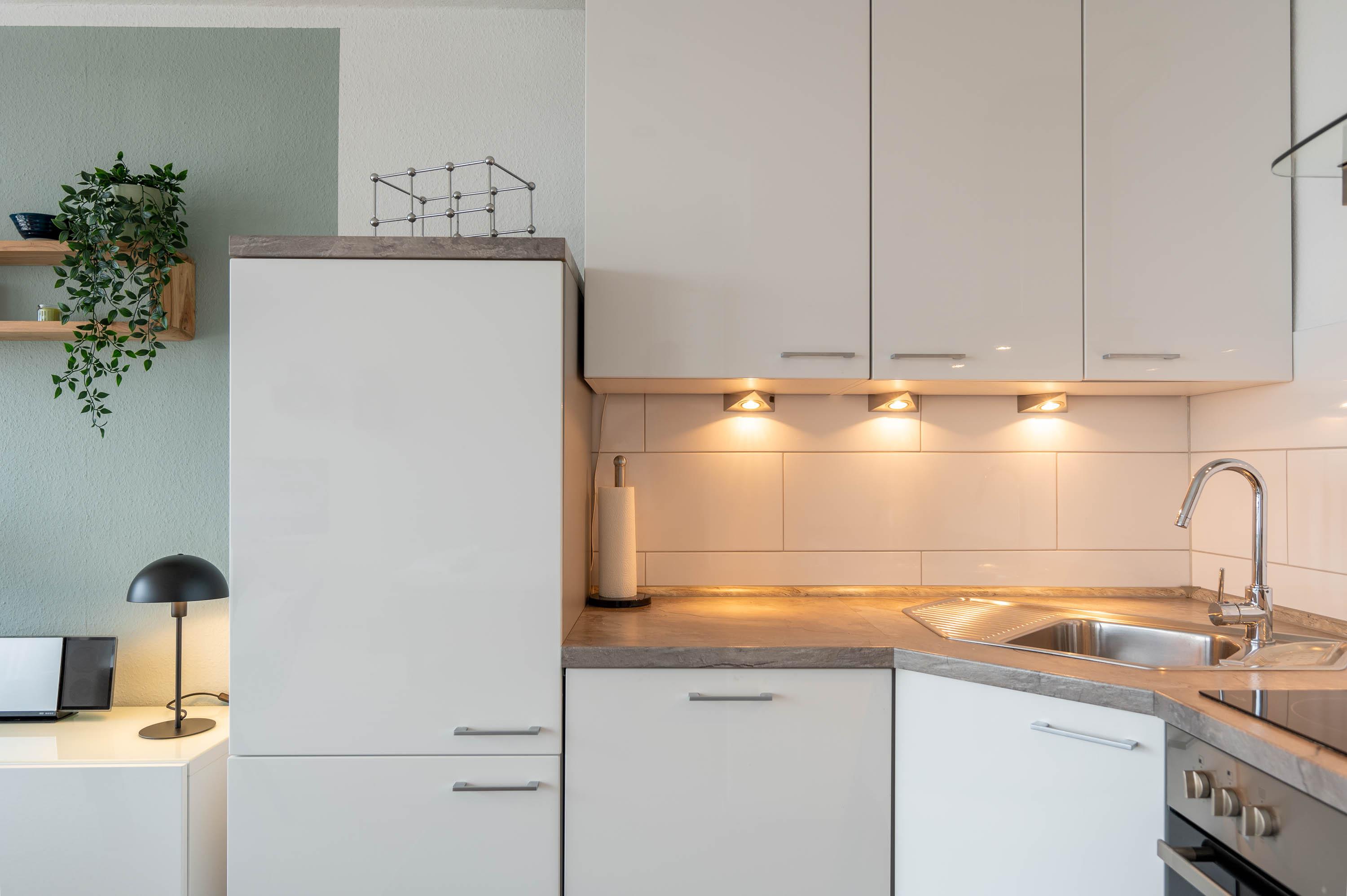 Die moderne Küche ist komplett eingerichtet, und hat alles, was man zum Kochen braucht: Es befindet sich in der Küche eine Geschirrspülmaschine, ein Backofen, ein Kühlschrank mit Gefrierfach und ein Herd. Gläser, Porzellan, Töpfe und Besteck sind für 4 Personen vorhanden. Die Ferienwohnung hat ein gemütliches Doppelbett (Liegefläche 160x200). Die Betten sind bei Ihrer Ankunft bezogen. Im Flur befindet sich ein Kleiderschrank mit Garderobe und eine kleine Abstellkammer.
