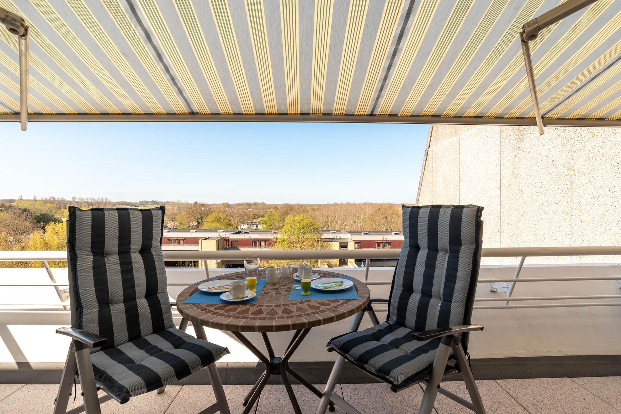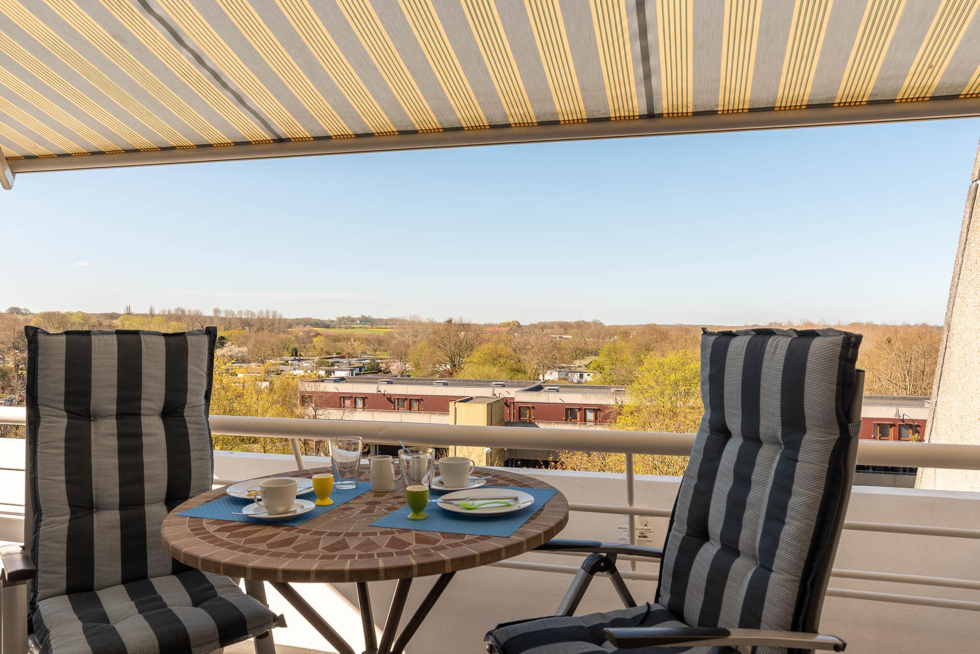 Zu dieser Wohnung gehört ein 9 qm großer Balkon mit Hochlehner-Stühlen, ein Tisch und eine Markise. Der freie Blick zu den Salzwiesen ist ruhig und Sie können den ganzen Tag die Sonne genießen (Süd-West-Lage).