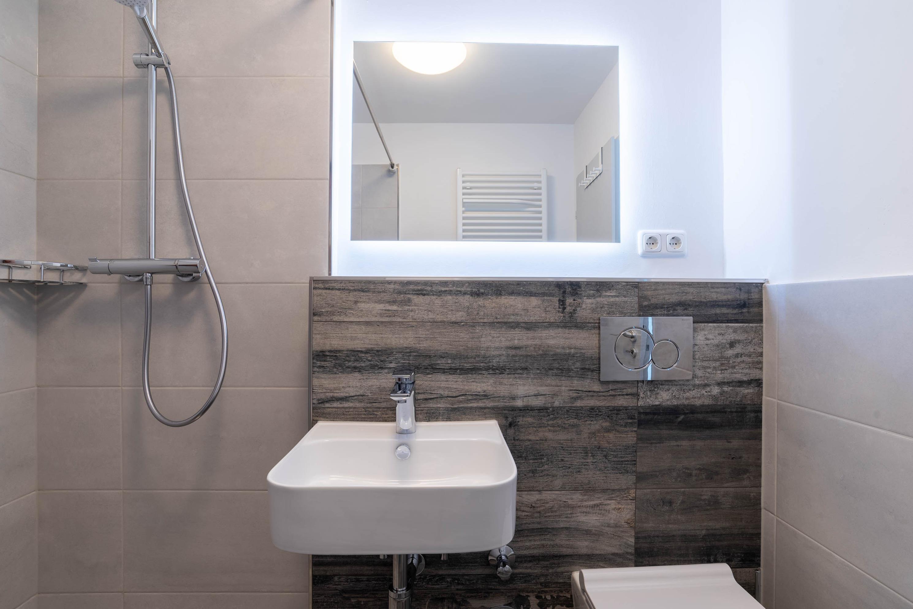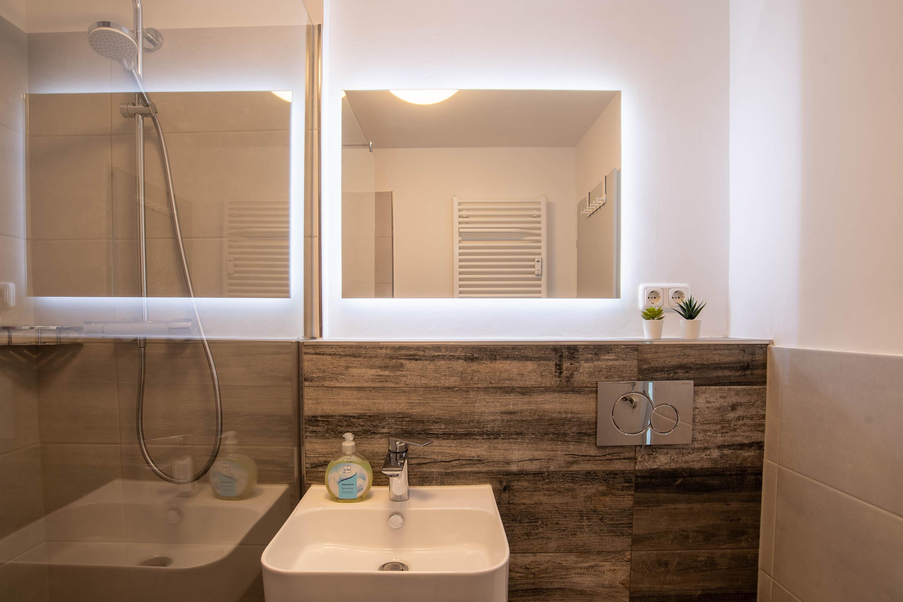 Das Appartment wurde mit viel Liebe zum Detail eingerichtet. Schon der große Eingangsbereich lädt ein sich direkt wie zu Hause zu fühlen. Ein Kleiderschrank und die Flurgarderobe bieten ausreichend Verstau- und Ablagemöglichkeiten. Es erwartet Sie vom Flur ausgehend ein helles, modernes Badezimmer mit großer Dusche. Durch den Flur gelangen Sie in das Wohn- und Schlafzimmer. Gleich am Eingang des Zimmers hat man einen atemberaubenden Blick auf den Hafen und Strand, welcher den Namen der Ferienwohnung alle Ehre macht.