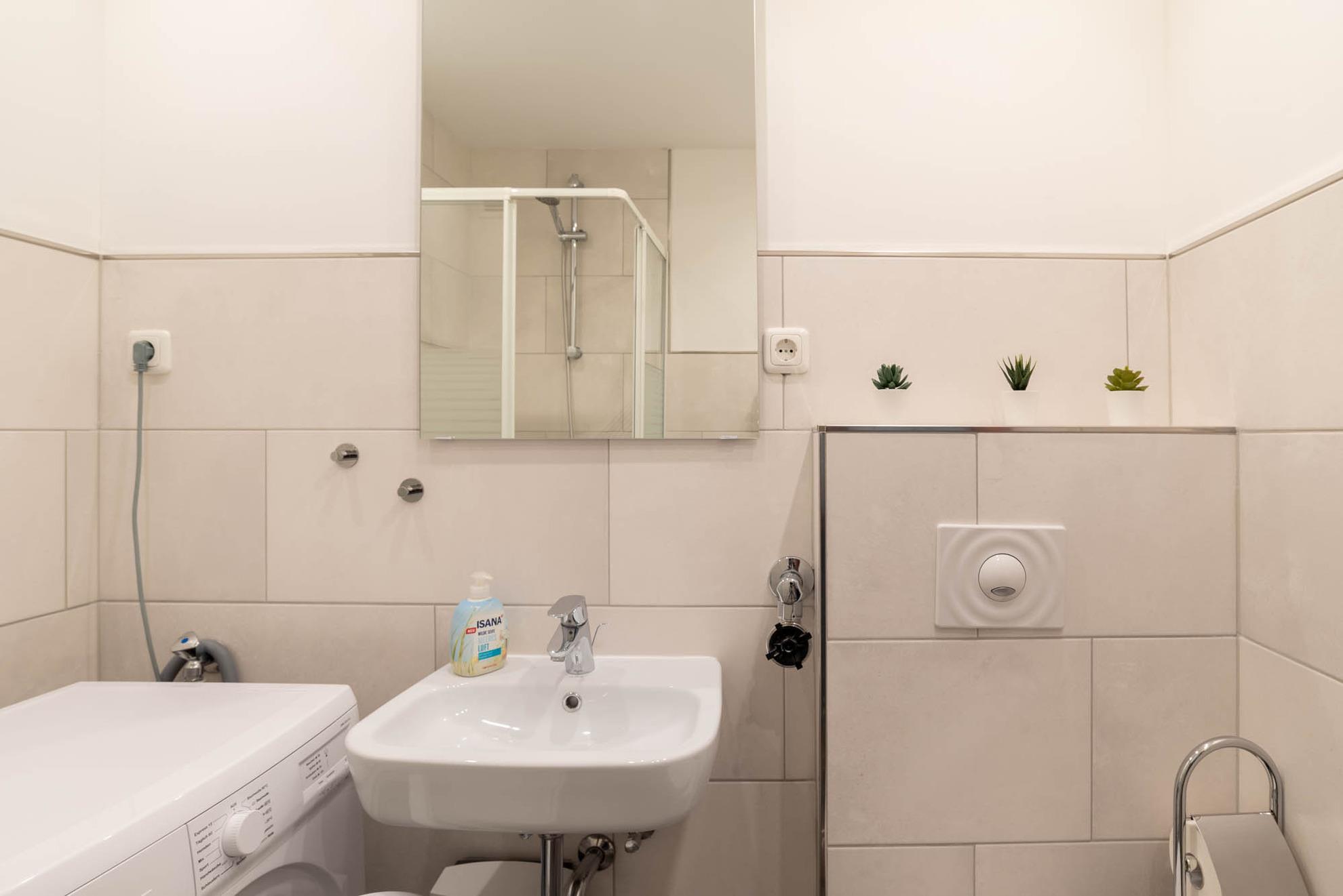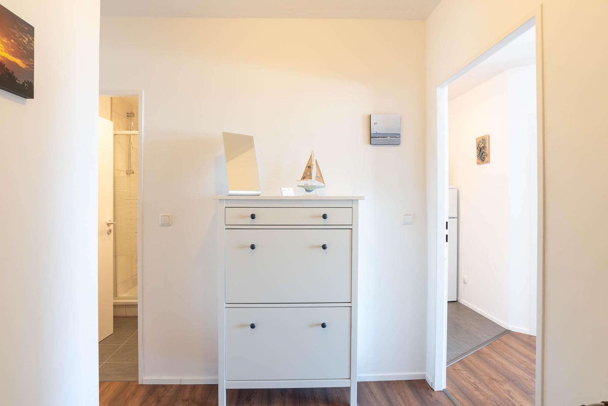 Neben einer kleinen Abstellkammer im Flur, befindet sich in der Ferienwohnung auch noch ein hochwertiges, modernes Badezimmer. Es verfügt neben einer Dusche, einem WC und Waschbecken auch über eine Handtuchheizung. Eine weitere Besonderheit in diesem Badezimmer ist die einsatzbereite Waschmaschine.