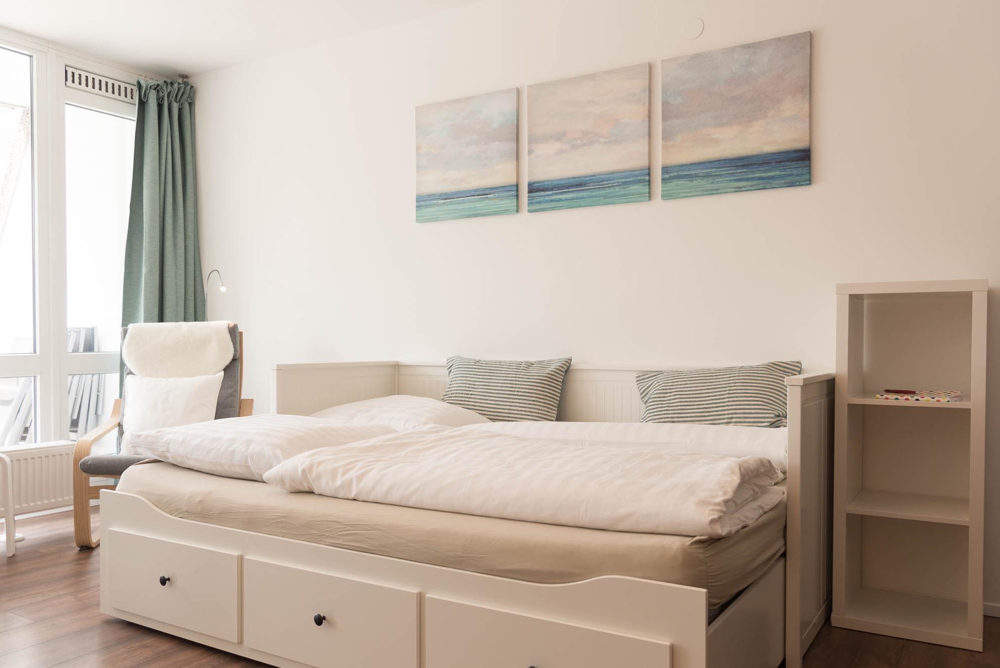 Vom Wohn- und Essbereich gelangen Sie in das Schlafzimmer. Ein halboffenes Regal bietet einen kleinen Sichtschutz auf das gemütliche Bett (Maße 160 x 200 cm) sowie genügend Stauraum für Ihr Gepäck. Auch im Schlafzimmer sind bodentiefe Fenster und Vorhänge vorhanden.