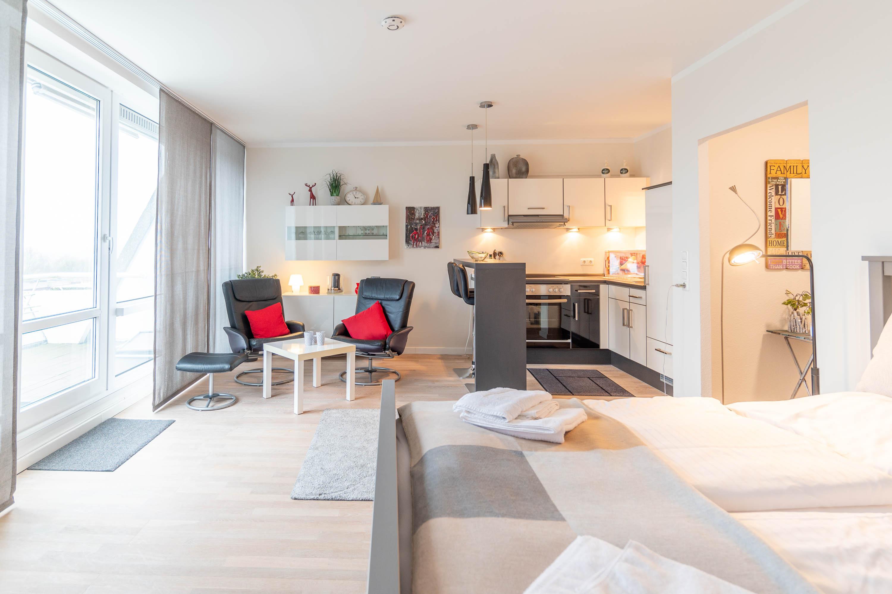 Die bodentiefe Fensterfront sowie der helle Fußboden mit Parkettboden lässt die 1-Zimmer Ferienwohnung erstrahlen. Im gemütlichen Wohnbereich befindet sich zwei Sessel, sowie ein bequemes 180x200m Bett.