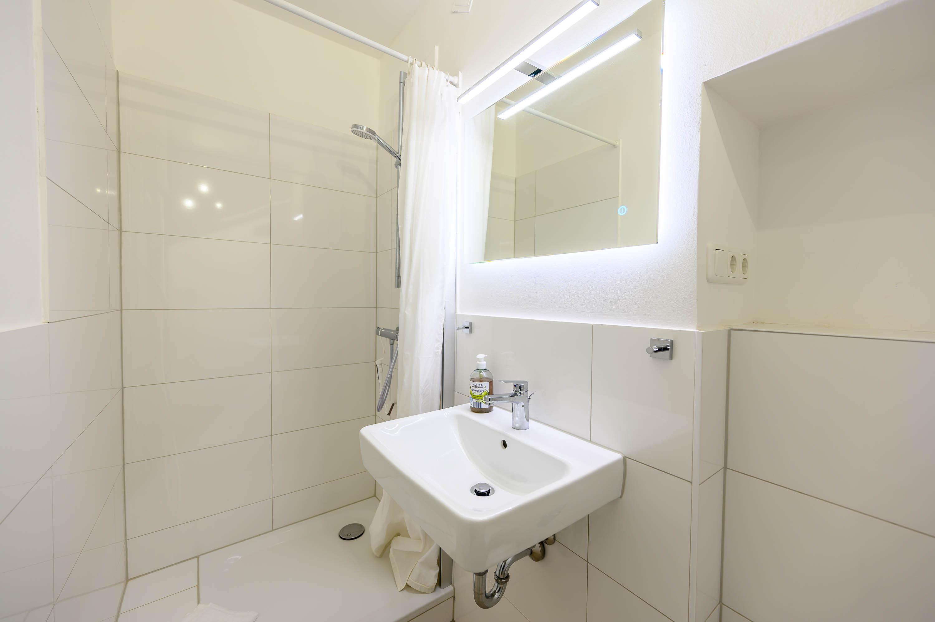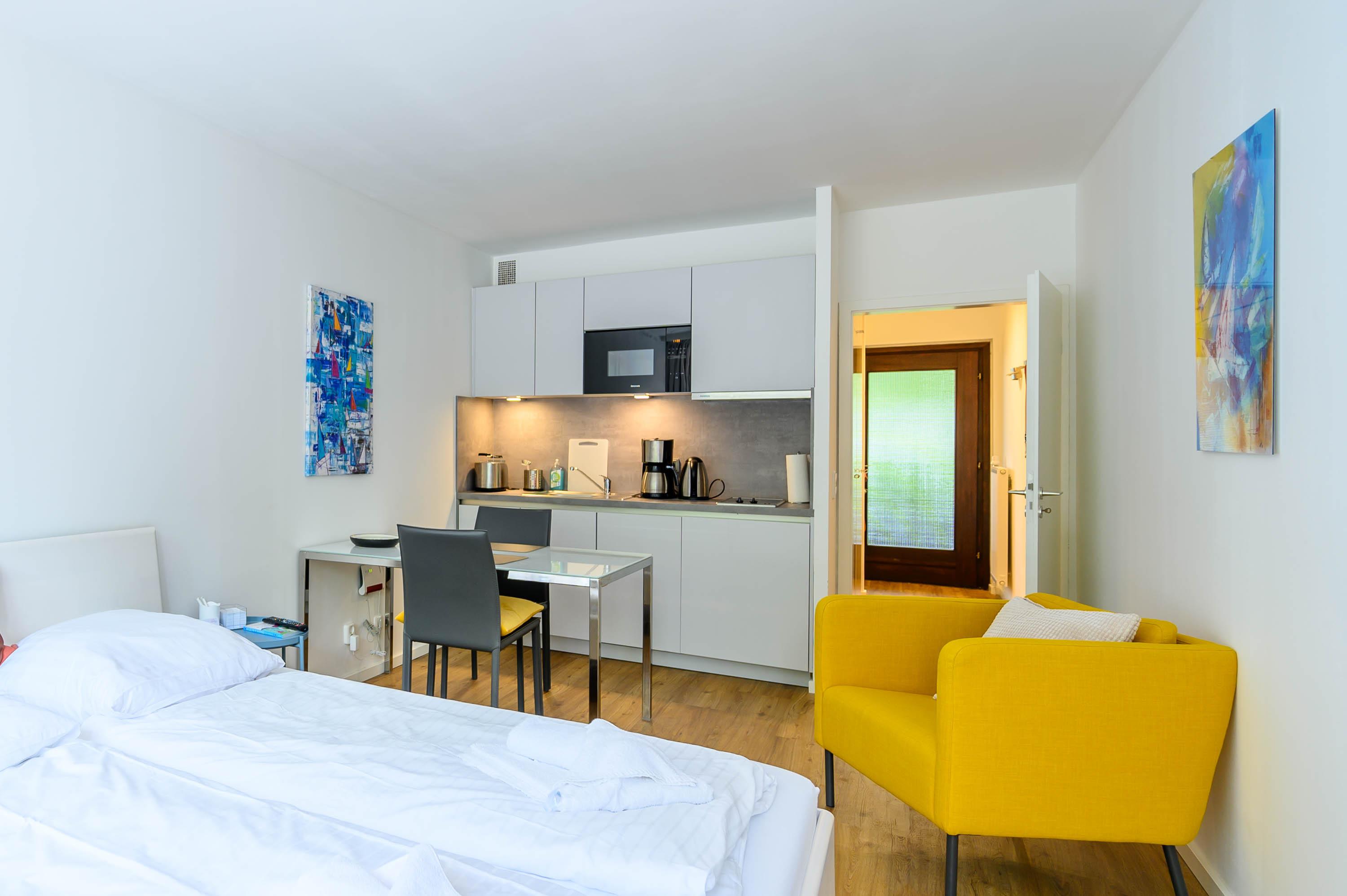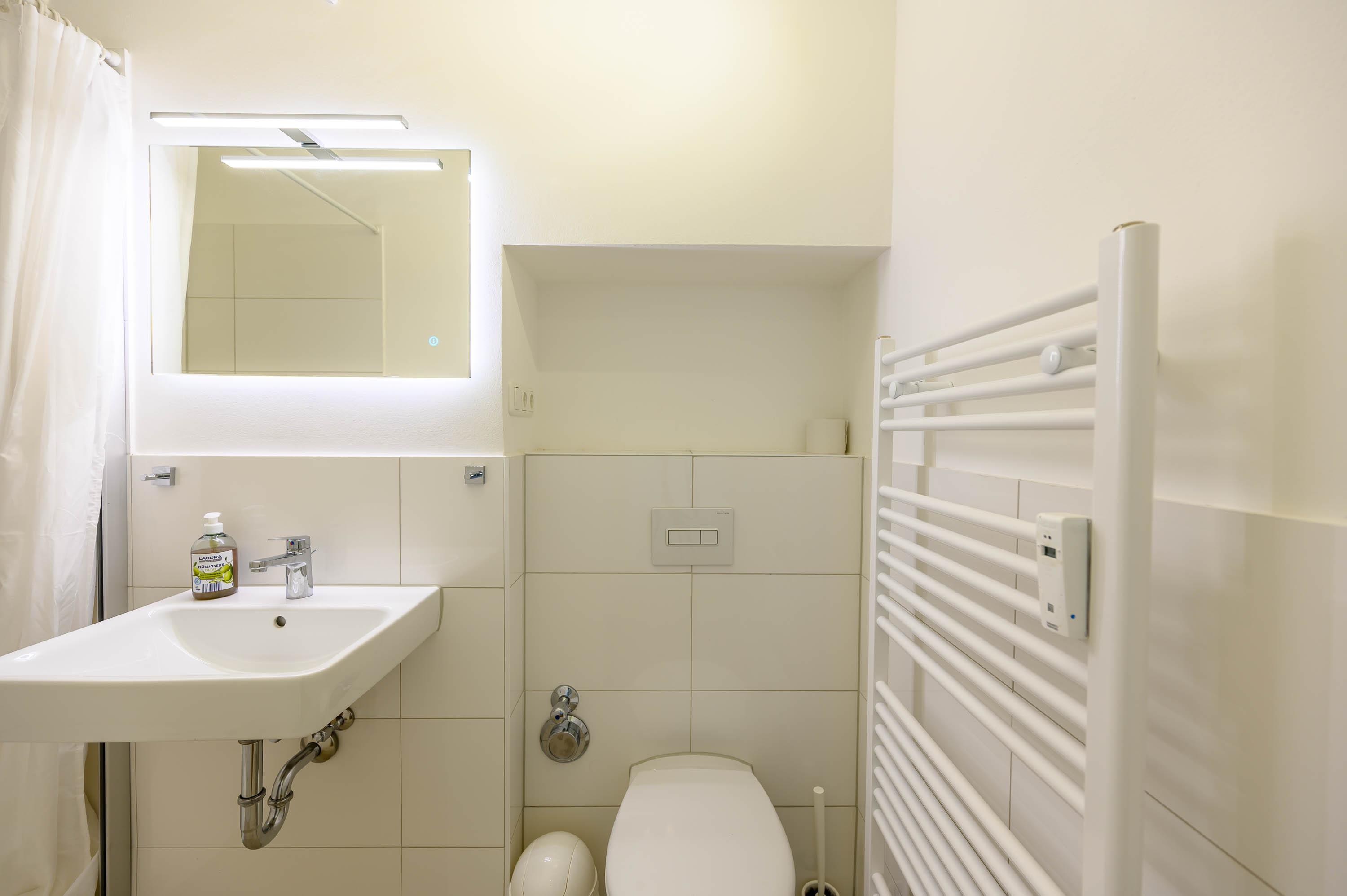 Die 1-Zimmer-Wohnung ist freundlich eingerichtet. Beim Betreten der Wohnung gelangen Sie zuerst in einen kleinen Flur mit Möglichkeiten Ihr Gepäck zu verstauen. Von hier aus erreichen Sie das voll ausgestattete Badezimmer, sowie den Wohn-, Ess-, und Schlafbereich. Das Apartment lässt sich bei Bedarf mit Gardinen abdunkeln. Zum Übernachten steht Ihnen eine Doppelbett (Liegefläche von 180 x 200 cm) zur Verfügung.